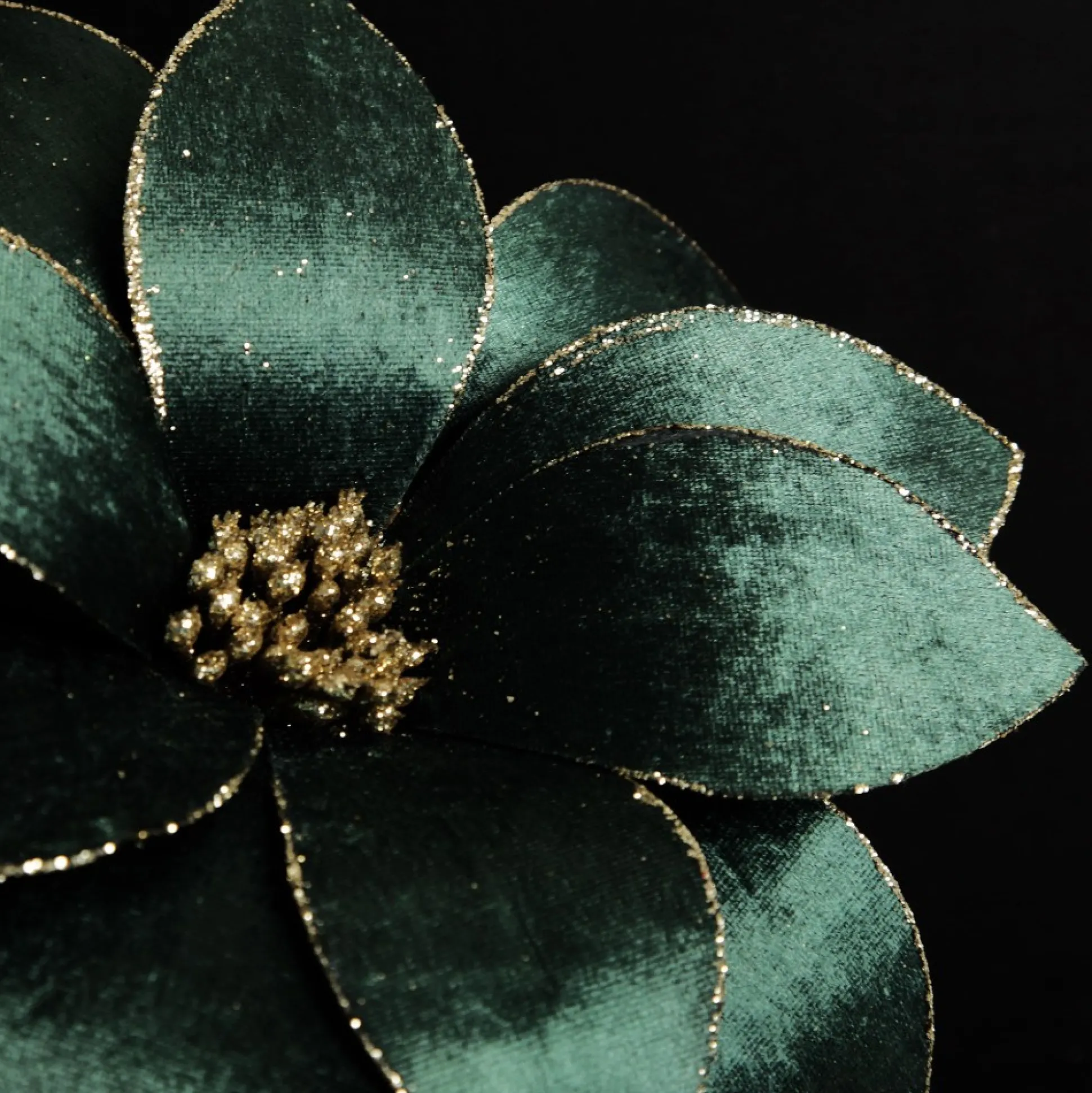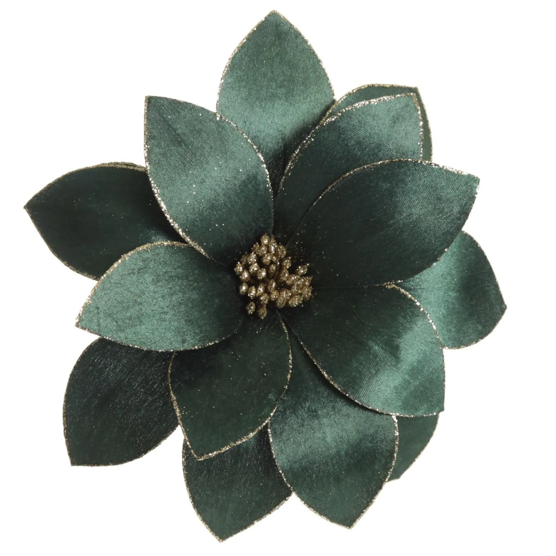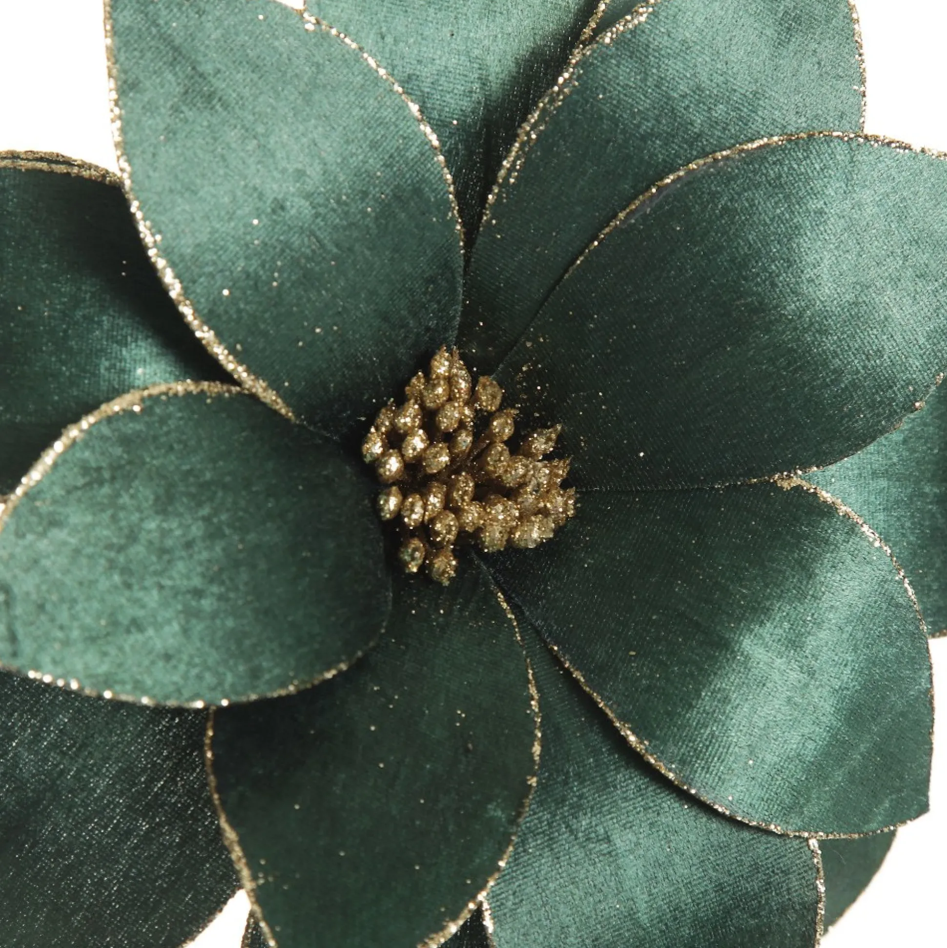 This Lush Bottle Green Velvet Flower Stem With Gold Glitter Trim Will Enhance Your Festive Displays. Featuring A Lush Collection Of Layered Petals With A Satin Finish And Sophisticated Deep Green Tone. Glitter Trim And Pollen Details Add An Element Of Sparkle. A Flexible And Durable Stem Extends From The Base Making It Easy To Place And Arrange When Crafting Decorating. Faux Flowers Are A Versatile And Reusable Decor Element Which Can Be Used For Almost Any Craft Or Decor Project You Choose. Use The Flower To Embellish Your Christmas Tree, Garlands, And Wreaths, Or Combine With Other Foliage And Florals In A Vase To Craft Your Own Unique Floral Arrangement. The Flower Is Perfect For A Harlequin Christmas Decor Theme With Lush Traditional Green, Red, And Gold Tones. Create A Sophisticated Yet Traditional Festive Display In Your Home This Christmas.