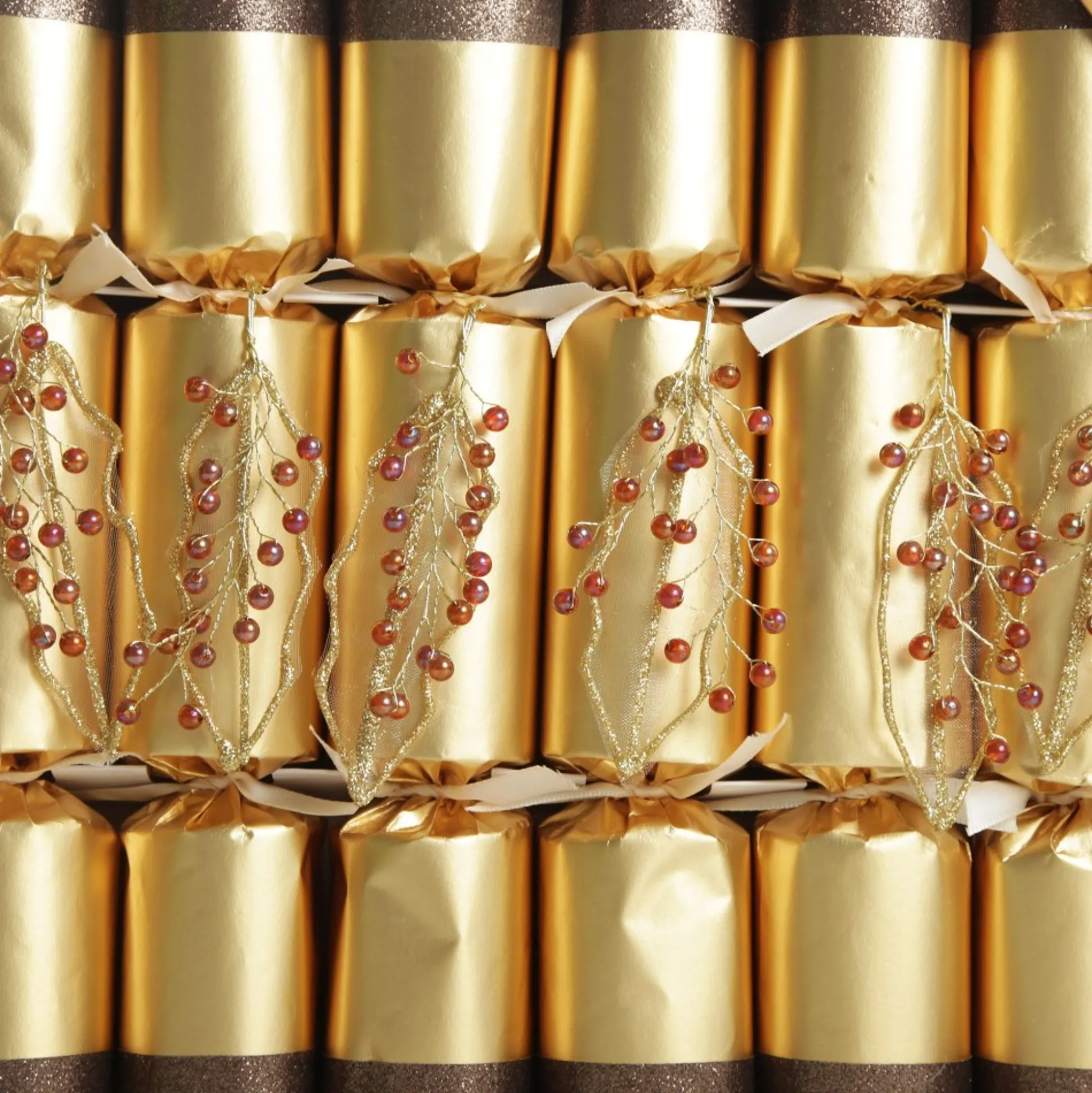 Keep Up Classic Christmas Traditions With These Gold Leaf Sparkle Christmas Bon Bons. The Set Contains 6 Bon Bons Featuring A Lush Gold Finish With Brown Glitter Trim And A Beaded Leaf Embellishment. Each Bon Bon Contains A Novelty Gift To Surprise Your Guests.