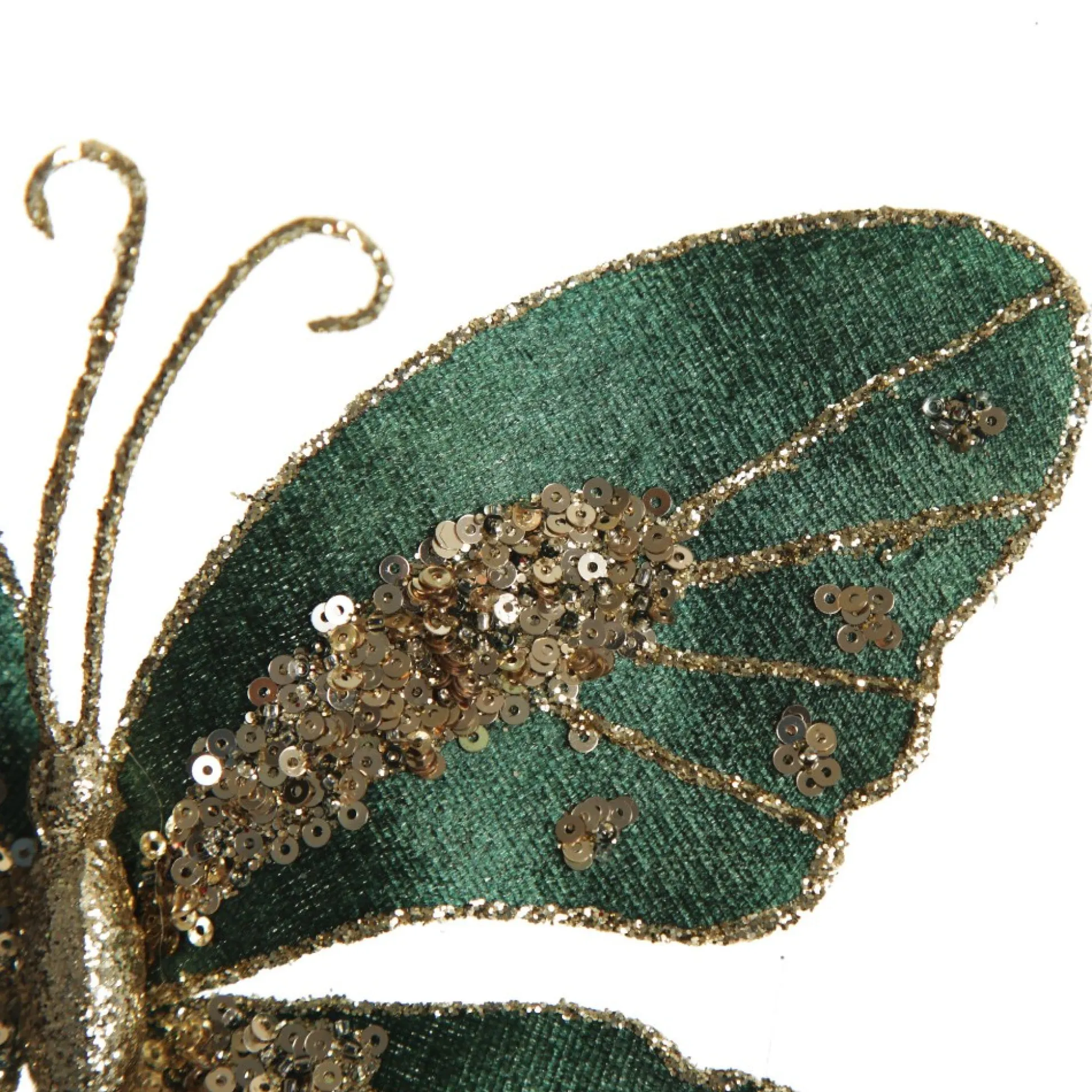Add Elegance And Whimsy To Your Festive Crafts And Decor Using This Green Velour And Glitter Butterfly Clip. Crafted From Lightweight Materials, This Butterfly Features Lush Green Velour Wings Embellished With Champagne Glitter Highlights. The Wings Are Wires For Easy Placement And A Clip Affixed To A Stem On The Back Of The Butterfly Makes It Easy To Secure When Crafting And Decorating. Unique Clip Decorations Are Versatile And Reusable Making The Perfect Addition To Any Festive Craft And Decor Project. Clip This Butterfly Onto Your Christmas Tree, Garlands, Wreaths, Floral Arrangements And More To Create A Unique And Eclectic Display. The Butterfly Could Even Be Used As A Gift Topper Or Embellishment For Table Place Settings At Your Christmas Feasts. This Butterfly Is Perfect For A Unique Pink Christmas Dreams Decor Theme Combining An Assortment Of Pink And Sage Green Tones To Create A Seamless And Sophisticated Display. Stray From The Traditional To Create A Stunning And Unique Display In Your Home.