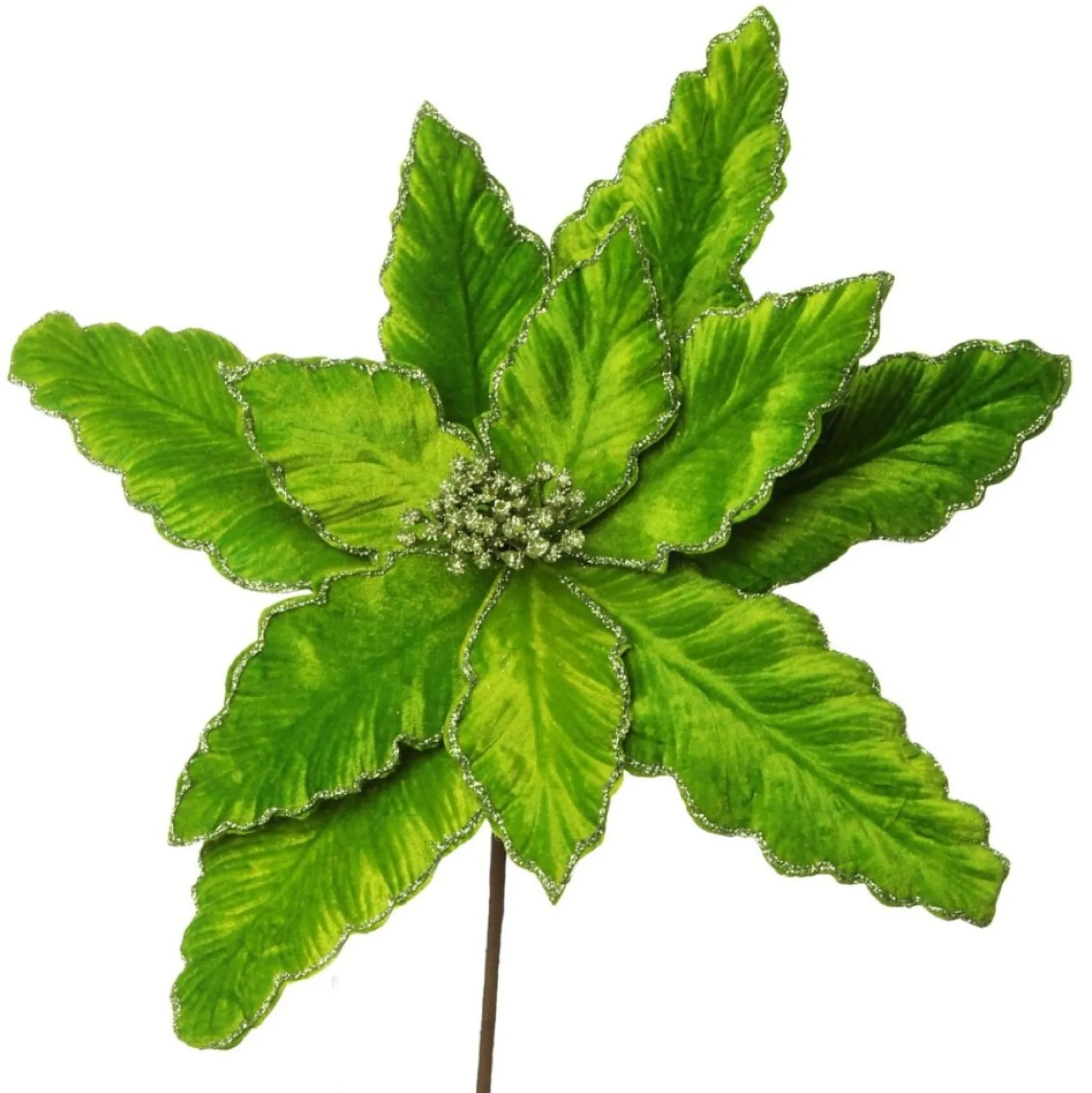 Spread Delightful Christmas Cheer In Your Home With This Vibrant Green Poinsettia Flower Pick With Green Glitter Trim. Crafted With A Flexible And Durable Stem, Ideal For Bending And Arranging However You Desire. This Flower Features A Collection Of Delicate Textured Green Velvet Petals With Green Glitter Trim. Flowers Picks Are A Versatile Item That Can Be Used For All Your Craft And Decor Purposes. Use To Embellish Your Christmas Tree Or Use It To Create Your Very Own Christmas Floral Arrangement. Combine With Other Flowers And Glittered Sprays To Create A Unique Display Like No Other. Flower Picks Can Also Be Used To Create Custom Wreaths, Garlands, Or Tree Toppers. This Flower Is Perfect For A Traditional Christmas Theme Paired With Red, Green, Gold, And Silver Tones. Create An Impressive Display To Welcome Your Guests And Celebrate This Wonderful Holiday.