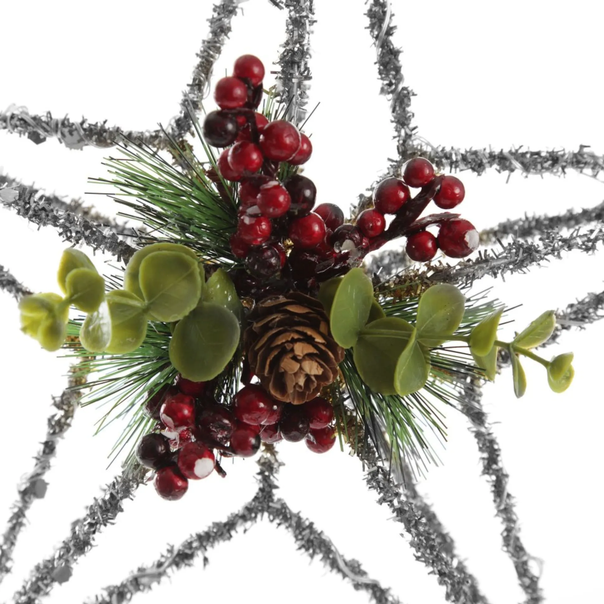 Illuminate Your Christmas Tree Display With Our Lightup Silver Tinsel Wire 3D Star Tree Topper With Cone And Berry. Crafted With A Durable Wire Base, This Tree Topper Features A Star Design With Sleek And Sparkling Silver Tinsel, Green Foliage, Red Berries, And A Pinecone In The Centre. Seed Lights Illuminate The Tree Topper For An Extra Magical Effect.