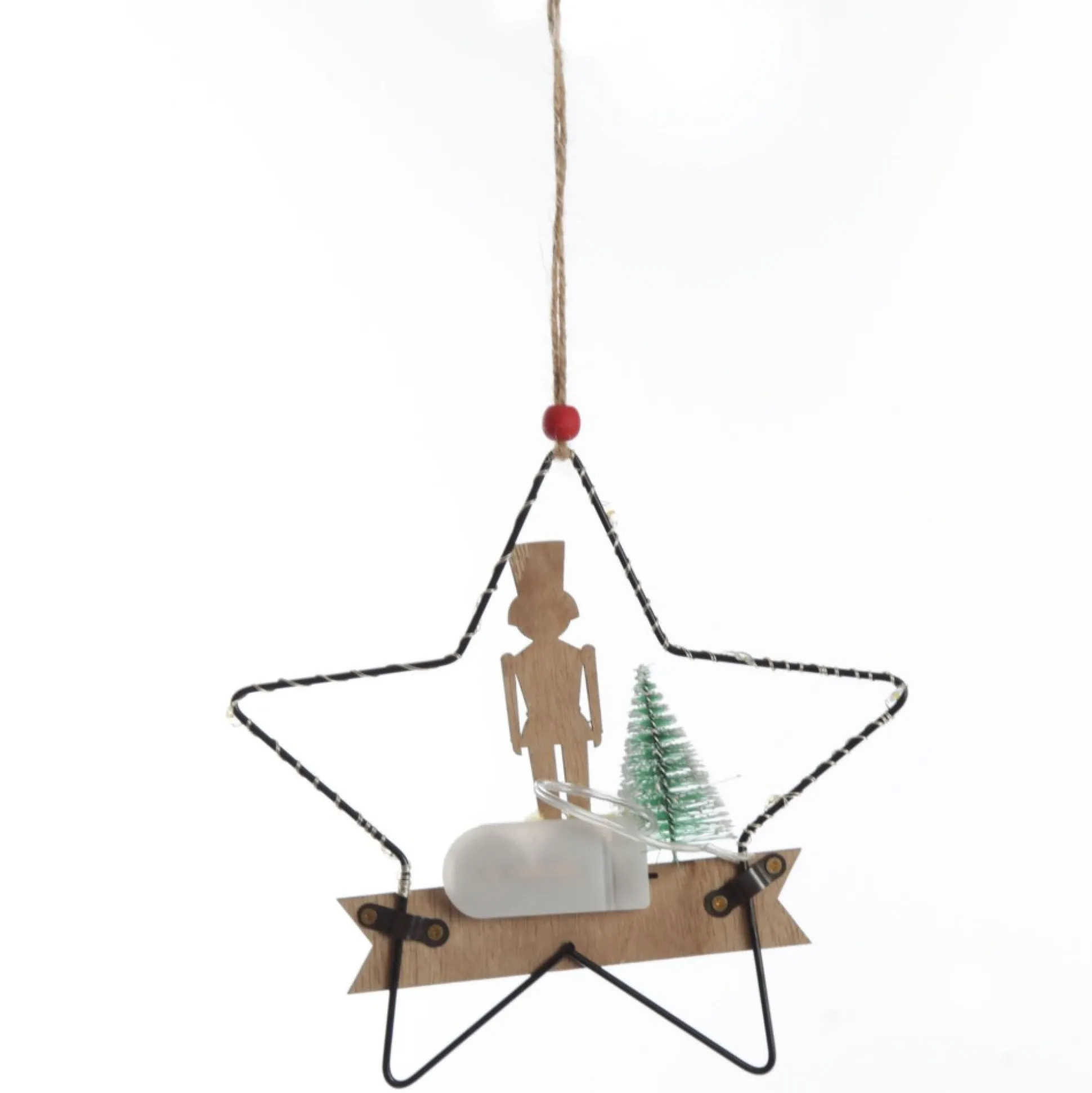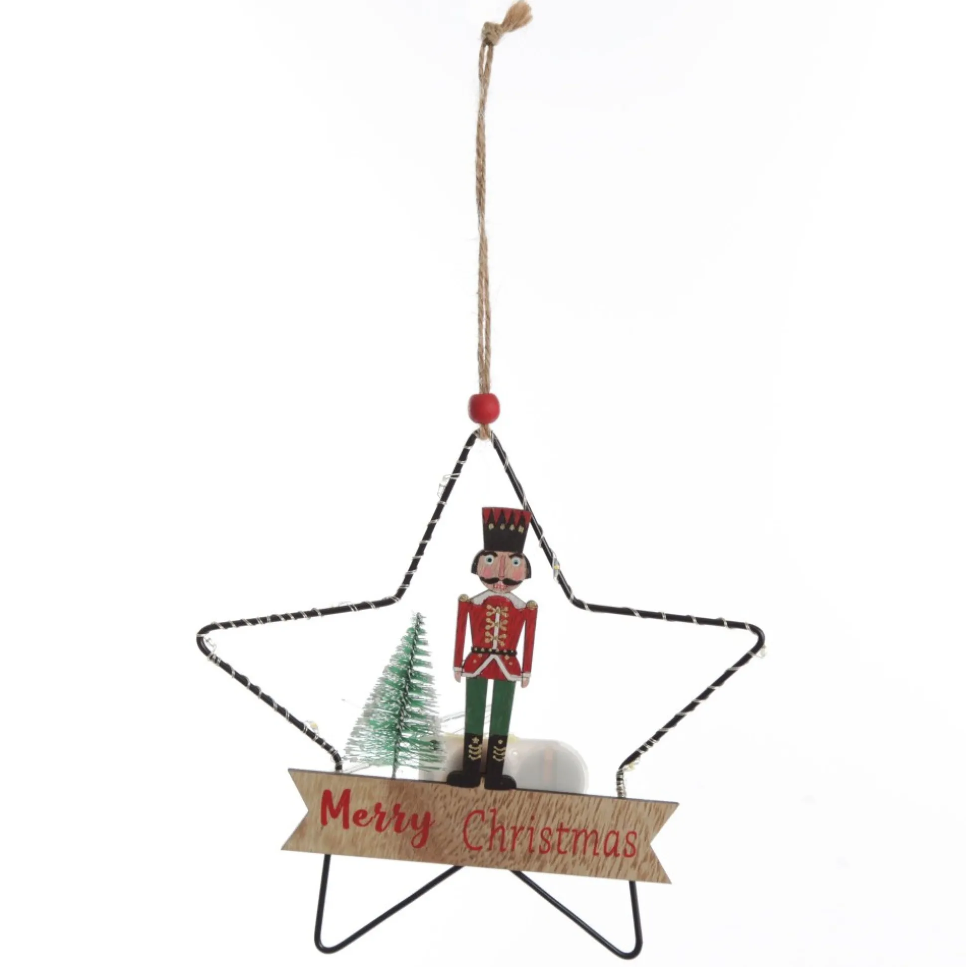 Add Traditional Christmas Charm To Your Tree With Our Lightup Wire Star Hanging Christmas Ornament With Nutcracker Guard. A Wire Star-Shaped Frame Is Adorned With A Wooden Cut-Out Of A Nutcracker Guard, A Merry Christmas Message, And A Small Wire Tree Embellishment. The Star Frame Features Wrapped Seed Lights That Illuminate The Ornament For An Exciting Display. Lights Are Battery Operated. Batteries Are Included.