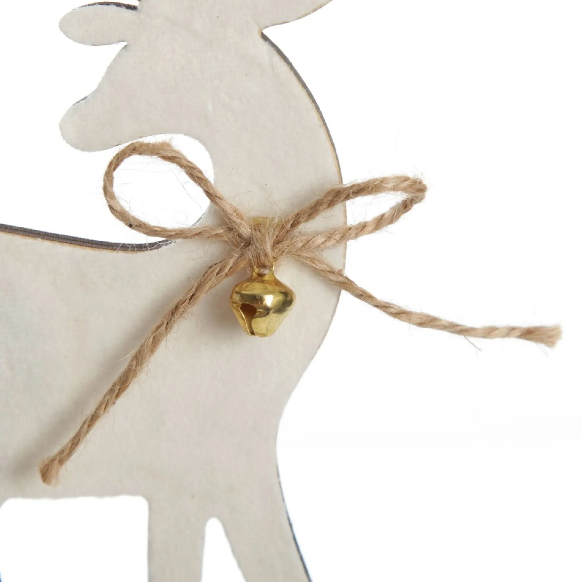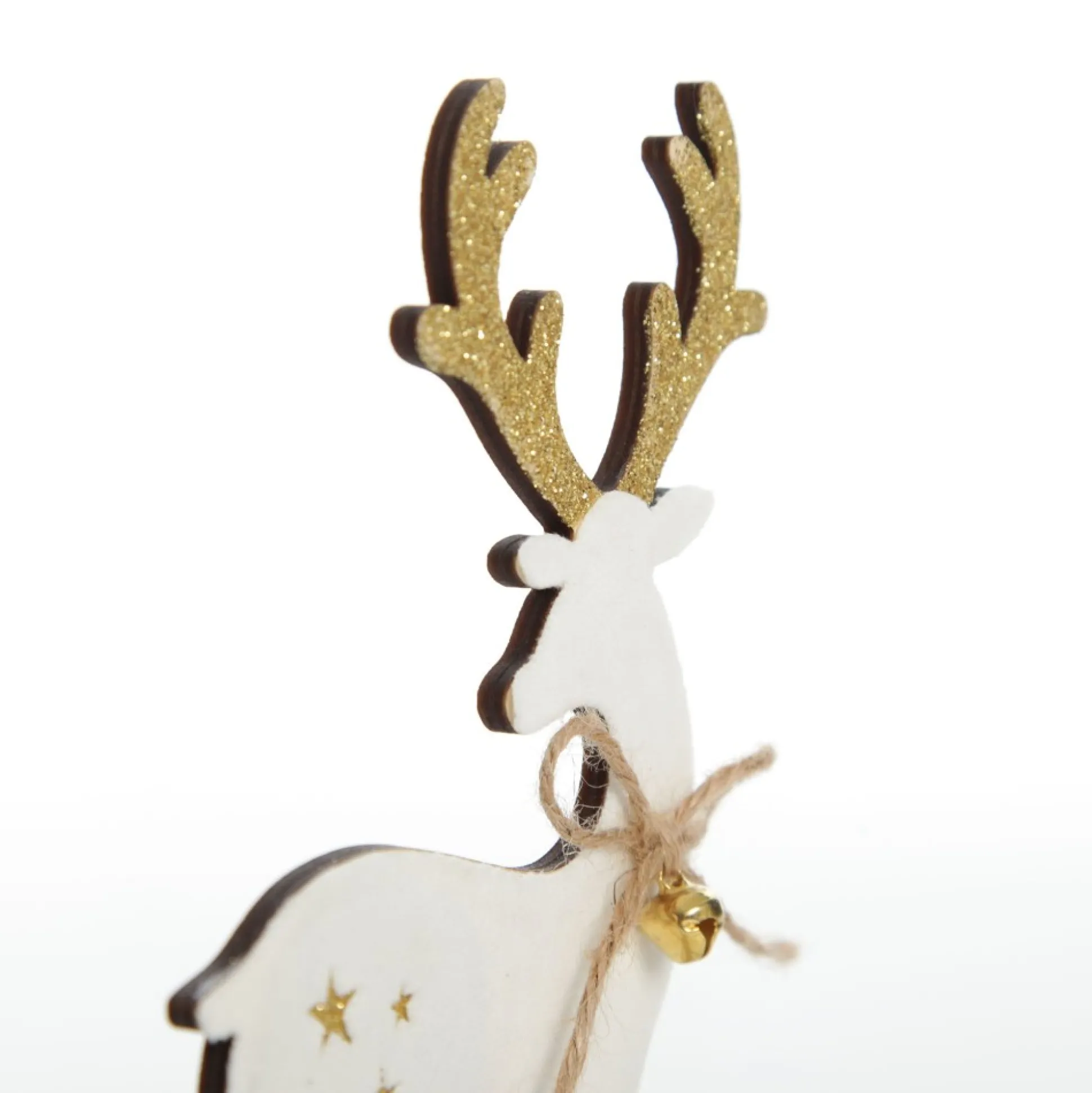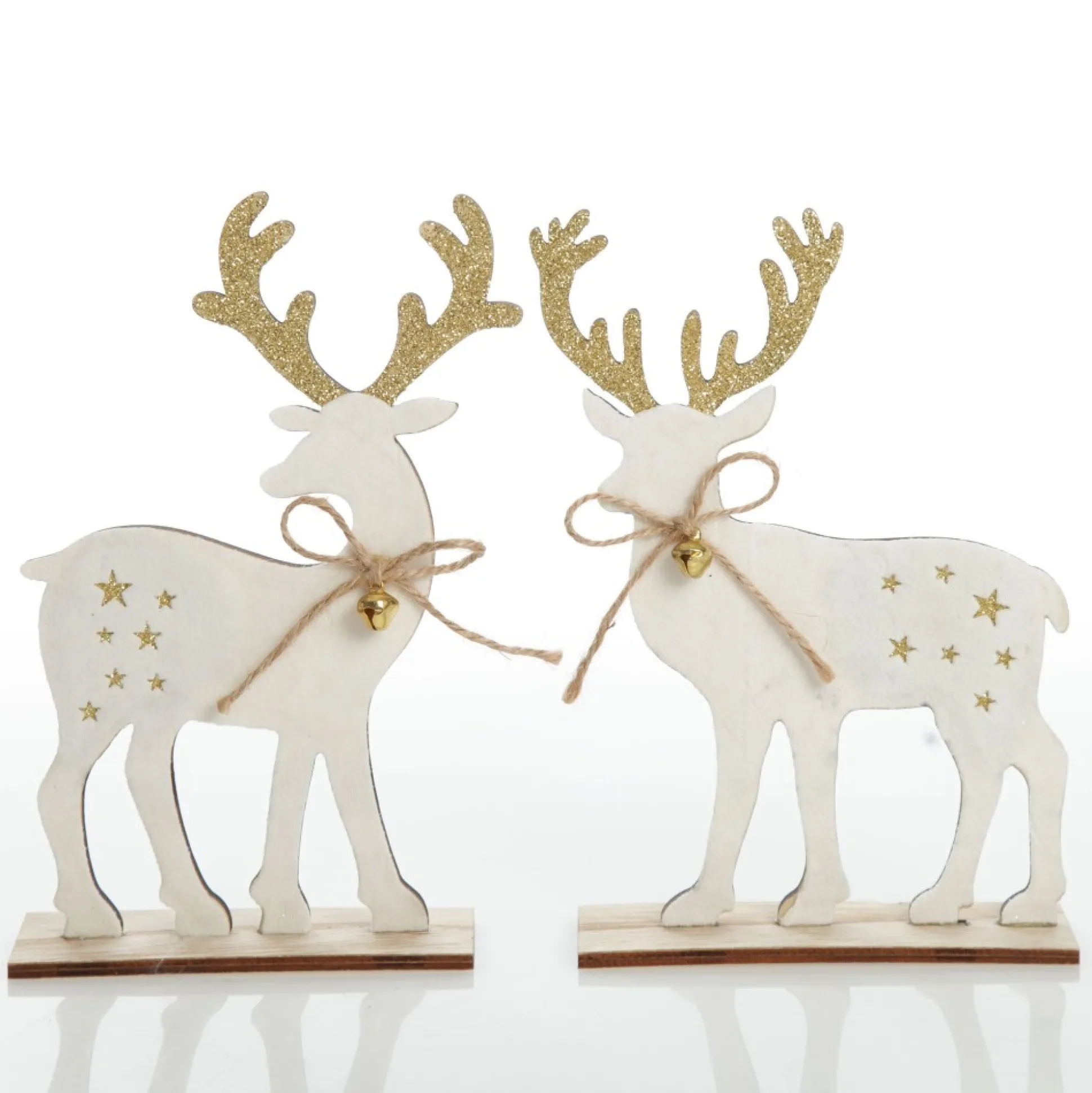 Bring Minimalistic Festive Charm To Your Home With Our Medium White Wood Deers With Gold Glitter Ornaments -Set Of 2. This Set Consists Of Two Wooden Deer Cut-Outs With A White Felt-Like Finish, Featuring Delightful Gold Glitter Stars And Antlers, A Jute String Bow, And Gold Bell Embellishments. A Simplistic Yet Elegant Design That Exudes Subtle Festive Charm. Create Delightful Festive Vignettes With These Gorgeous Deer Ornaments. Use To Adorn Bookshelves, Coffee Tables, Mantels And More As Part Of A Centrepiece Or Display Alone As A Subtle Touch Of Festive Charm. The Subtle Colours And Design Make These Wooden Deer Perfect For Almost Any Decor Theme You Choose.