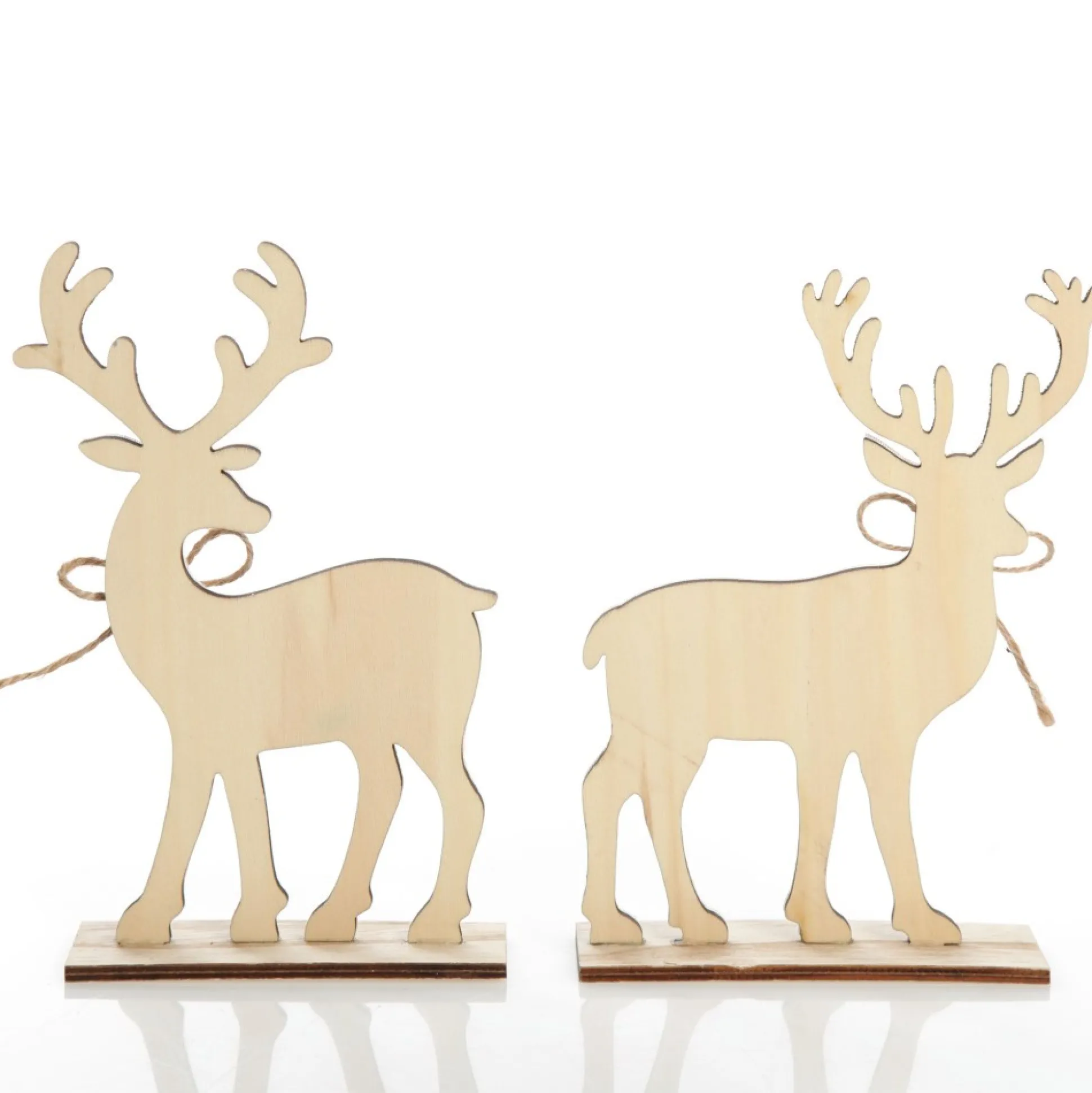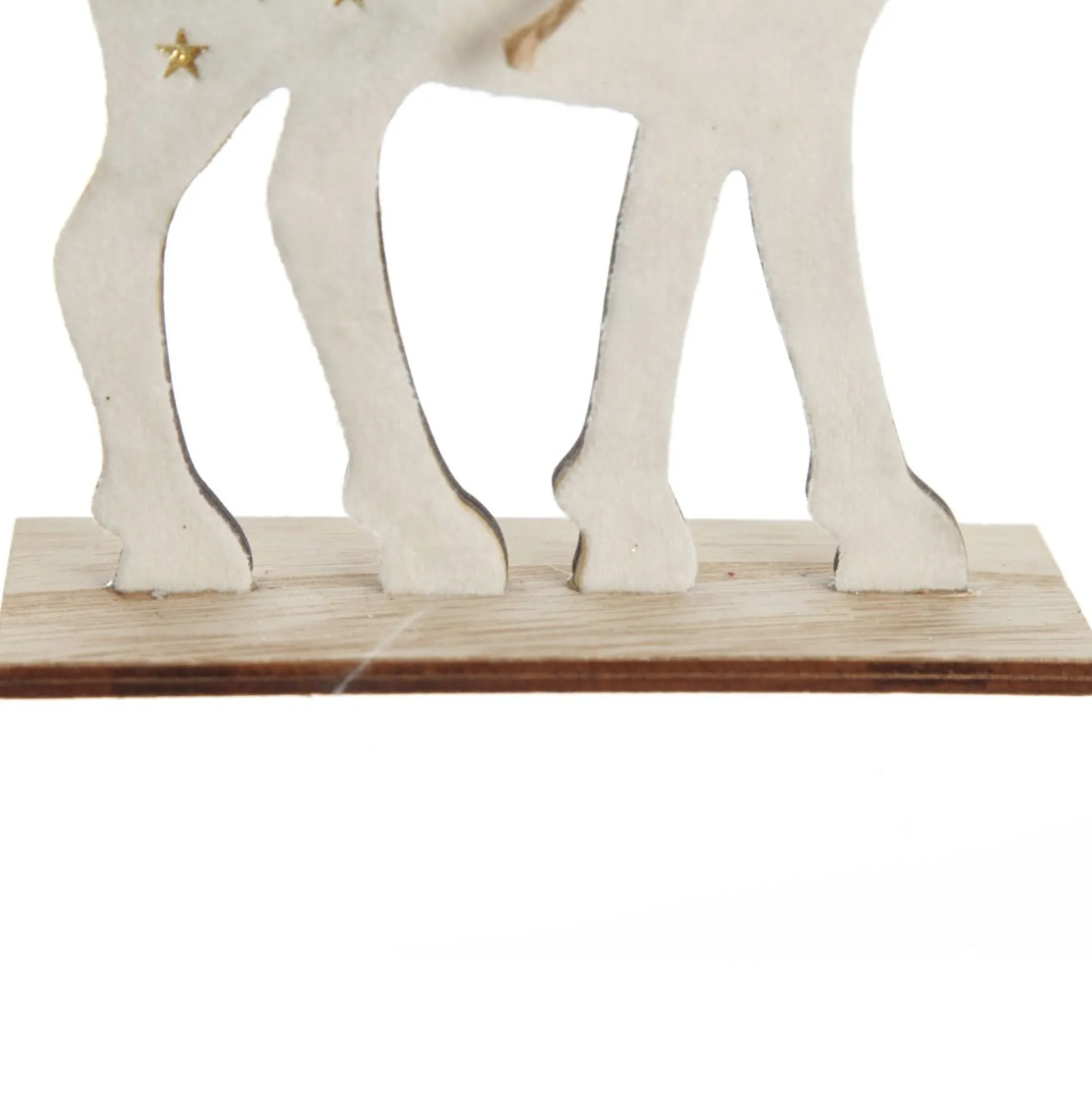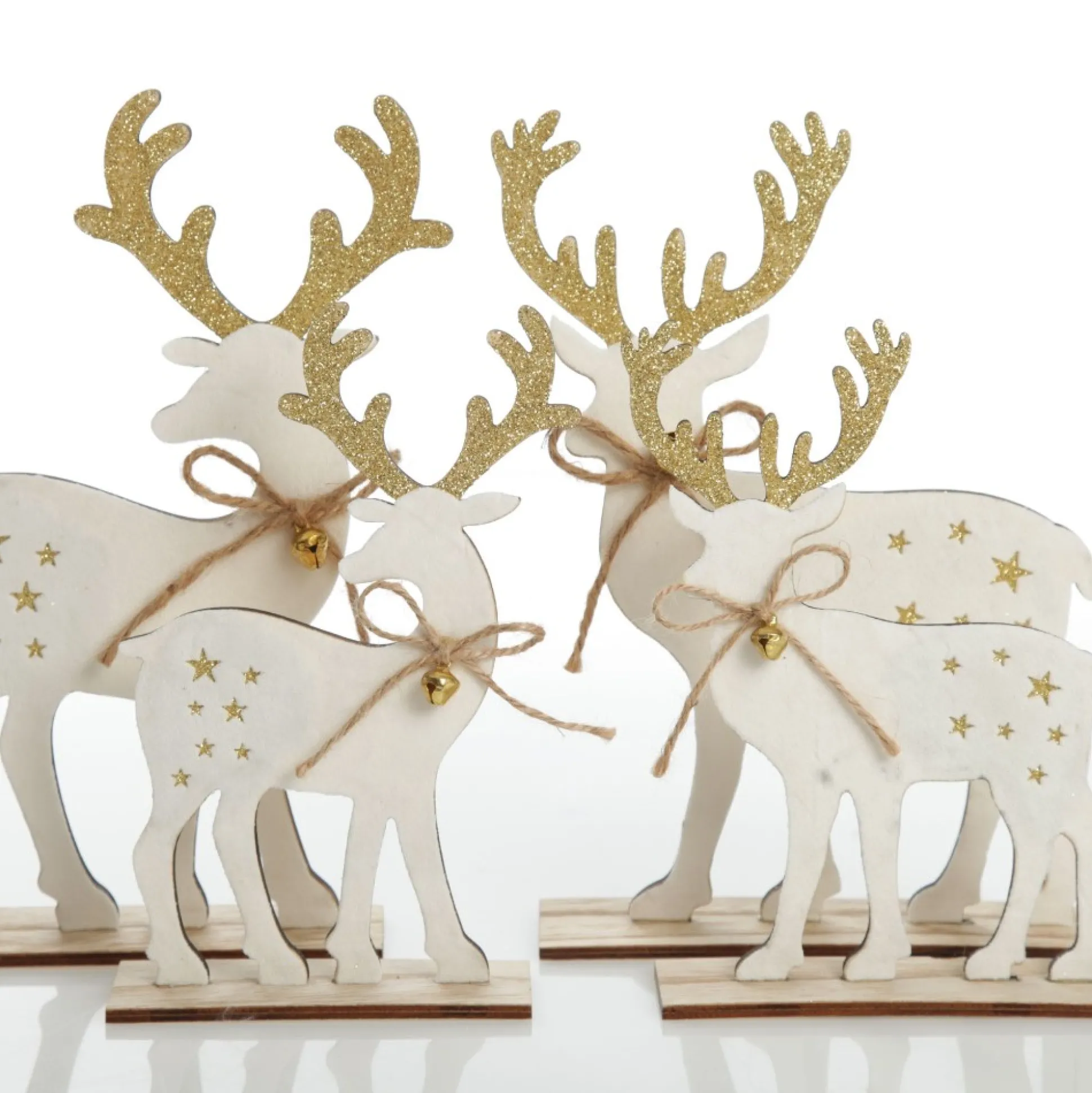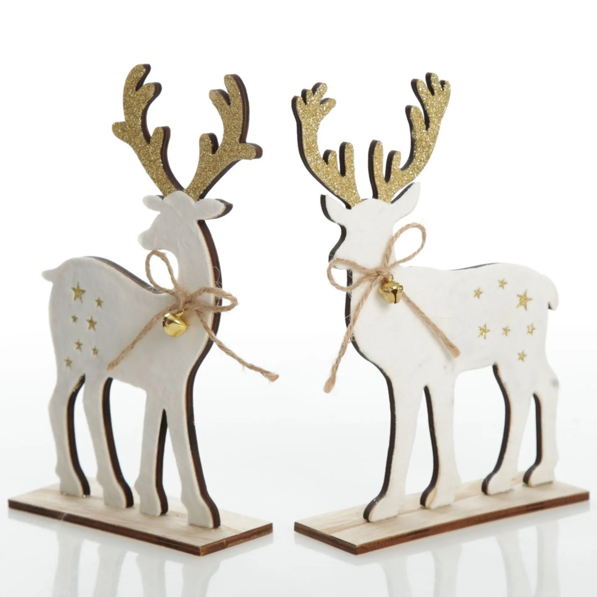 Bring Minimalistic Festive Charm To Your Home With Our Medium White Wood Deers With Gold Glitter Ornaments -Set Of 2. This Set Consists Of Two Wooden Deer Cut-Outs With A White Felt-Like Finish, Featuring Delightful Gold Glitter Stars And Antlers, A Jute String Bow, And Gold Bell Embellishments. A Simplistic Yet Elegant Design That Exudes Subtle Festive Charm. Create Delightful Festive Vignettes With These Gorgeous Deer Ornaments. Use To Adorn Bookshelves, Coffee Tables, Mantels And More As Part Of A Centrepiece Or Display Alone As A Subtle Touch Of Festive Charm. The Subtle Colours And Design Make These Wooden Deer Perfect For Almost Any Decor Theme You Choose.