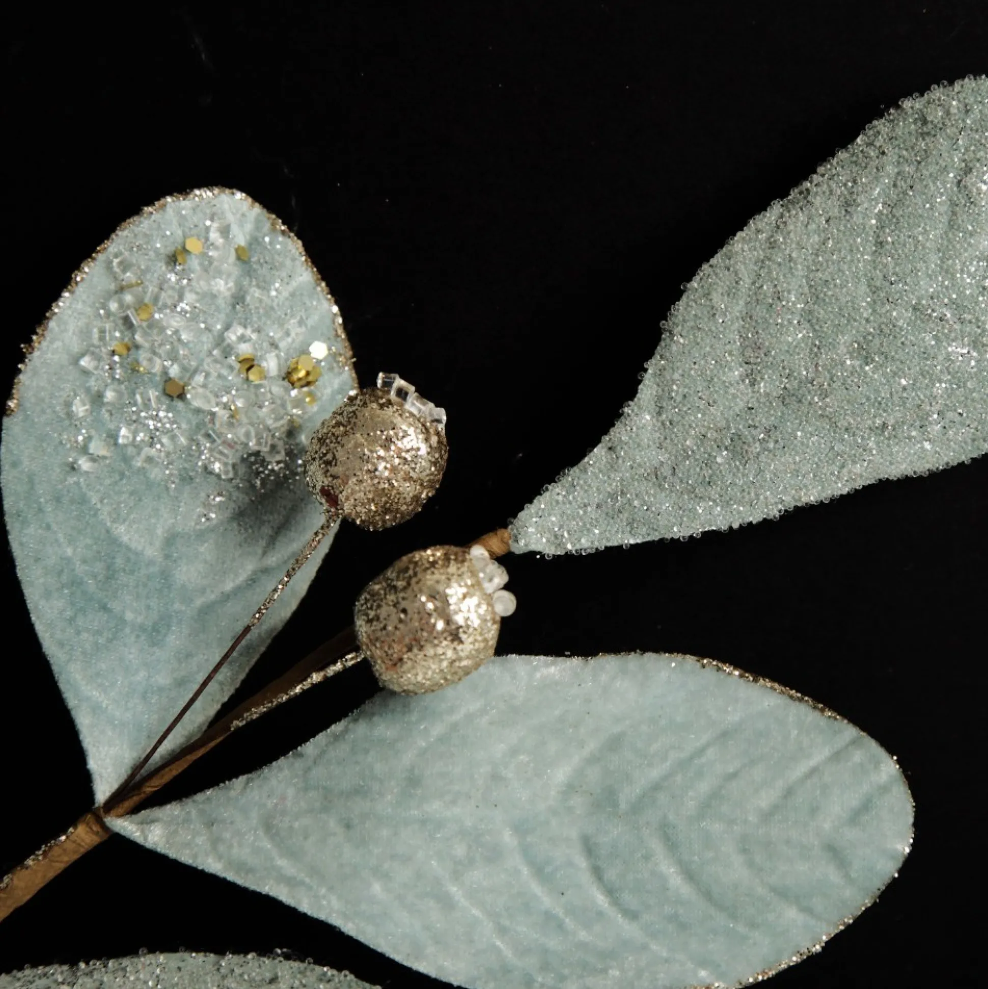 This Unique Pale Blue Mixed Leaf Christmas Spray With Beads Will Enhance Your Festive Floral Arrangements. Featuring A Collection Of Baby Blue Leaves With A Velour Finish And Textured Details.