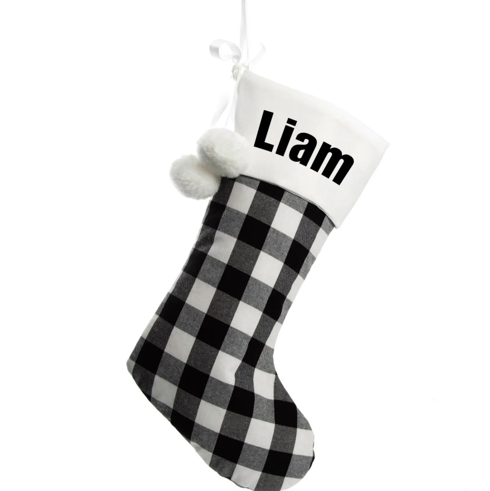 This Stocking Is Crafted From Gorgeous White And Black Buffalo Check Fabric With A Durable White Cuff With Fun White Pom Poms Attached To A Ribbon. The Cuff Can Be Personalised With The Name Of Your Choice. Simply Choose A Text Style And Colour To Create Your Own Unique Christmas Keepsake. Price Includes Personalisation. Custom Stockings Are Thoughtful Gifts For Loved Ones And Are Also The Perfect Way To Adorn Your Home To Create A Cosy, Festive And Personalised Display.
