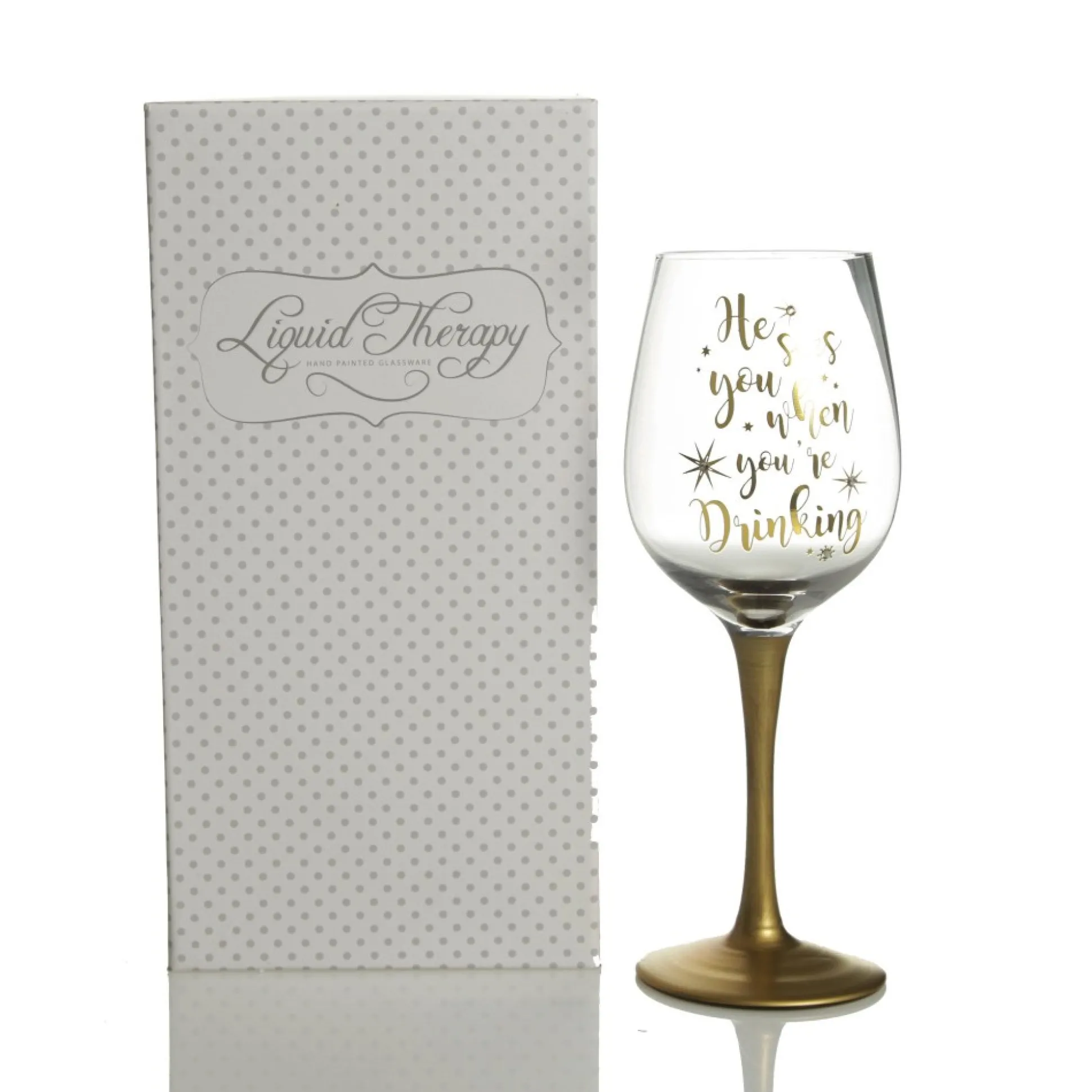 This Chic Personalised Wine Glass Features A Beautiful Gold Stem And Base With Cursive Gold Foil Print Which Reads ‘He Sees You When You’Re Drinking’. It Holds Approximately 430Ml Of Your Favourite Naughty Drink And Is Personalised With Glitter Calligraphy On The Stem Base. Your Personalised ‘He Sees You When You’Re Drinking’ Wine Glass Also Comes With A Stylish Satin Lined Gift Box, Perfect To Give To A Family Member Or Friend This Christmas. Holds 450Ml