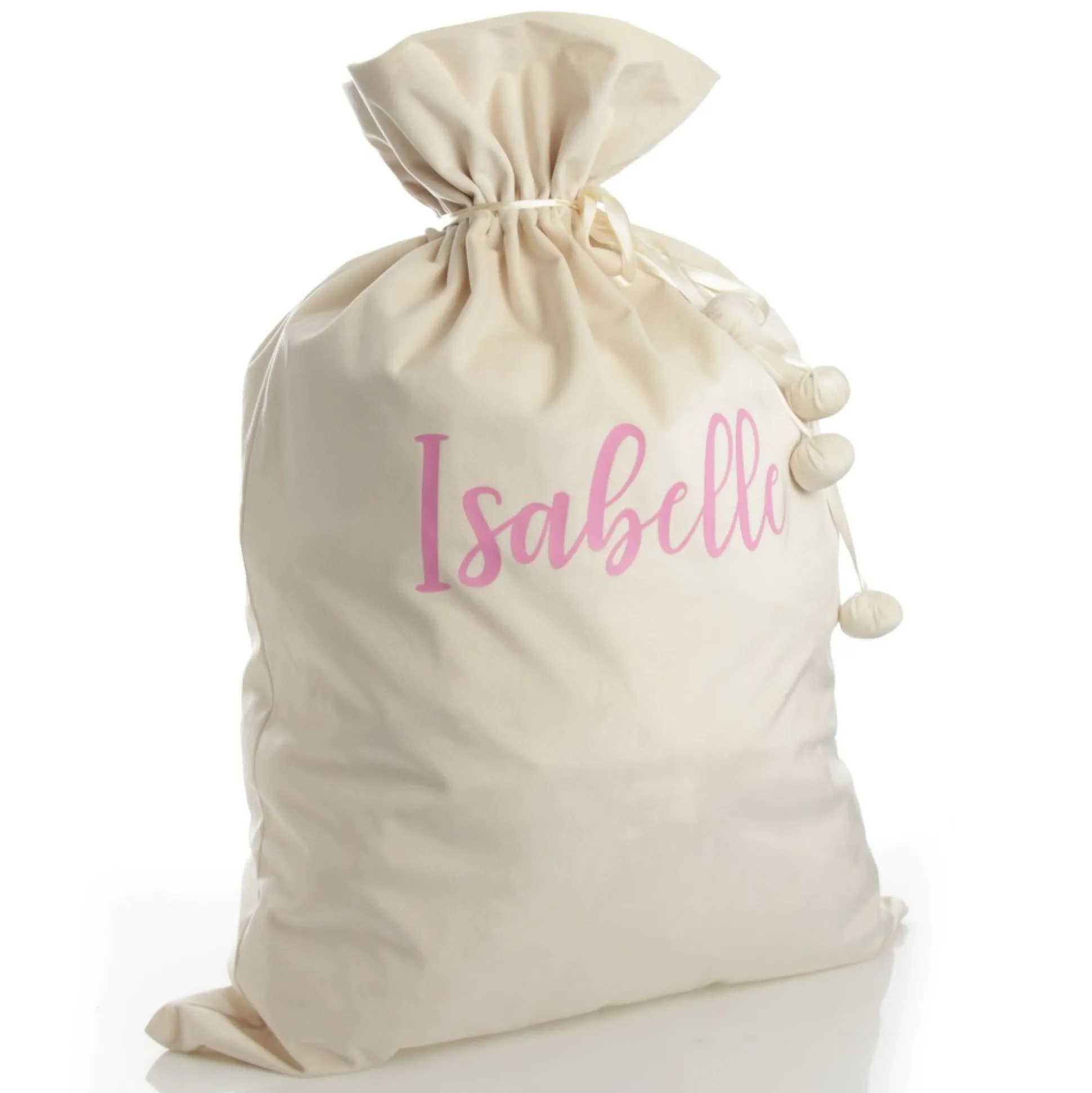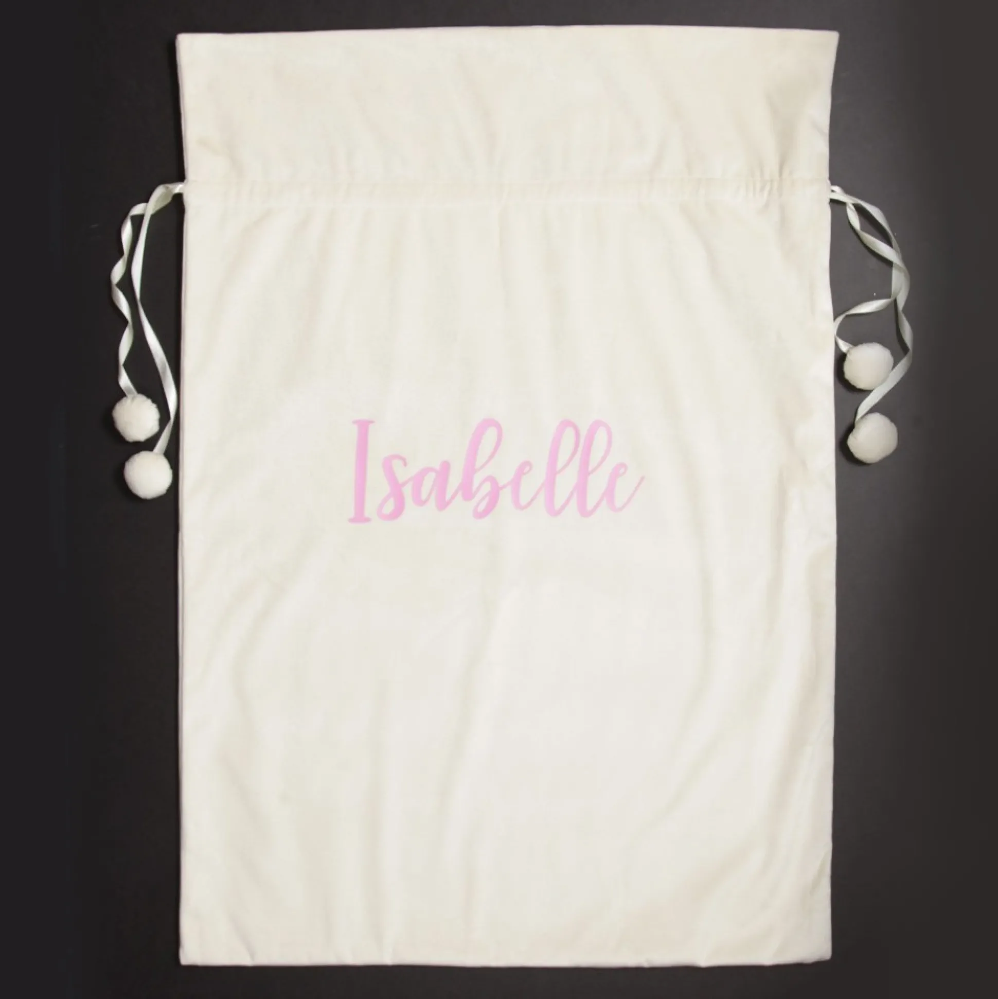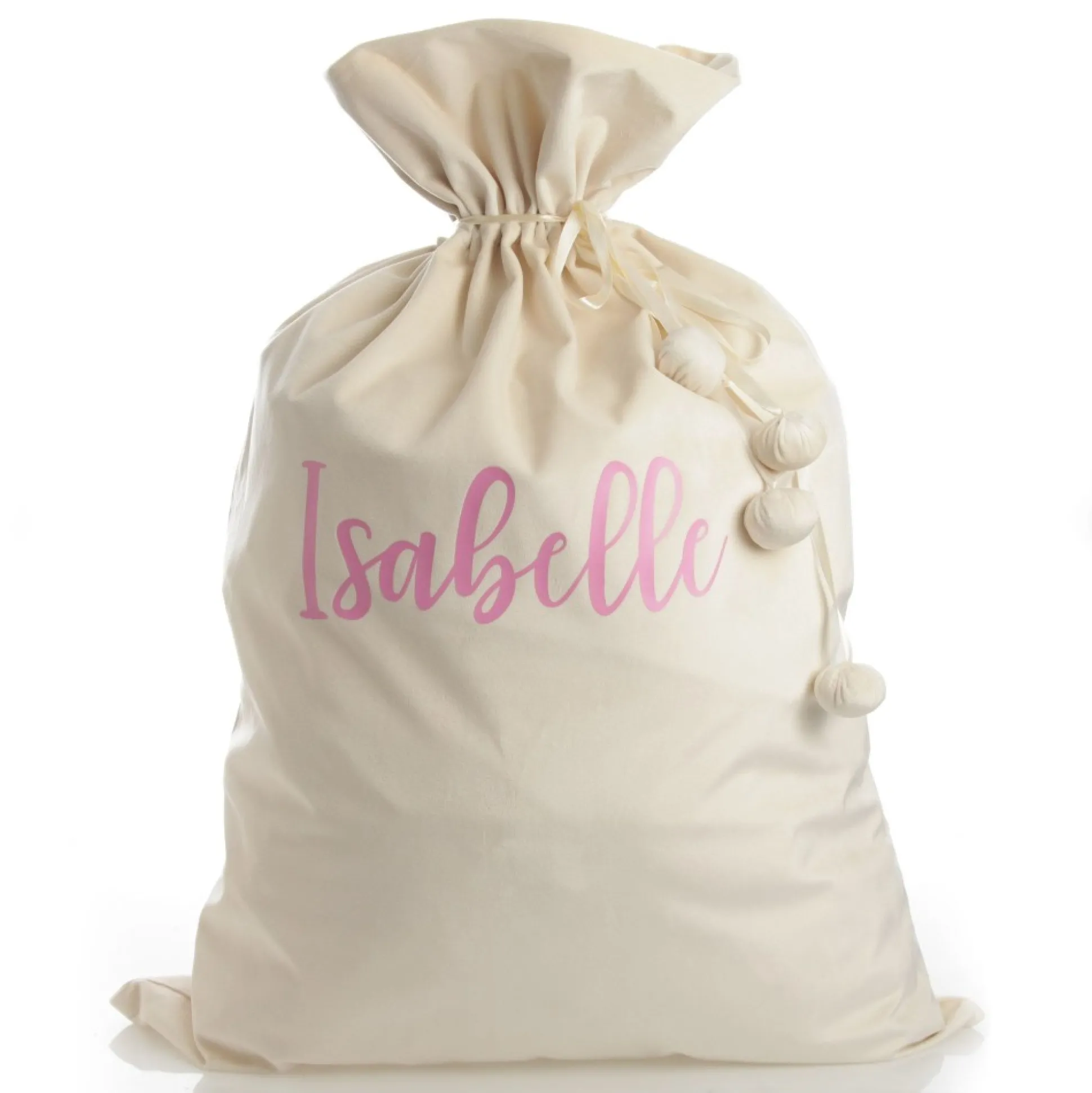 Our Personalised Ivory Velvet Santa Sack Is The Perfect Festive Keepsake For Your Loved Ones. Crafted From Stunning, Soft, Ivory Velvet With A Satin Tie And Pom Pom Details, This Santa Sack Is Personalised With The Name Of Your Choice With Heat Transfer Vinyl In A Delightful Cursive Script. Add A Name And Choose A Personalisation Colour To Create A One-Of-A-Kind Christmas Keepsake.