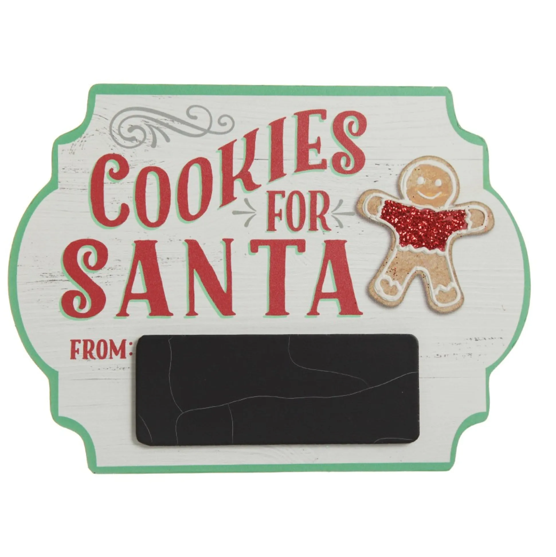 This Sign Has A Rustic White Wood Finish And Features ‘Cookies For Santa’ And An Adorable Gingerbread Character. The Sign Can Be Personalised With The Names Of Your Choice To Let Santa Know Who Left The Cookies Out For Him. Names Are Hand-Written In Glitter Calligraphy. Add Your Names And Choose A Glitter Colour To Create A Unique And Personalised Display.