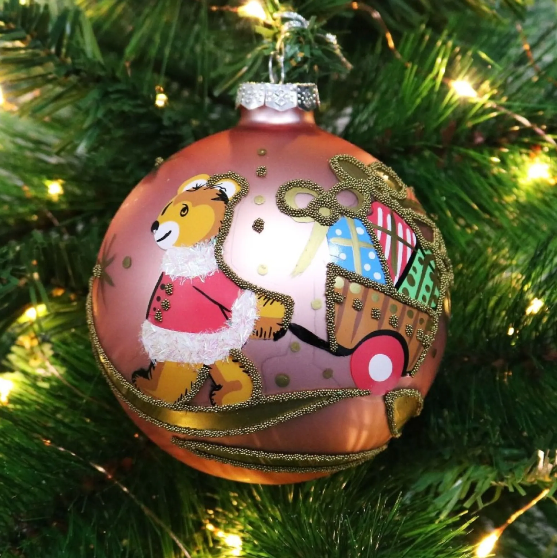 Create Unique And Memorable Keepsakes This Christmas With This Pink Christmas Bear With Cart Bauble. Crafted From Seamless, High Quality Coloured Pink Glass With A Matt Finish, This Bauble Features A Delightful Christmas Bear Design With Glitter Embellishments. It Also Has A Metal Top And Metallic String, Ready To Hang On Your Tree. Bauble Can Be Personalised With A Name Of Your Choice In Our Unique Style Of Glitter Calligraphy.