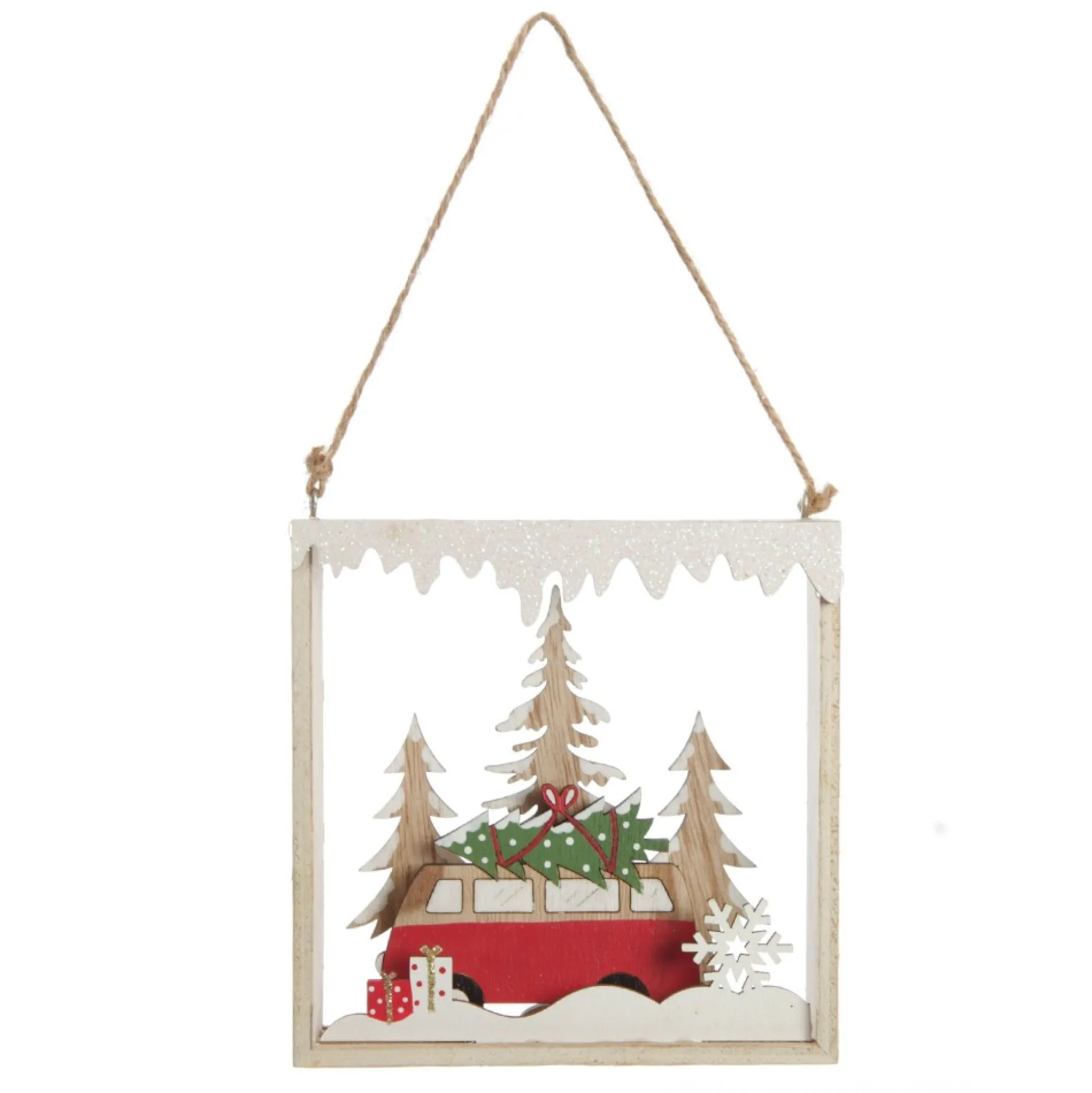 Create A Unique Rustic Christmas Display With This Plywood Winter Combi Christmas Scene Hanging Tree Decoration. Crafted With Lightweight And Durable Plywood, This Decoration Features A Delightful Cut-Out Winter Scene With A Red Combi Van Carrying A Christmas Tree And Glitter Highlights.