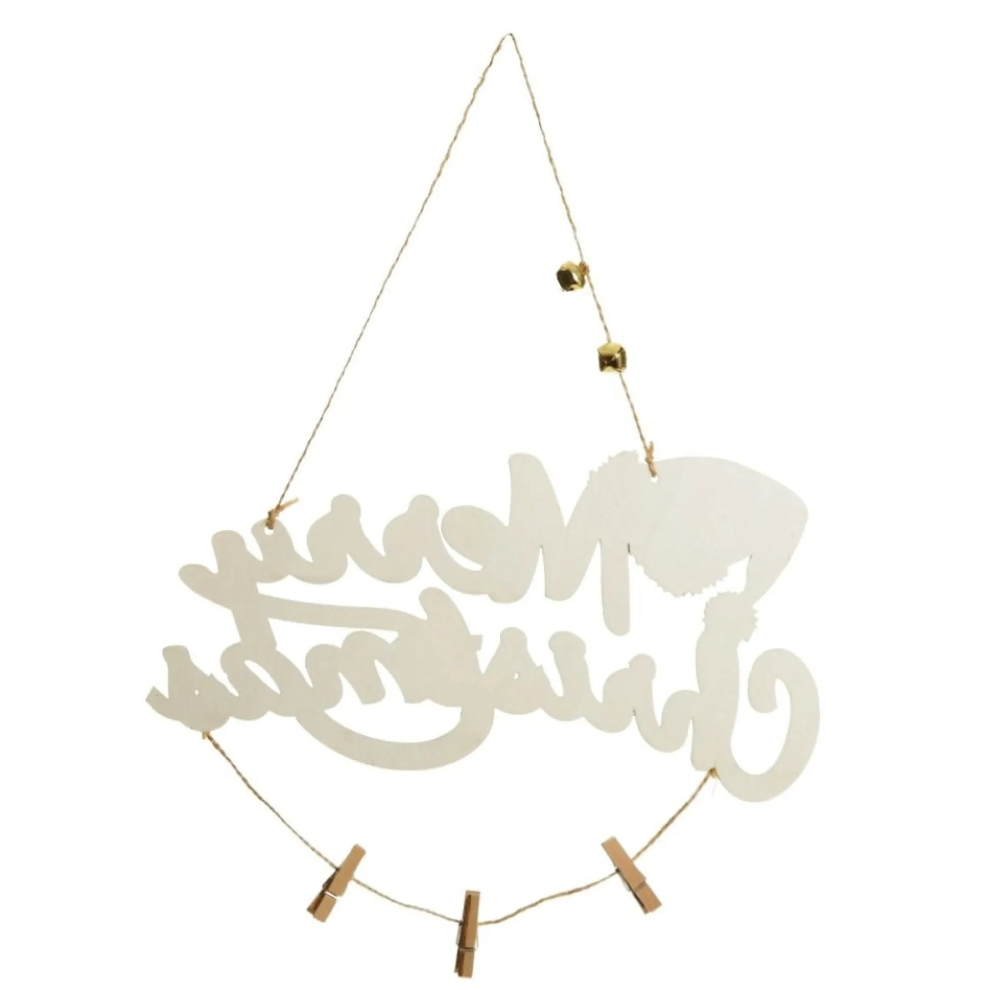 Crafted From Durable And Lightweight Wood With A Smooth Finish, This Plaque Features ‘Merry Christmas’ In A Cursive Script Cut Intricately From The Wood And Finished With Red And White Paint. A Santa Hat Sits Atop The ‘M’, A Jute String With Wooden Pegs Hangs Below, And A Jute String With Bells Provides An Easy Way To Hang This Plaque On Your Wall. Clip Family Photos Or Cute Lightweight Ornaments To The Pegs To Add Personalise Your Display.