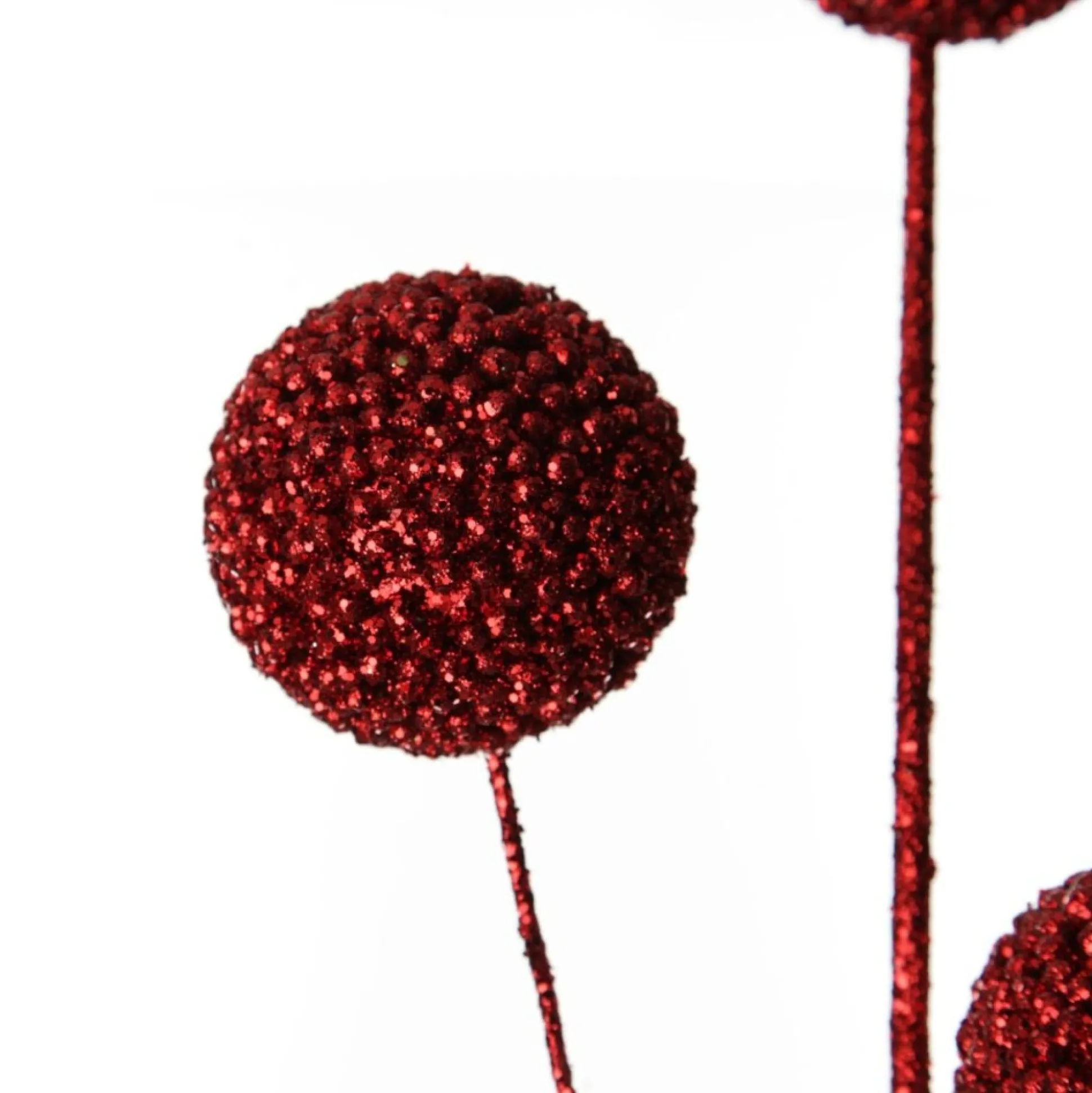 Brighten Up Your Home Using This Fun Red Glitter Christmas Ball Spray. Made With Bright Red Glitter, This Pick Measures 67Cm In Length And Features Three Glittered Balls On Separate Branches. Have Fun And Use This Whimsical Glitter Ball Spray To Brighten Up Your Christmas Display Or Use Them For All Of Your Crafting Projects. Combine With Floral Sprays And Display In A Vase Or Thread Throughout Your Christmas Tree To Add A Fun Pop Of Colour. You Can Use These To Create A Custom Wreath, Table Centrepiece, As Exciting Decorations In Your Tree, Or For Any Crafting Project. This Pick Is Perfect For A Traditional Or Christmas Sparkle Theme Paired With Red, Silver, Gold, Or Green. Add Some Colour And Fun To Your Christmas Display This Year With This Gorgeous Glittered Ball Spray Pick.