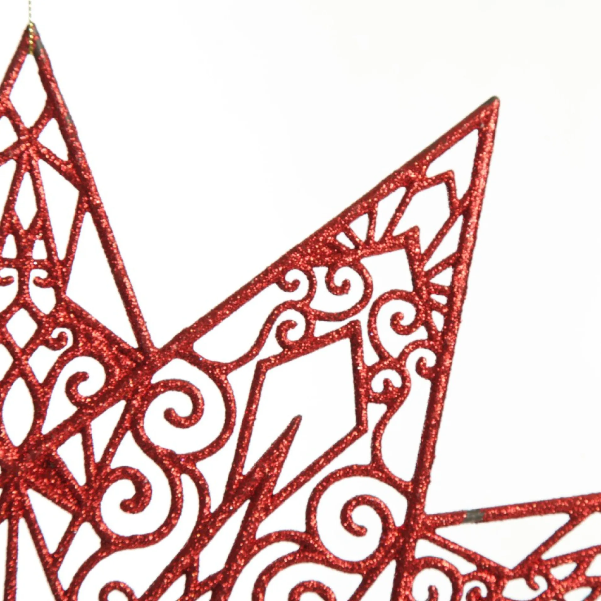 Decorate In Style With This Red Glitter Hanging Christmas Star. This Star-Shaped Ornament Features An Intricate Pattern Of Swirls And Stars Coated In Vibrant Red Glitter. A String Is Attached To The Top Making It Easy To Hang Wherever You Choose. Bring This Star Out Each Year As You Decorate For The Festive Season.