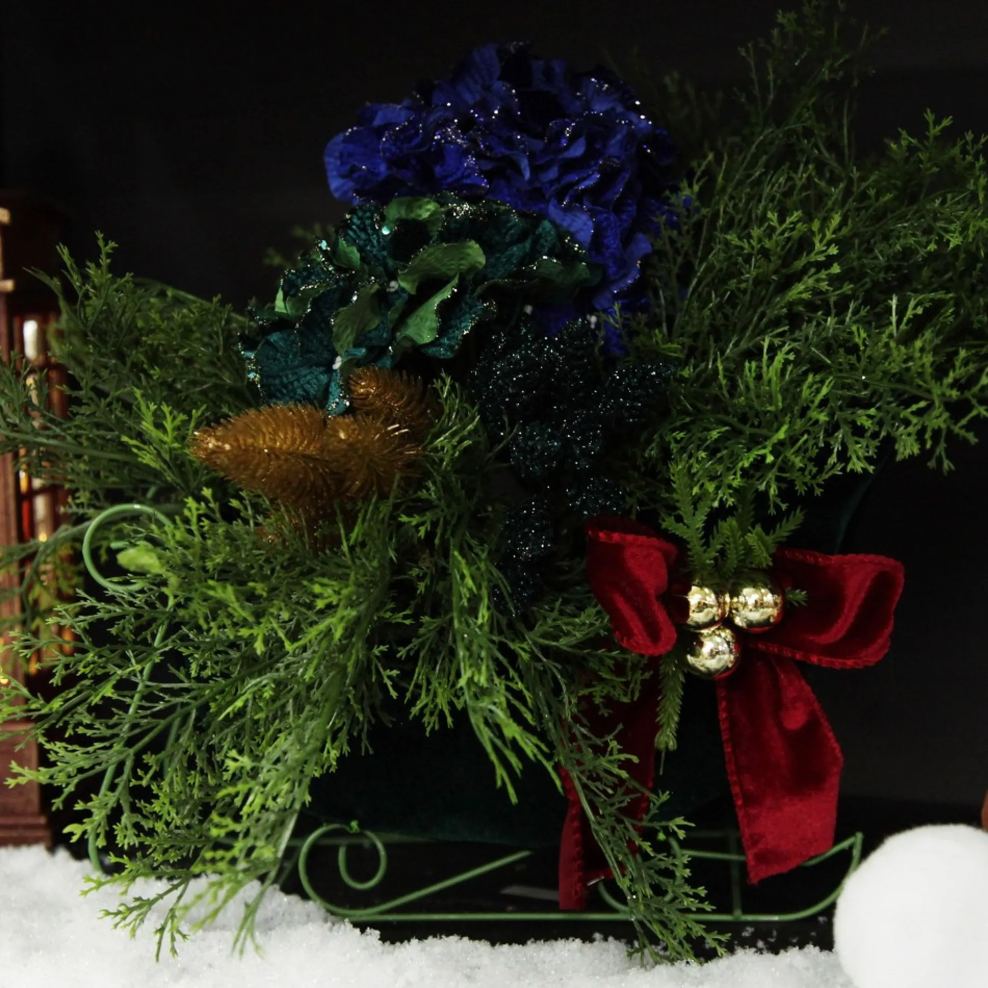 This Royal Green Velvet Sleigh With Red Bow Is A Wonderful Base For A Festive Floral Arrangement, Perfect To Use As A Table Centrepiece Or Display Anywhere Around The House During The Christmas Season. The Traditional Colours Of Green And Red Fit In Very Nicely Into Any Traditional Christmas Decor, We Have Used It In Our Nutcracker Christmas Theme. A Metal Frame Holds The Velveteen Fabric That Makes Up The Sleigh Which Is Tastefully Decorated With A Red Velveteen Ribbon, A Sprig Of Pine And Some Gold Jingle Bells. With Our Huge Selection Of Christmas Florals, You Are Sure To Find A Beautiful Combination For Your Very Own Floral Design. Add Highlights And Interest Into Your Design With Candy Cane Pics Or Other Small Christmas Decors. Alternatively, Sit A Couple Of Plush Elves, Fairies Or Teddies In Or Fill With Christmas Baubles Of Different Size Colours And Textures For An Easy And Spectacular Decor Piece.