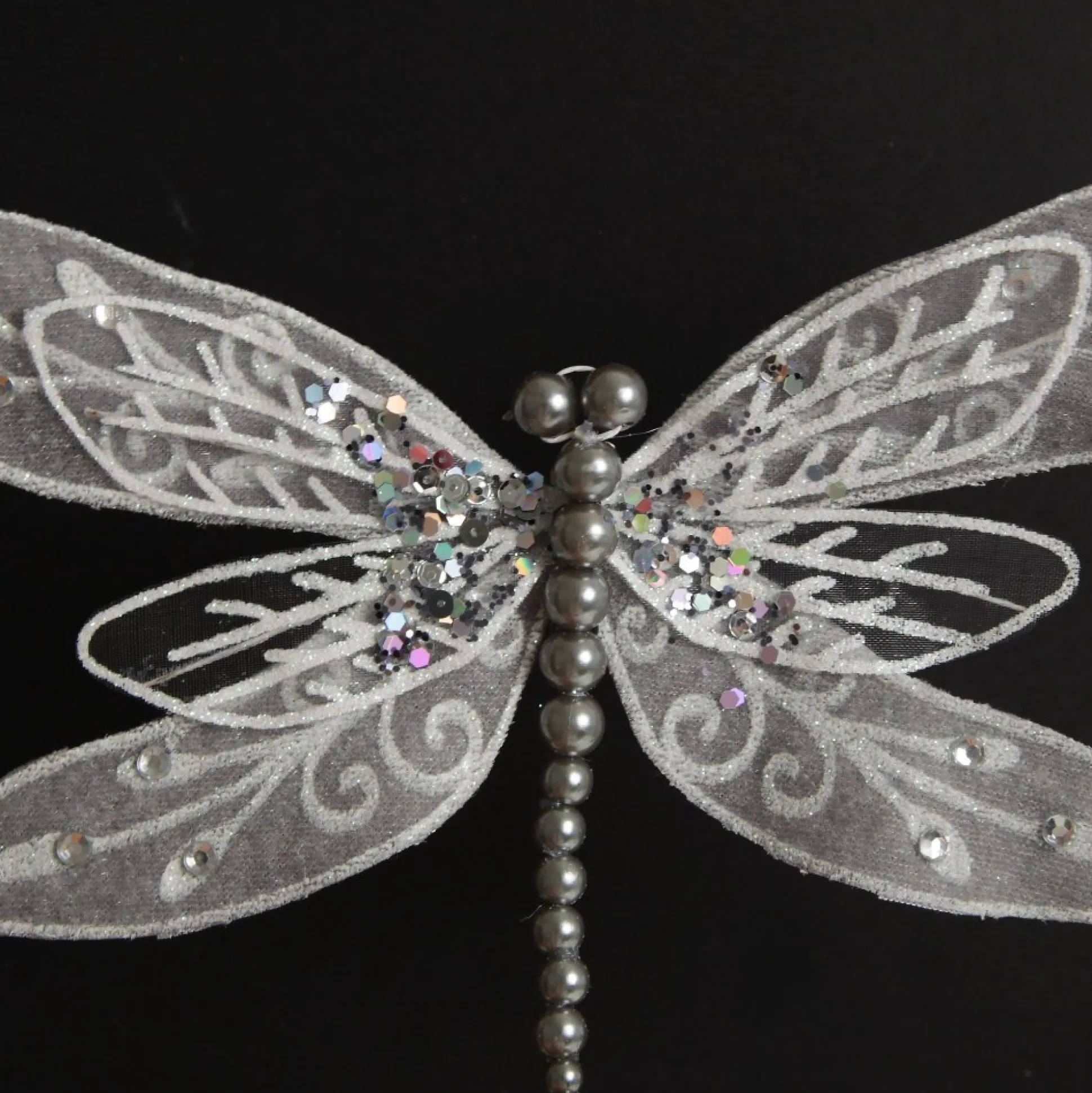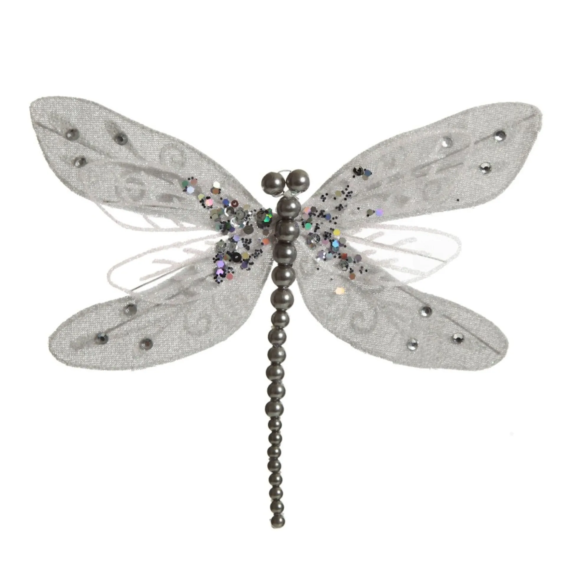 Add This Unique Silver Grey Dragonfly Clip Decoration To Your Festive Crafts And Decor. Featuring Unique Layered Wings In An Assortment Of Velour And Sheer Materials Embellished With Glitter, Sequins, And Unique Patterns. The Wings Are Wired For Easy Arranging And A Clip Affixed To The Back Of The Dragonfly Makes It Easy To Secure When Crafting And Decorating. Unique Clip Decorations Are Versatile And Reusable Making The Perfect Addition To Any Festive Craft And Decor Project. Clip This Dragonfly Onto Your Christmas Tree, Garlands, Wreaths, Floral Arrangements And More To Create A Unique And Eclectic Display. It Could Even Be Used As A Gift Topper Or Embellishment For Table Place Settings At Your Christmas Feasts.