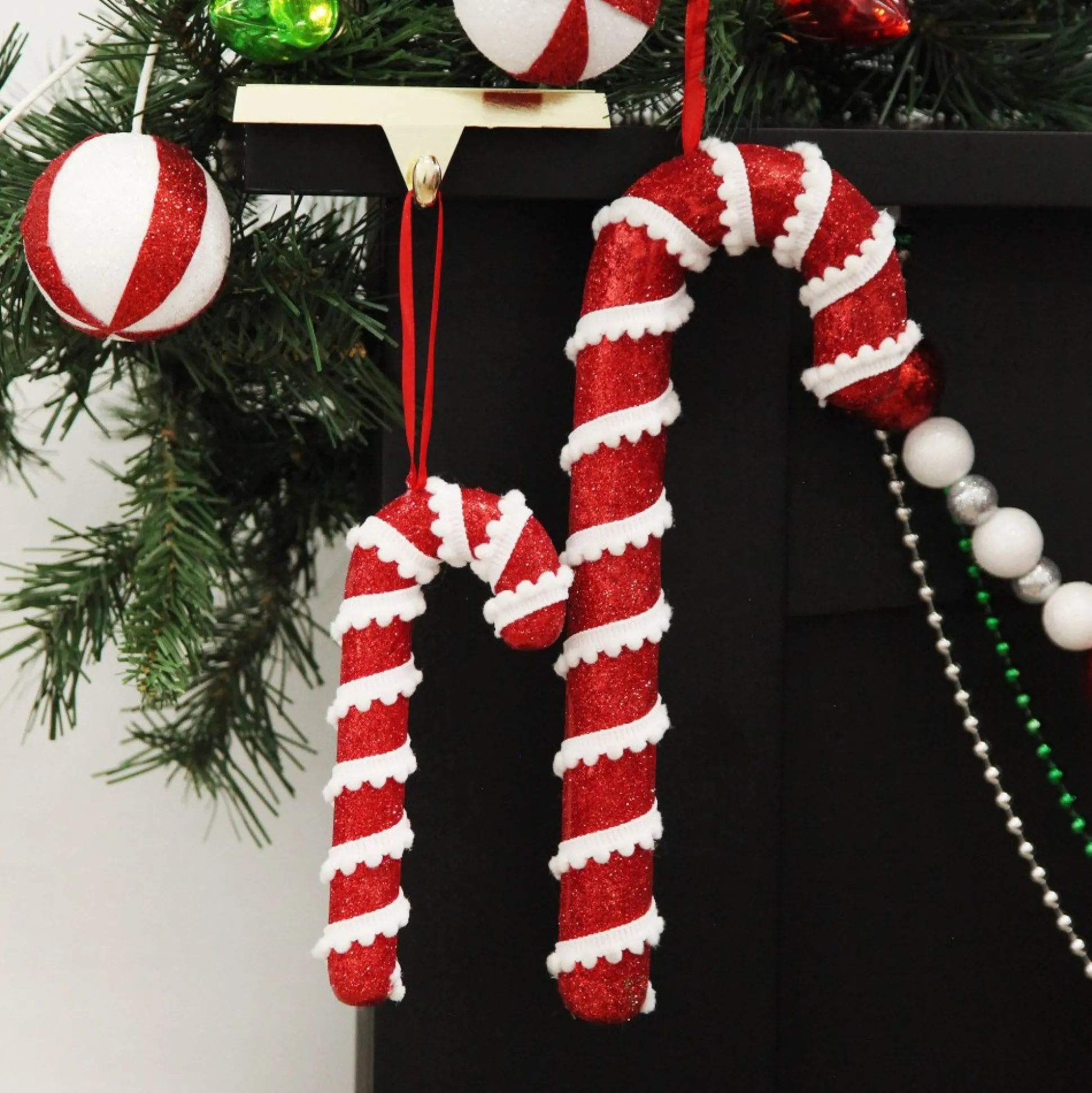 Available In Medium Red Glitter With Braid And Twine Candy Cane Christmas Decoration, And Medium Red And White Glitter With Braid And Twine Candy Cane Christmas Decoration.