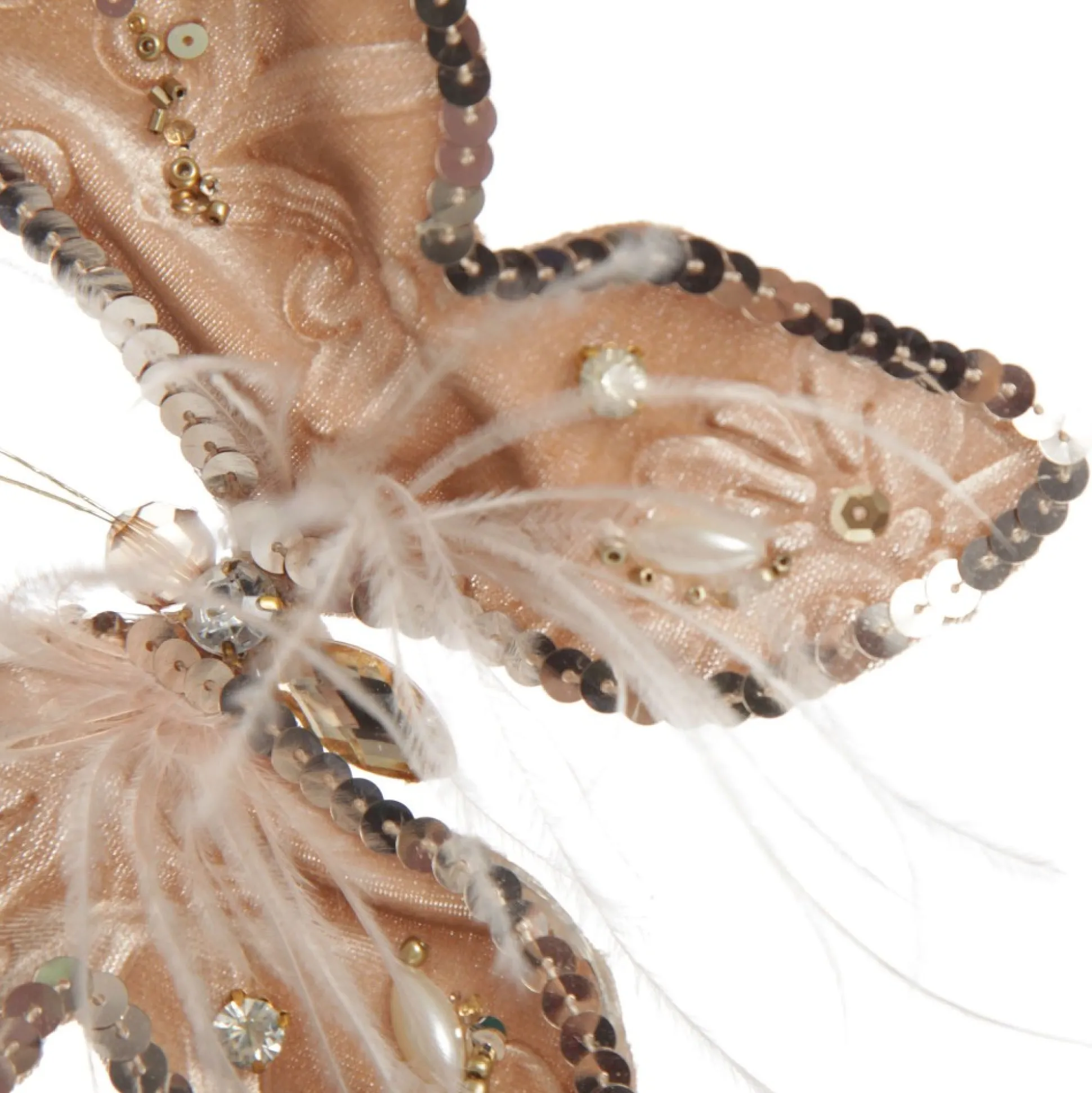 This Elegant Taupe Sequin And Jewel Butterfly Clip Is The Perfect Embellishment For Your Christmas Crafts And Decorating. Crafted From Lightweight Materials With Stunning Textured Pink Wings, This Butterfly Features Sequin Trim And Beaded Details. A Silver Clip Is Attached To The Back Of The Butterfly For Easy Securing And Attachment. Decorative Clips Can Be Used For A Wide Range Of Purposes. Use It To Add Exciting Embellishments To Your Christmas Tree, Garlands, Wreaths And More. It Can Even Be Used As A Unique Present Topper When Gift Wrapping Or As An Embellishment For Table Place Settings At Your Christmas Day Feasts. This Gorgeous Pink Glitter Butterfly Is Perfect For A Boho Glam Or Sugar Plum Christmas Decor Theme. Pair With Neutral Tones, Pale Pinks, Champagne Decorations, And Wooden Elements To Create A Stunning And Stylish Display.