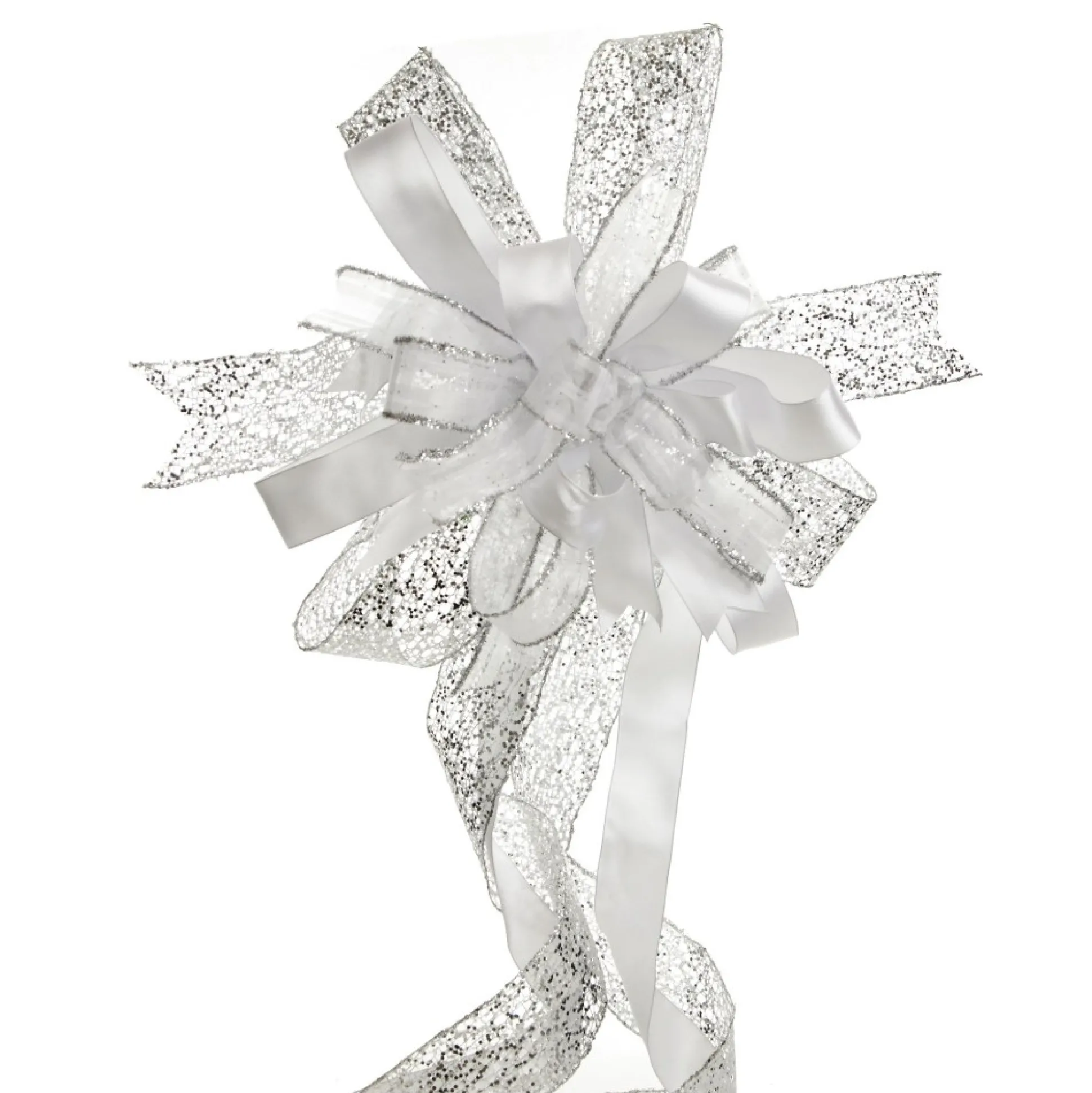 Add Elegance To Your Festive Display With Our White And Silver Glitter Deluxe Tree Topper Bow With Streamers. Featuring A Combination Of 3 Ribbons – Silver Glitter Mesh, White Satin, And Sheer White Plaid With Silver Trim – Hand Crafted Into Intricate Layered Loops Creating A Lush Arrangement. Ribbon ‘streamers’ Hang Down For Added Texture. You Can Use This Unique Bow To Embellish Your Christmas Tree As A Tree Topper, To Decorate A Large Custom Wreath, Or To Decorate Any Door, Wall, Or Window In Your Home. Each Ribbon Is Wired Making It Easy To Place And Arrange When Decorating. Please Note That The Bow Will Arrive Slightly ‘squished’ For Packaging And Shipping Purposes However Due To The Wired Nature Of The Ribbon It Is Easy To Reshape When Decorating.