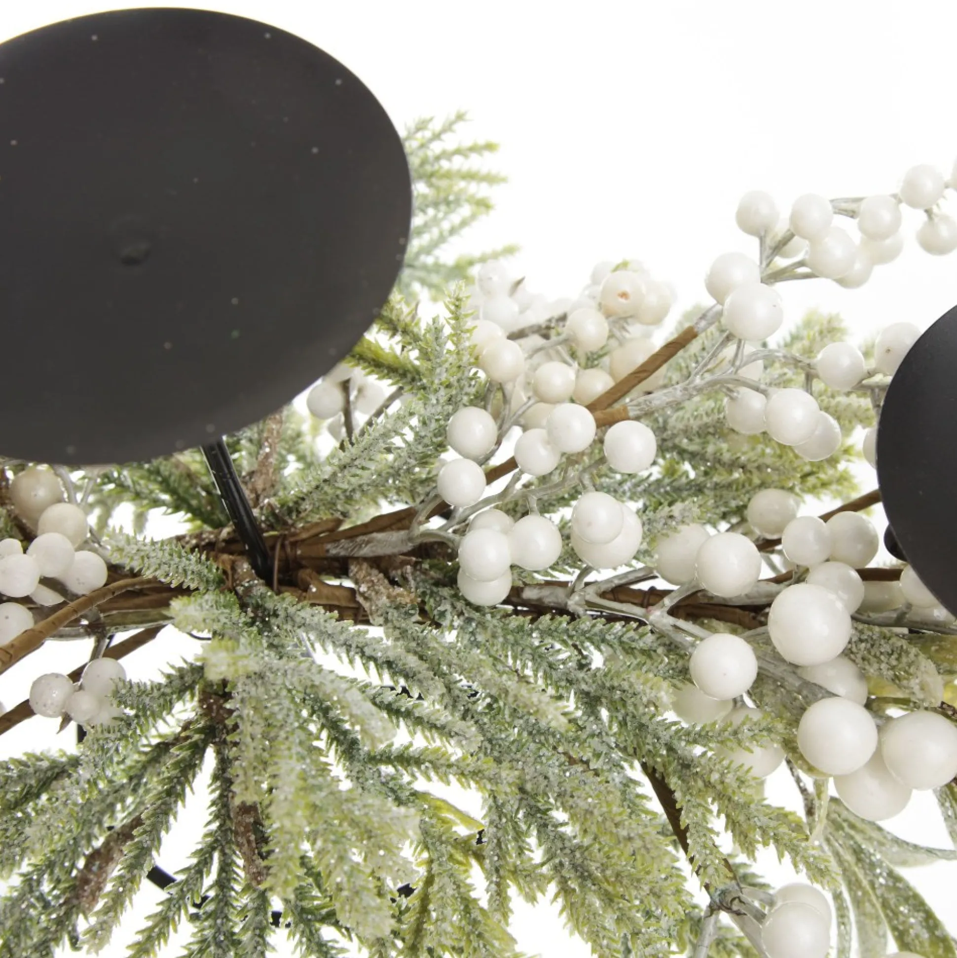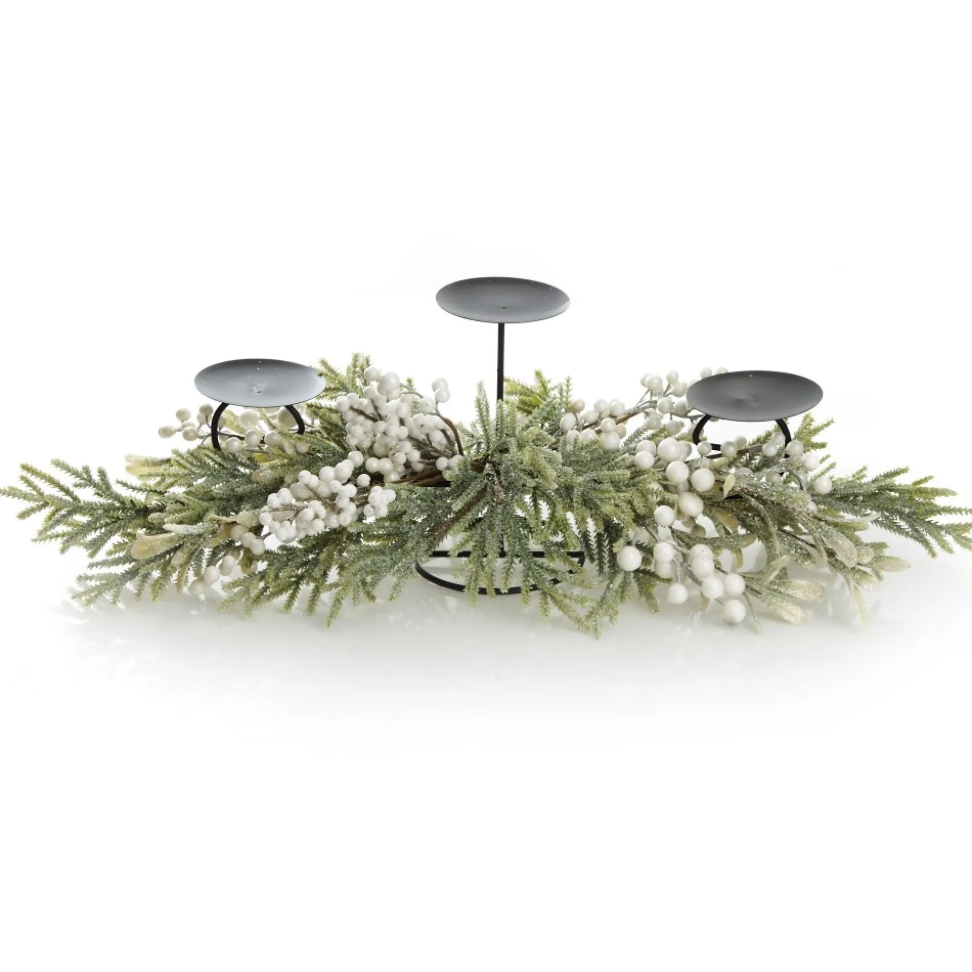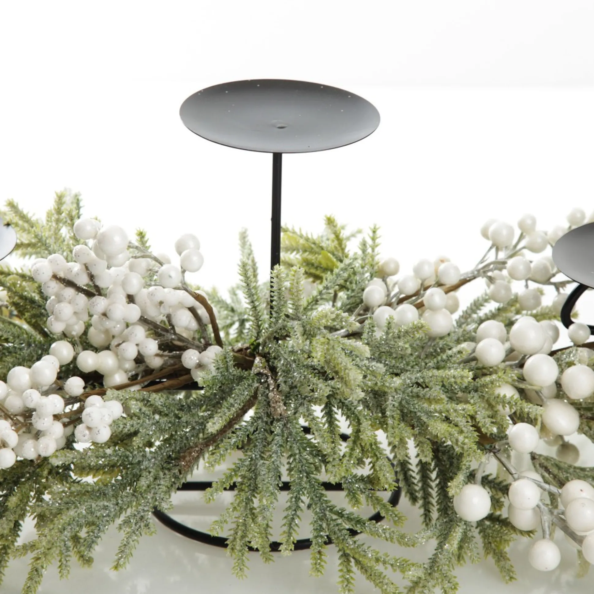 Make A Statement And Celebrate In Style With This White Berry And Frosted Leaf Christmas Table Centrepiece Candle Holder. Crafted With A Durable Metal Base Covered In Lush Green Frosted Foliage, This Centrepiece Features Delightful White Berry Cluster Embellishments And Three-Tiered Metal Candleholders Extending From The Metal Base.