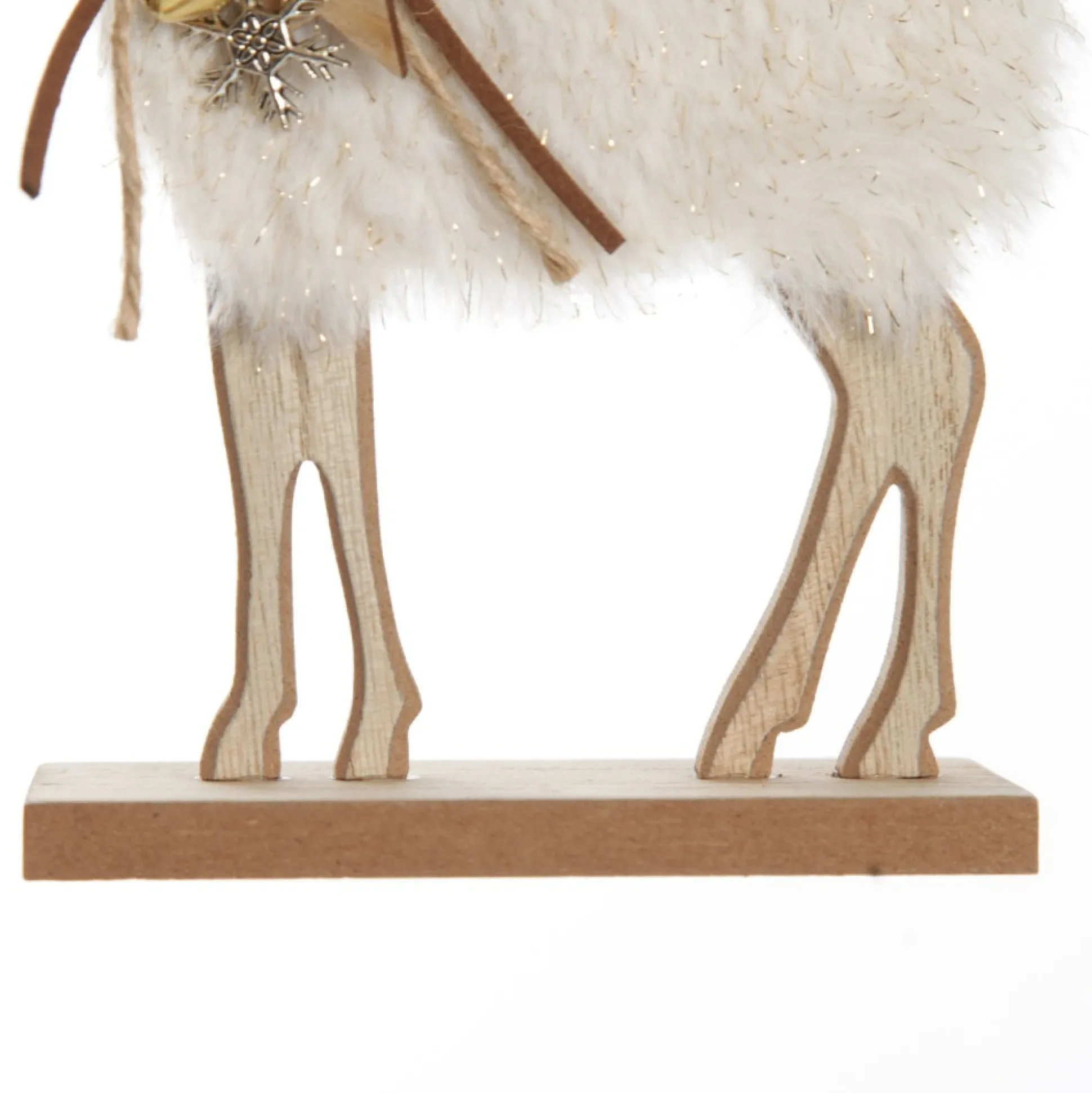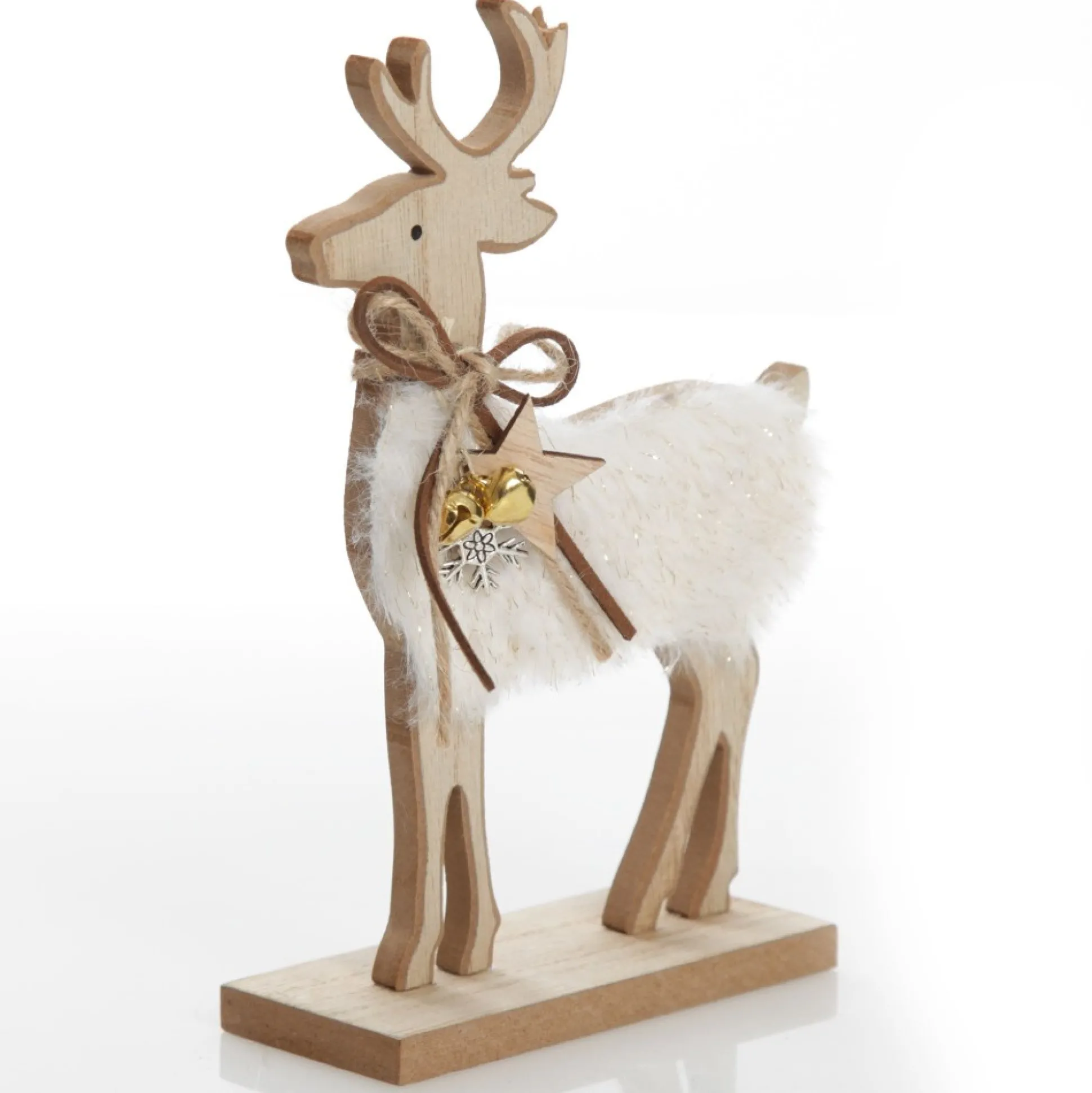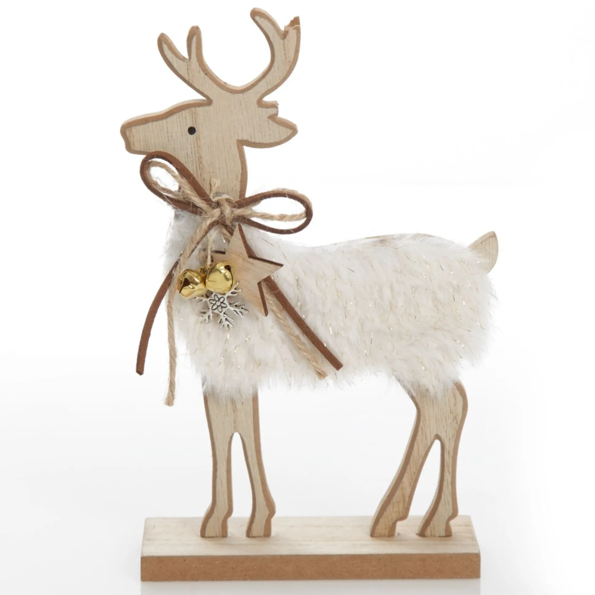 This Charming Wood Reindeer With Fur Christmas Ornament And Neck Tie Will Make A Delightful Addition To Your Festive Displays. Made From Durable Wood Crafted Into An Intricate Reindeer Cut-Out With White Fur And Glitter Detail On The Body And Delightful Wooden Star, Gold Bell, Silver Snowflake And Bow Embellishments Around The Neck. The Flat And Sturdy Wooden Base Makes It Easy To Place And Arrange This Ornament. Display On Any Surface In Your Home As Part Of A Festive Vignette. Use To Adorn Your Mantel, Coffee Table, Dining Table And More To Create A Stunning Centrepiece.