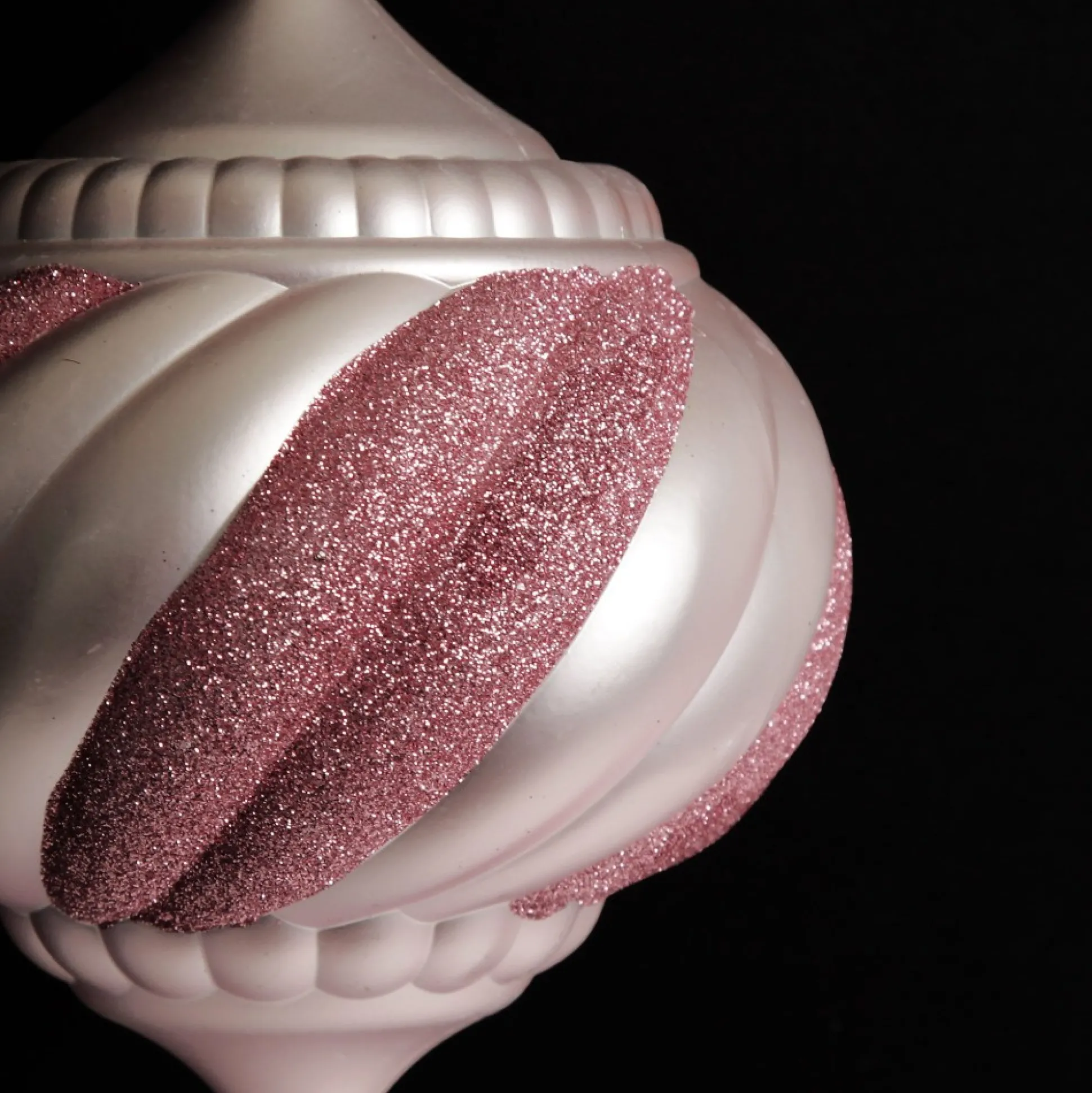 Create A Stunning Christmas Tree Display With This Baby Pink Glitter Swirl Christmas Onion Bauble. Crafted From A Durable Acrylic, This Baby Pink Bauble Features A Unique Onion Shape And Swirl Design With Textured Details And Glitter Highlights. The Bauble Comes With String Attached, Ready To Hang Straight On Your Tree.