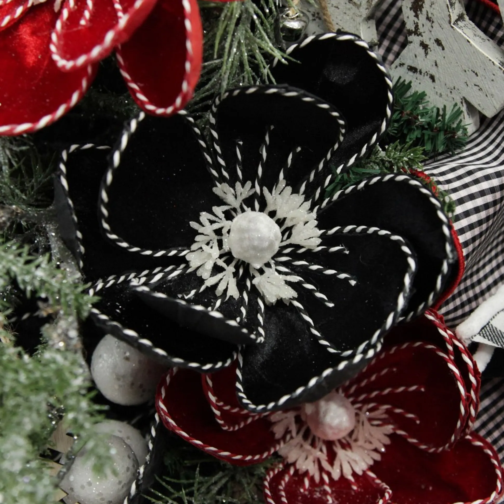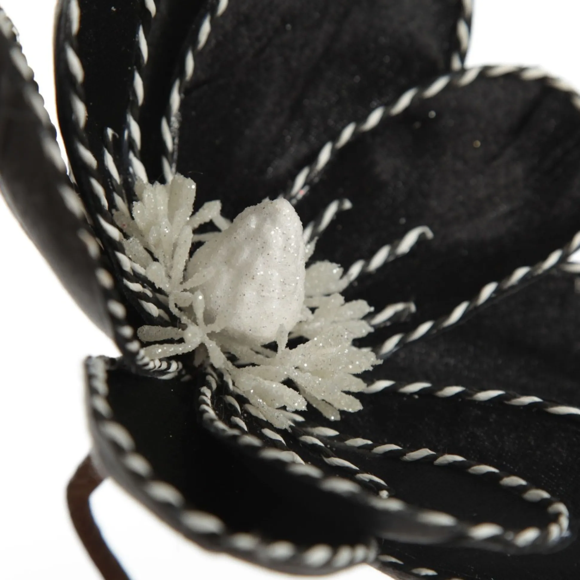 Add This Unique Black Magnolia Flower Stem With Twine Trim To Your Christmas Floral Arrangements. Made From High-Quality Materials, This Flower Features Sleek Black, Velvet-Like Petals With Intricate Black And White Twine Details And A White Glitter Pollen Arrangement In The Centre.