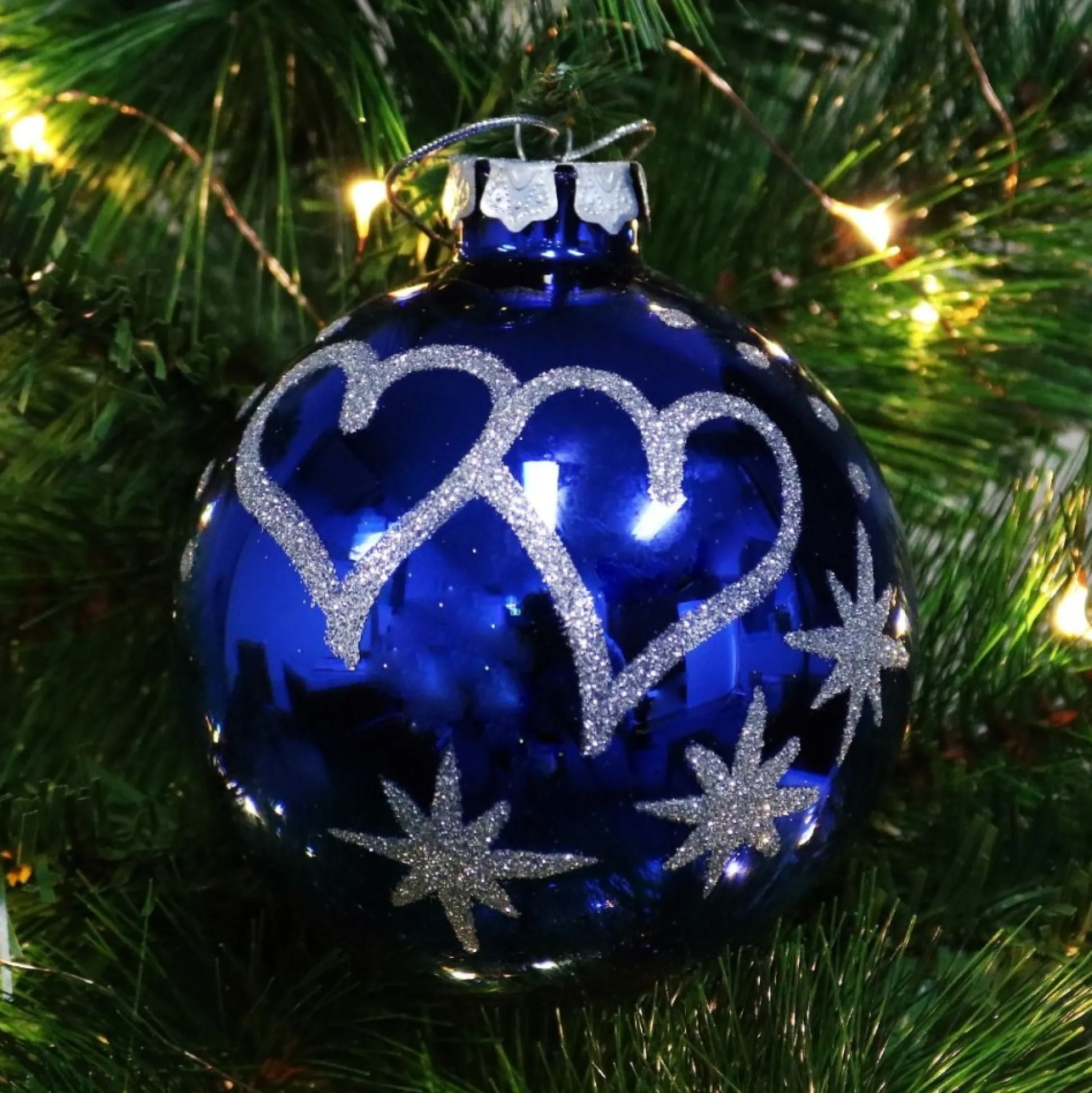 Share A Little Romance This Festive Season With This Stunning Blue Love Hearts Christmas Bauble. Crafted From Seamless, High Quality Glass With A Gloss Finish, This Bauble Features Stunning Silver Glitter Heart, Star, And Dot Embellishments. It Comes Ready To Hang With A Metal Top And Thread And Can Be Personalised With A Name And Year Of Your Choice In Our Unique Style Of Glitter Calligraphy.