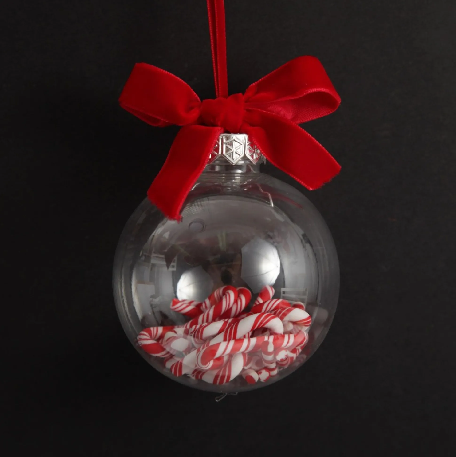 This Delightful Candy Cane Filled Clear Shatterproof Bauble Is A Fun Way To Add Some Candy Cane Design For A Fun Peppermint Christmas Theme. Made From Clear Acrylic Shatterproof Material This Bauble Holds A Small Handful Of Sculpted Clay Candy Canes And Also Features A Gorgeous Red Velvet Bow And Hanger On Top For Easy Hanging On Your Christmas Tree. A Perfect Addition To Any Candy Cane Christmas Theme.