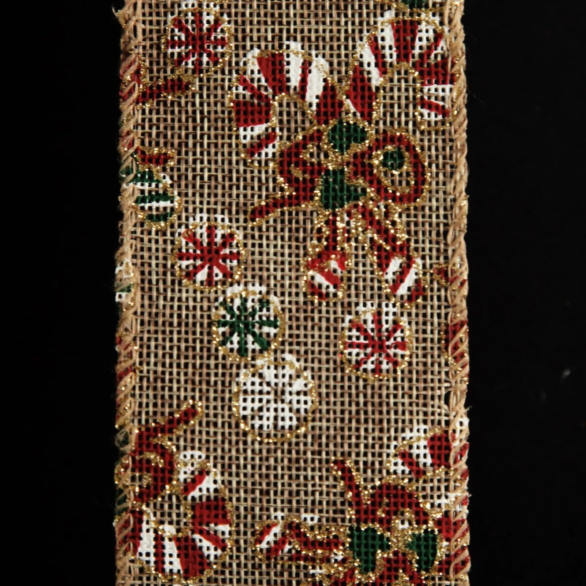 This Candy Cane Hessian Ribbon With Wired Edge – 6.3Cm Is Sure To Brighten Up Your Festive Gift Wrapping, Crafts And Decor! Featuring An Assortment Of Candy Canes And Peppermints In Vibrant Red, And Green, Creating An Exciting Festive Pattern That Will Enhance Any Display! The Perfect Festive Ribbon For Any Craft Or Decorating Purpose With A Natural Hessian Ribbon And Wired Edge.