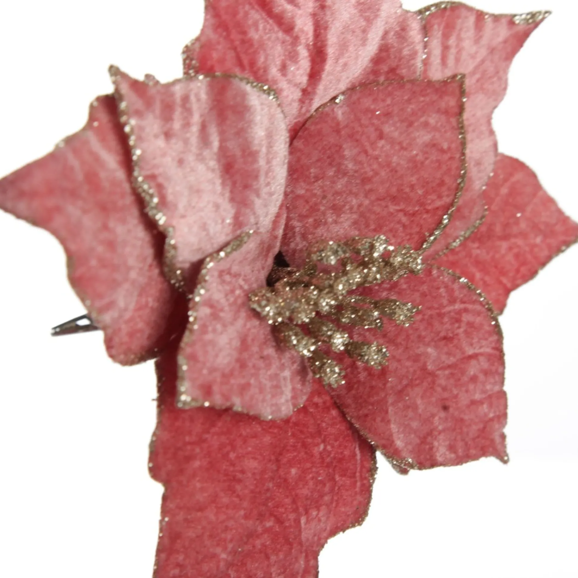 This Dark Pink Velvet Poinsettia Flower Clip With Glitter Trim Will Infuse Your Christmas Decor With Elegance. Crafted From Luxury Dark Pink Velvet Petals With Realistic Texture Lines, Glitter Trim And Pollen Details. A Short Stem And Clip Extend From The Base Of The Flower Making It Easy To Decorate With. You Can Simply Clip It Onto Your Christmas Tree, Garlands, And Wreaths Or Use It On Floral Arrangements In A Vase To Add An Extra Pop Of Colour. Include Faux Flowers As A Staple In Your Decorating And Crafting Collection. Reuse Them Every Year To Create New And Exciting Arrangements. This Gorgeous Colour Is Perfectly Suited For A Boho Glam Christmas Decor Theme Paired With Neutral And Warm Tones, Glitter, Glass, And Wooden Elements. View Our Inspiration Gallery To Spark Your Creativity And Create Unique Festive Displays.
