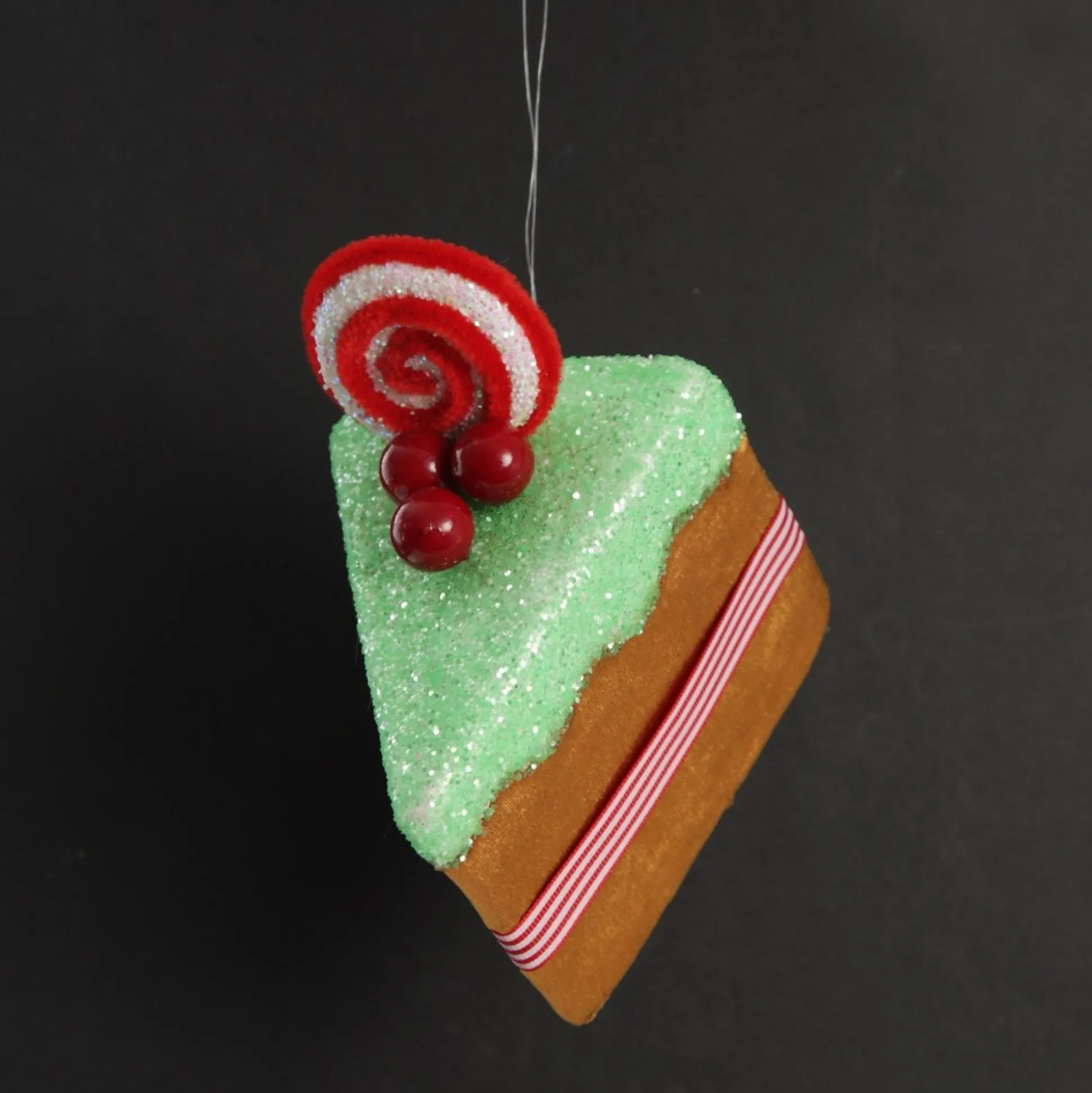 Crafted From Lightweight Material With A Sleek Velvet Finish, This Gingerbread Cake Slice Decoration Features Sparkling Glitter Icing, Striped Ribbon Trim And Candy And Red Berry Embellishments. Complete With A String Attached For Easy Placement.
