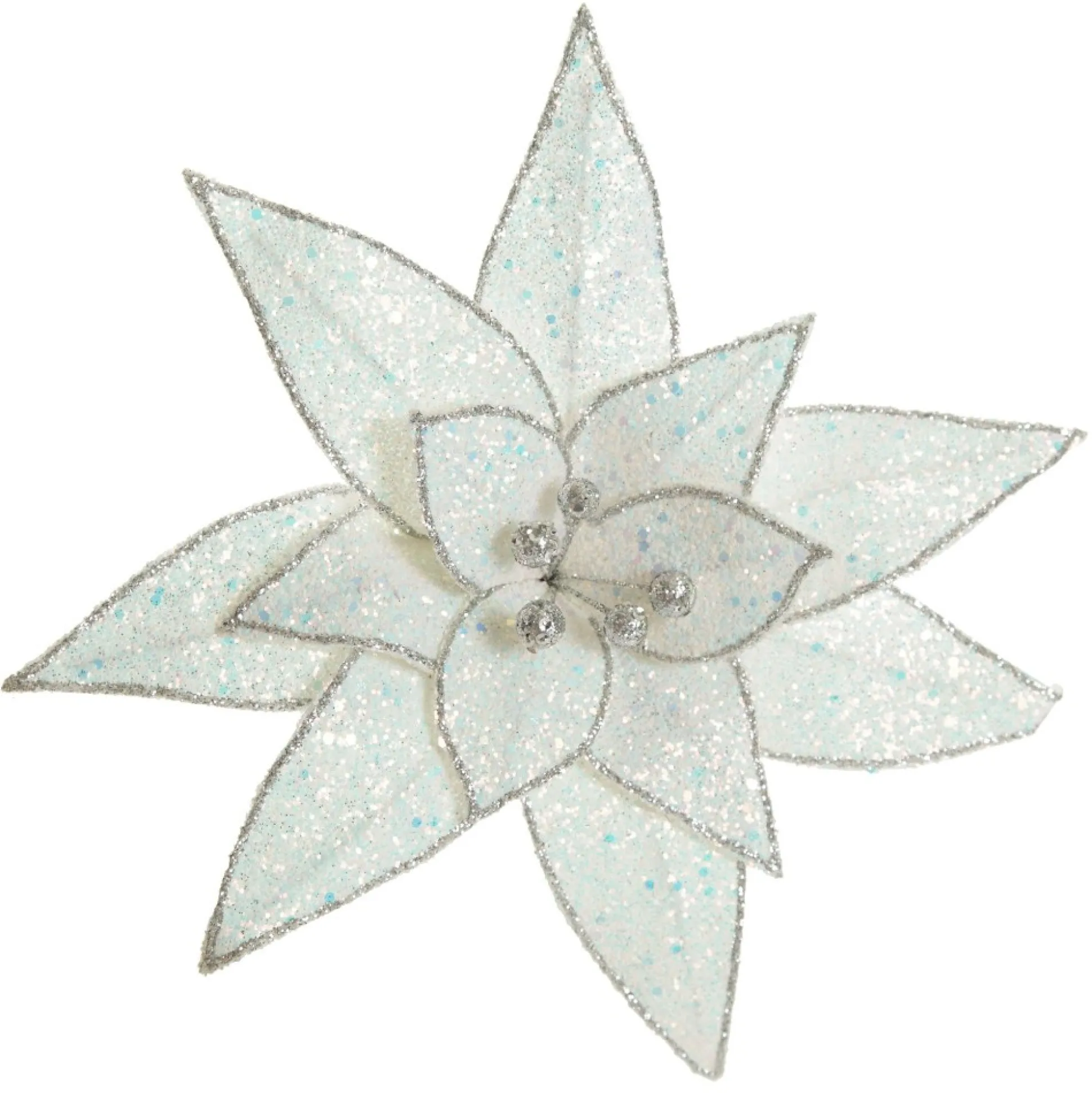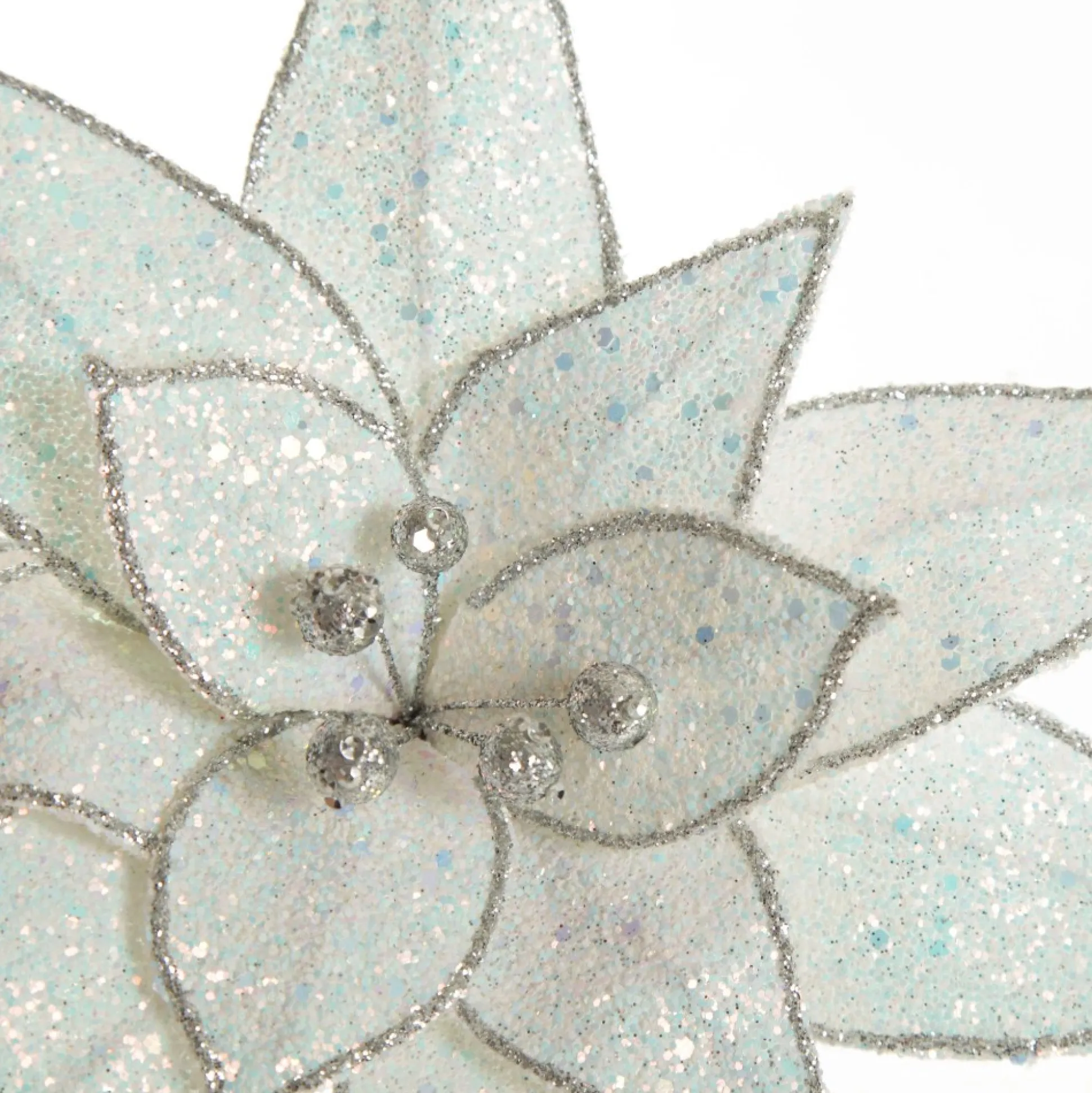 This Stunning Iridescent Glitter Poinsettia Flower Clip Will Enhance Your Festive Floral Displays. Featuring Layered Glitter Petals With An Iridescent Finish, Silver Glitter Trim And Pollen Details. Extending From The Base Of The Flower Is A Short, Durable, And Flexible Stem.