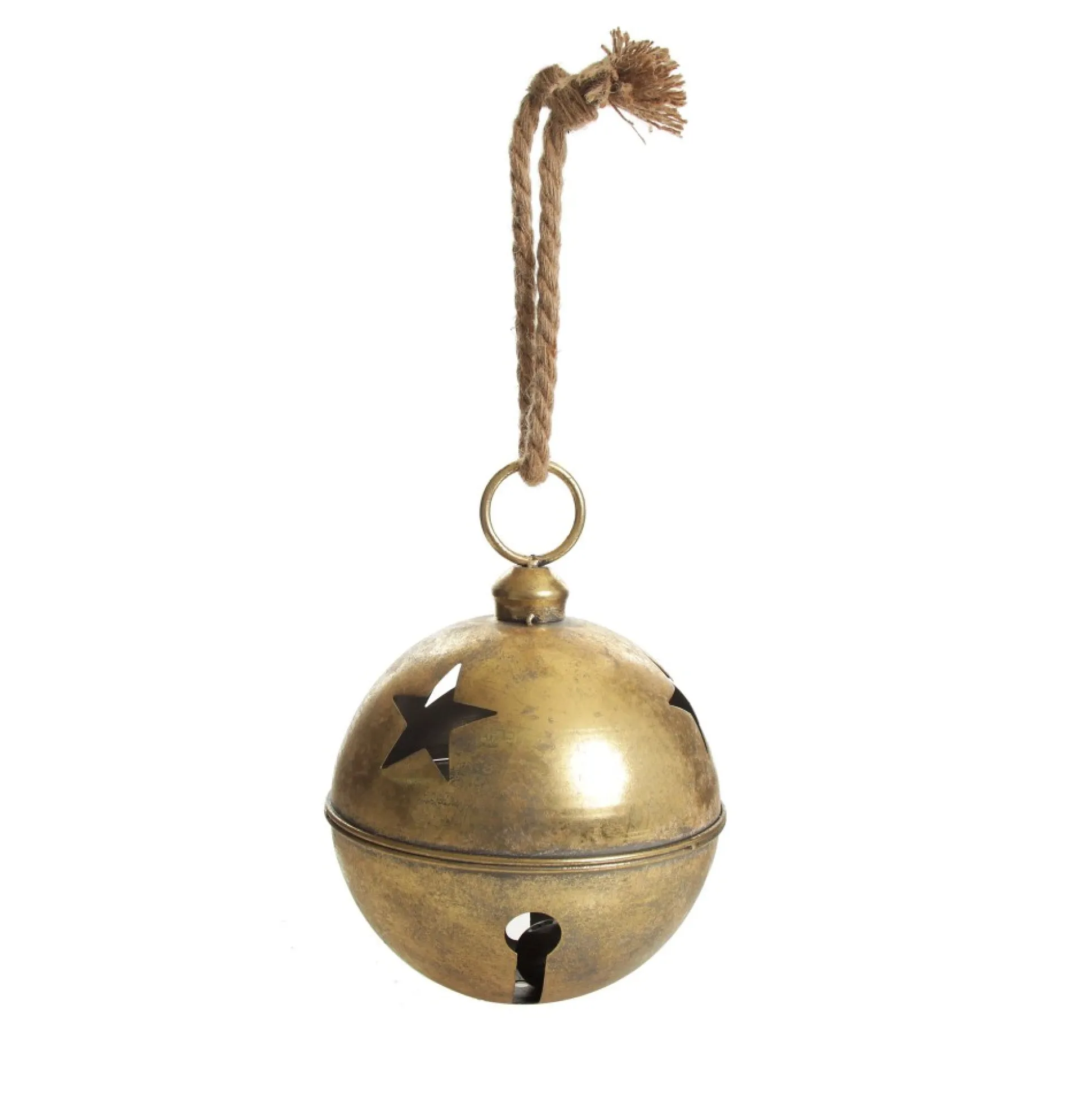 Bring Unique And Exciting Elements Into Your Festive Home Decor With This Large Antique Gold Metal Bell Decoration. Crafted From Metal With An Antique Brushed Gold Finish, This Bell Features Festive Star Cut Outs And A Natural Rope, Ready To Hang. The Bell Is Also Functional, Producing A Classic Jingle Bell Sound. Versatile And Reusable, This Unique Bell Decoration Can Be Used For Many Festive Crafts And Decor Projects. Use As Part Of A Garland To Dress Your Mantel, Hang From Hooks On The Ceiling, Nestle Amongst The Branches Of Your Tree Or A Foliage Garland, Or Display As Part Of A Unique Table Centrepiece. This Bell Is Perfect For Any Traditional Christmas Decor Theme. Get Creative And Craft Extravagant Festive Displays Throughout Your Home This Christmas.
