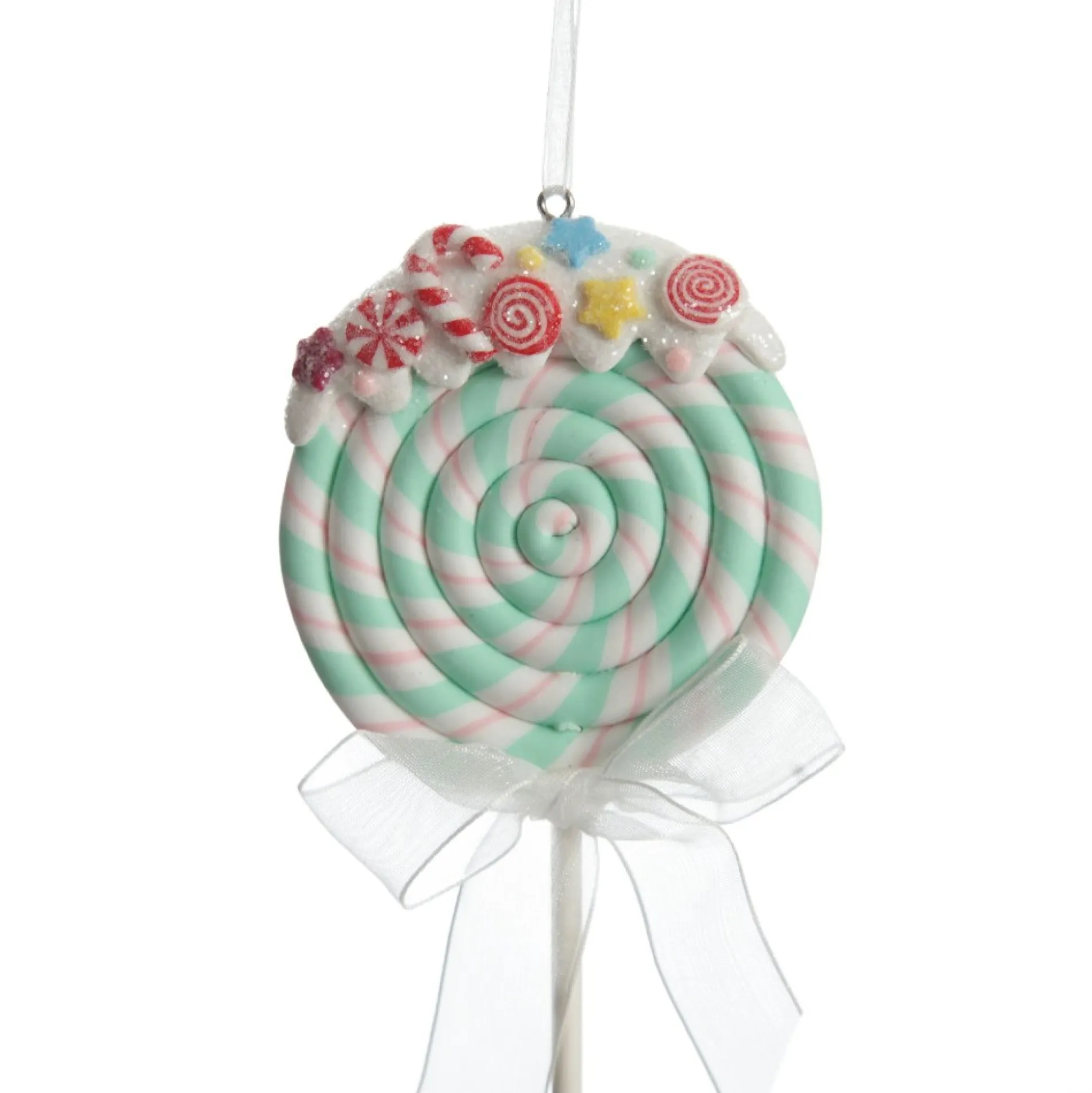 Sugar-Coat Your Christmas Display With This Mint Candy Swirl Lollipop Christmas Tree Decoration. Featuring A Mint, White, And Pink Swirl Lollipop Crafted From Durable Polymer Clay, With Glitter Frosting, And Candy Embellishments On Top. A White Organza Ribbon Bow Adorns The Stick And A Ribbon Hangs From The Top Of The Decoration For Easy Placement On Your Tree. This Lollipop Would Make Such A Sweet And Exciting Addition To Your Christmas Tree, Garlands, Wreaths And More. You Could Also Use It For A Unique Gift Topper Or Table Place Setting Embellishment For Your Christmas Day Feast. Perfect For A Peppermint Candy Christmas Decor Theme Paired With Vibrant Red, Green, White, And Silver Tones, Adorable Candy-Themed Decor And Glitter Galore!