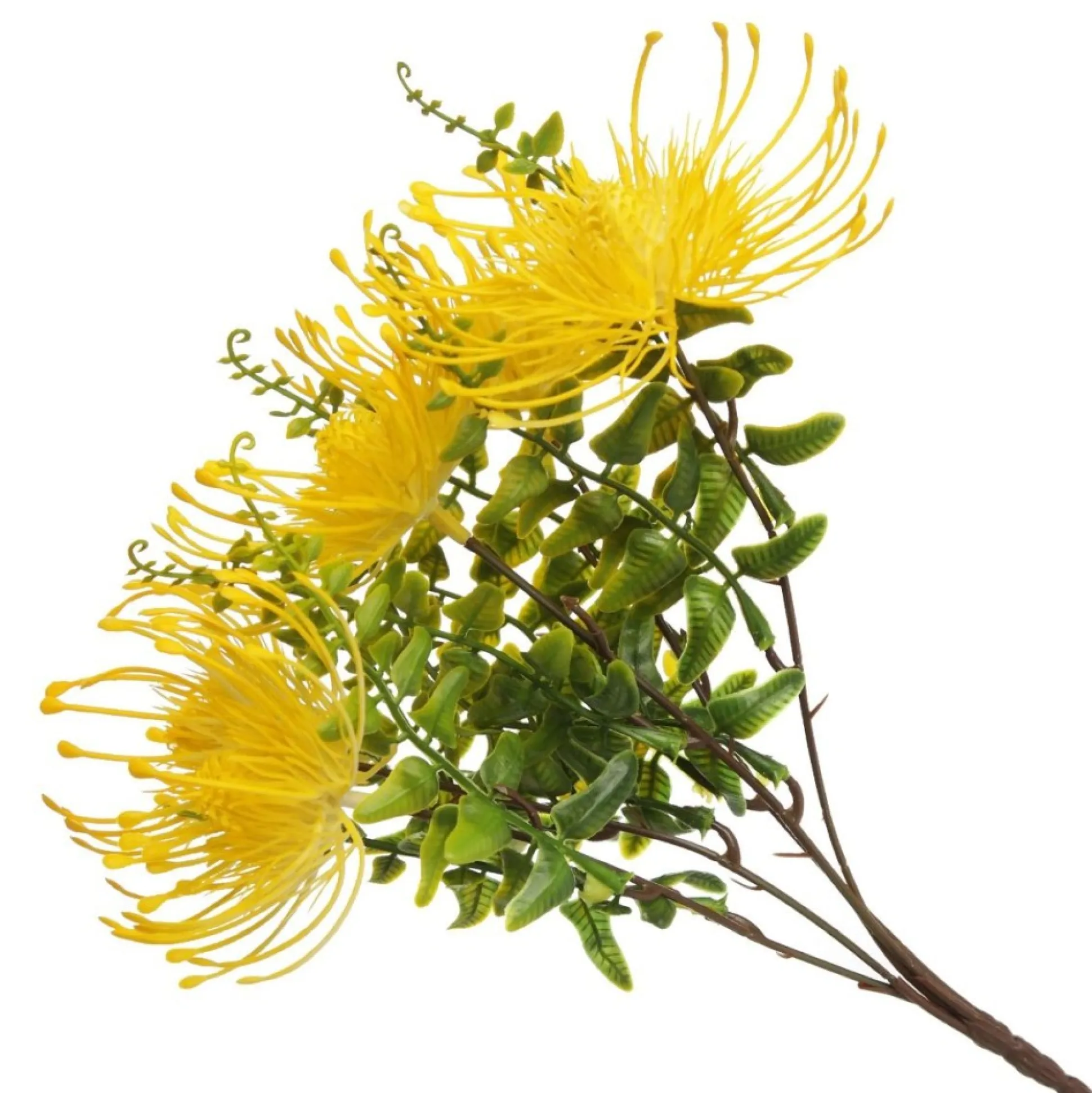 Bring Delightful Australian Flora Into Your Home With This Native Yellow Pincushion Protea Flower Spray. Made From A Flexible, Lightweight Material, This Spray Features 4 Bright Flower Buds With Detailed Foliage In Shades Of Green And Brown. Use To Add Pops Of Colour To Your Floral Arrangements Or Add To Your Christmas Wreath To Create A Unique Design. Can Also Be Used To Create A Custom Table Centepiece Or For Any Crafting Project. Perfect For Australiana Themed Christmas Decor When Paired With Our Other Native Australiana Florals In An Array Of Colours. Create Authentic, Native Floral Arrangements With This Native Yellow Pinecushion Protea Flower Spray.