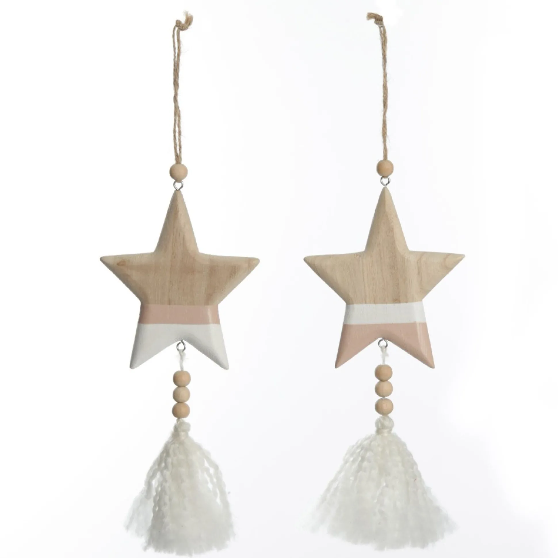 Crafted From Durable Wood With A Smooth, Natural Grain Finish, This Set Features Two Star-Shaped Ornaments With Painted Lines In Neutral Tones, Wooden Bead Elements And A Gorgeous Fluffy Tassel Hanging Below The Star. A Jute String Hangs From The Tops Of The Stars For Easy Placement. Use These Decorations To Embellish Your Christmas Tree, As Exciting Gift Toppers, Or As Unique Additions To Your Table Place Settings.