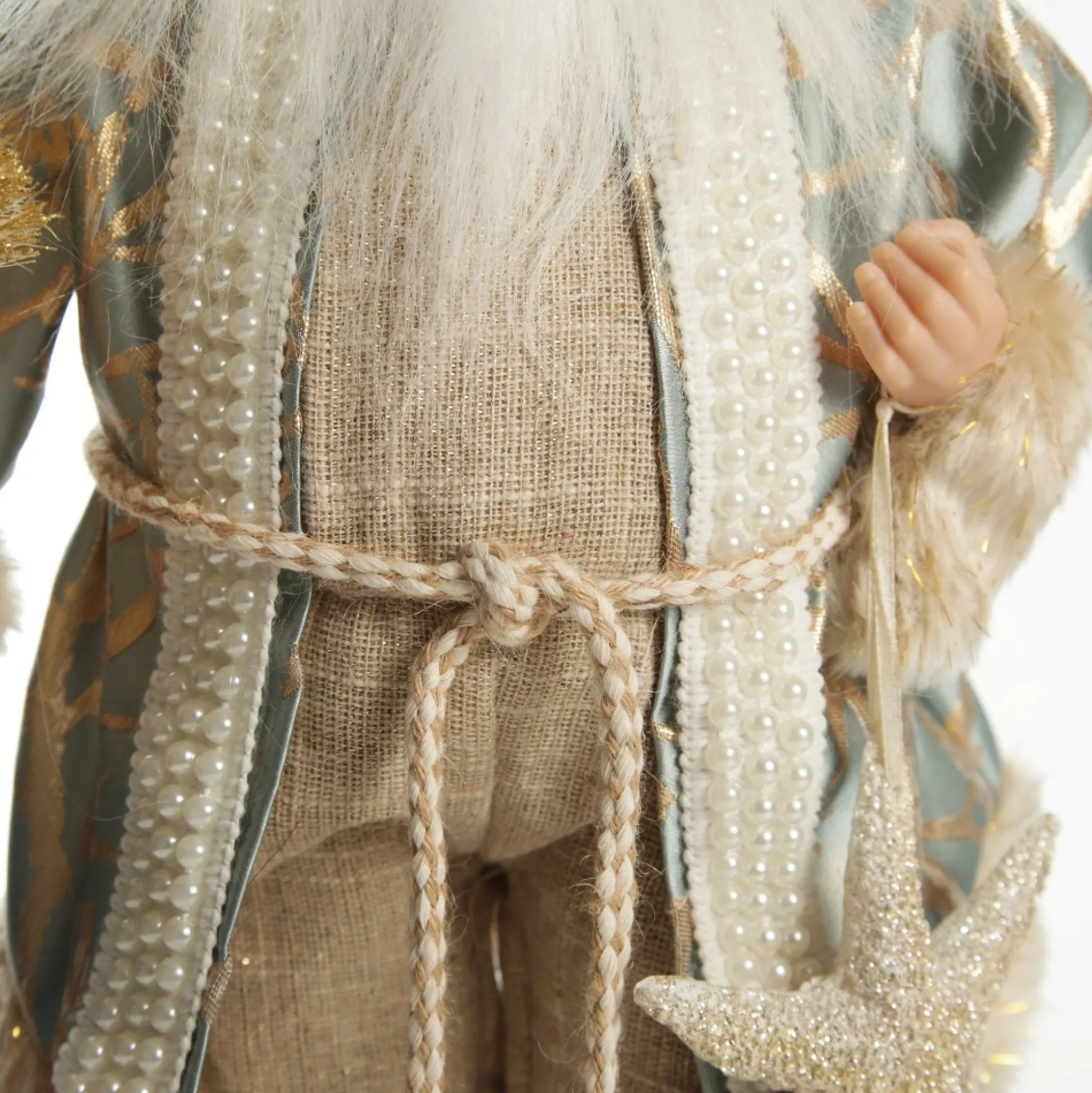 Enhance Your Festive Displays With This Stunning Natural Seaside Standing Santa Christmas Ornament. This Standing Santa Ornament Features A Natural Jute Suit With A Silver Jacket And Pearl Trim. The Figurine Holds A Small Tree And Hanging Starfish For A Touch Of The Seaside.