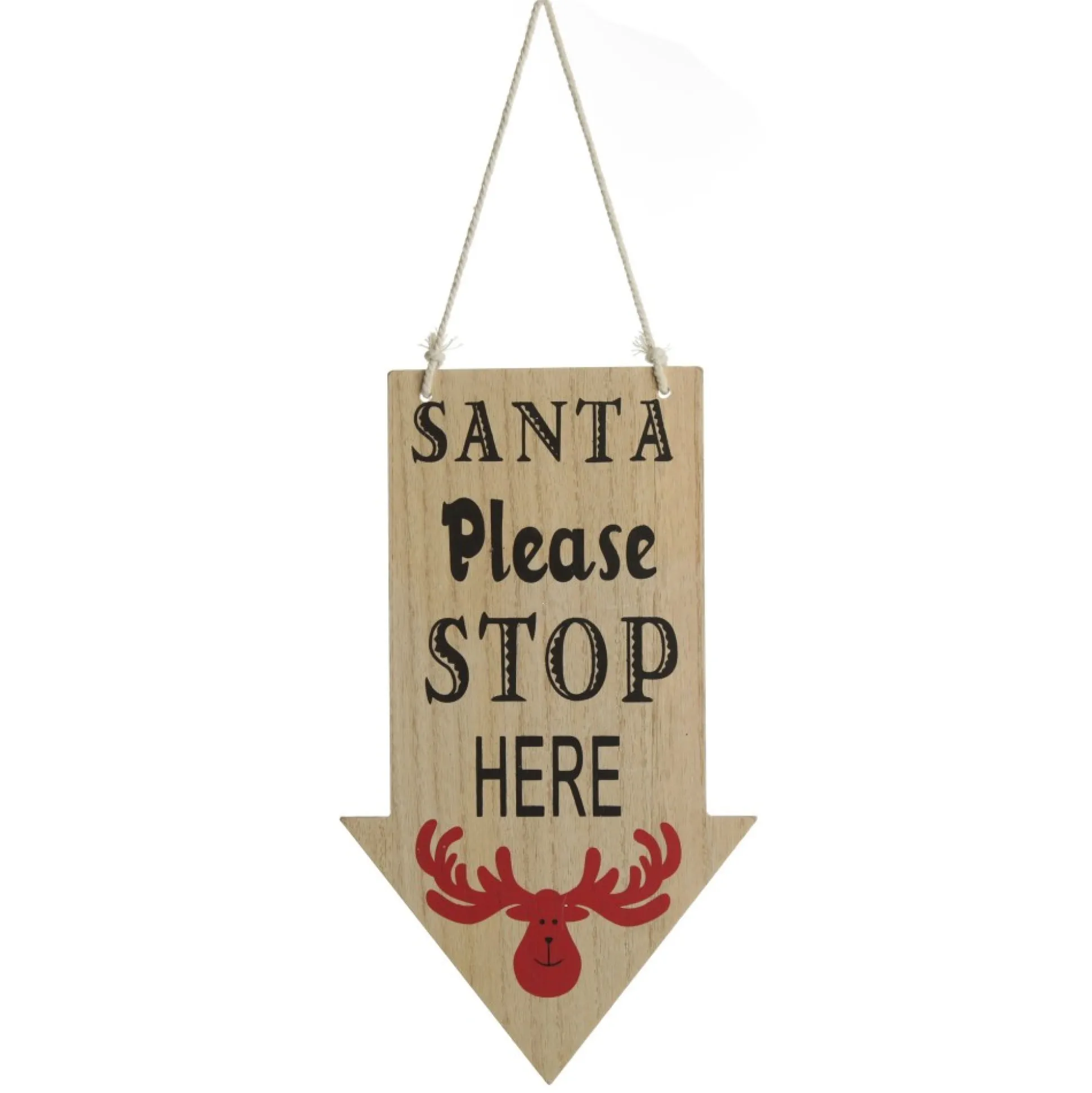 Made From Natural Light-Coloured Wood With A White Knotted Rope Hanger, This Sign Features The Phrase ‘santa Please Stop Here’ In Black Font And A Cute Drawing Of A Red Reindeer.