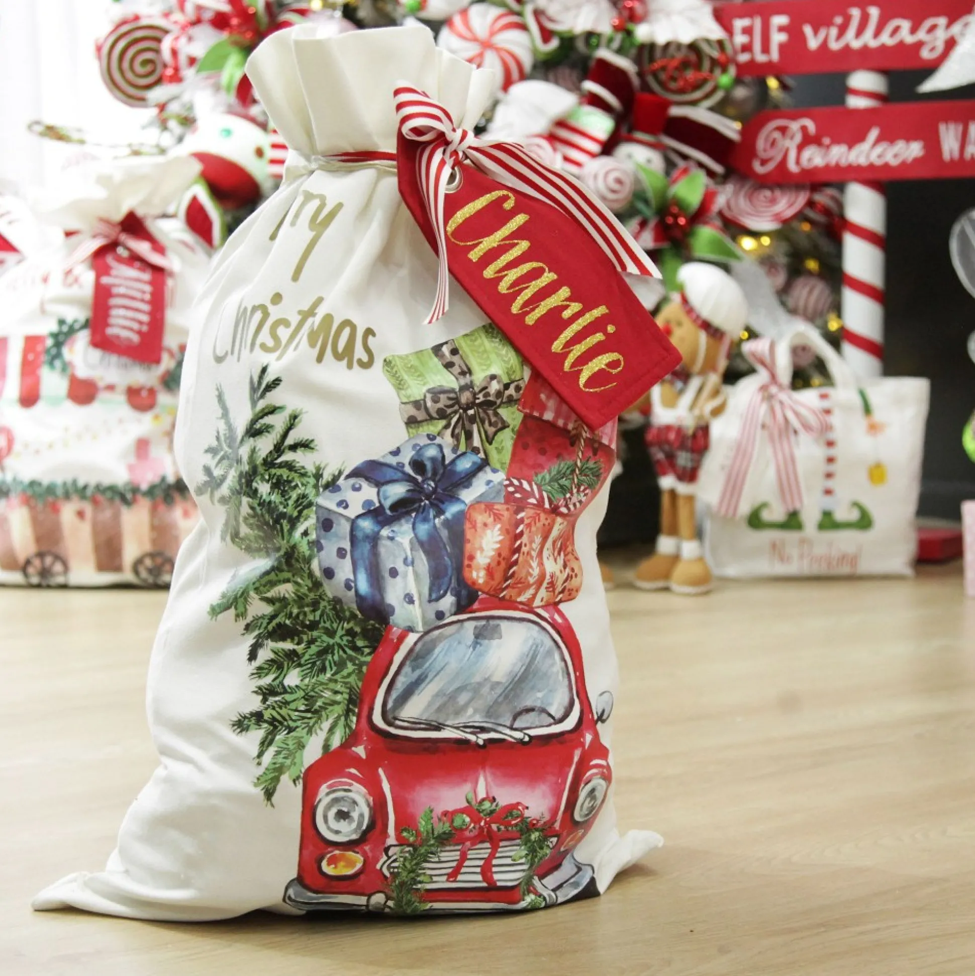 Add Something Magical To Your Home With This Personalised Santa Sack And Enjoy Watching The Excitement On Your Kid’s Faces When They Wake Up To Find Their Very Own Name On A Sack Full Of Presents! Personalised Sacks Are Both A Practical Item And Memorable Keepsake That Make Great Gifts For Loved Ones. The Candy Theme And Bright Colours Make This Sack Perfect For A Peppermint Candy Christmas Decor Theme.