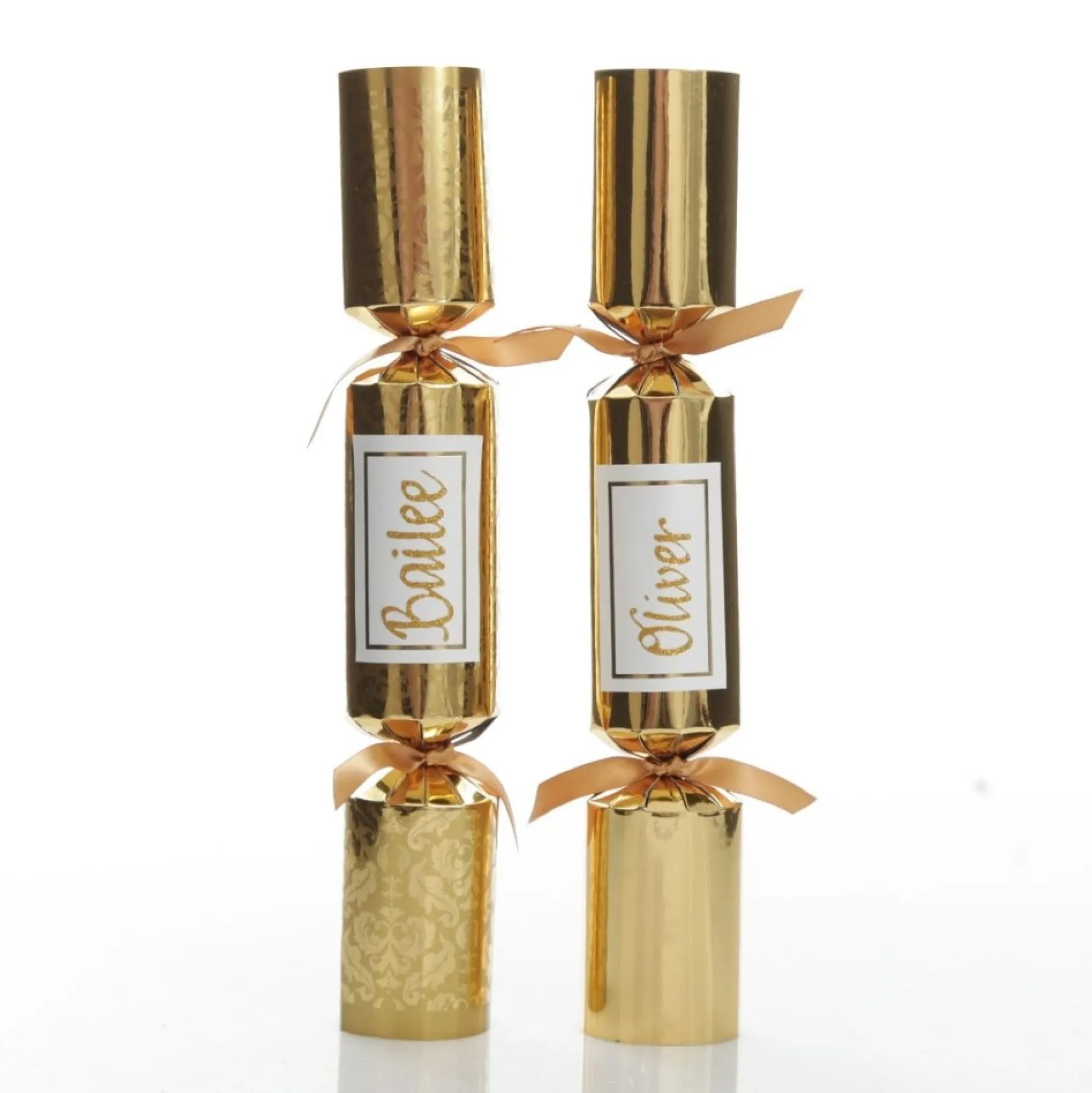 Each Bon Bon Is Made Using A Luxurious Gloss Gold Card And Is Personalised With Our Special Hand-Done Glitter Calligraphy In A Glitter Colour Of Your Choice. Personalised On An Adhesive Decorative Gold-Rimmed Label That You Can Adhere To The Bon Bon At Your Own Leisure, It Is A Wonderful Way To Do Place Settings For Each Person. This Bon Bon Is Designed In The Luxe Gold Style And Features A Gold Satin Ribbon At Each End. Each Cracker Contains A Hat, Snap, Joke/Motto And Gift, Which Include One Of The Following: Jumping Frog, Paper Clip, Plastic Angel, Nail Through Finger Trick, Moustache, Toy Car, Magic. Mini Comb & Spinner.