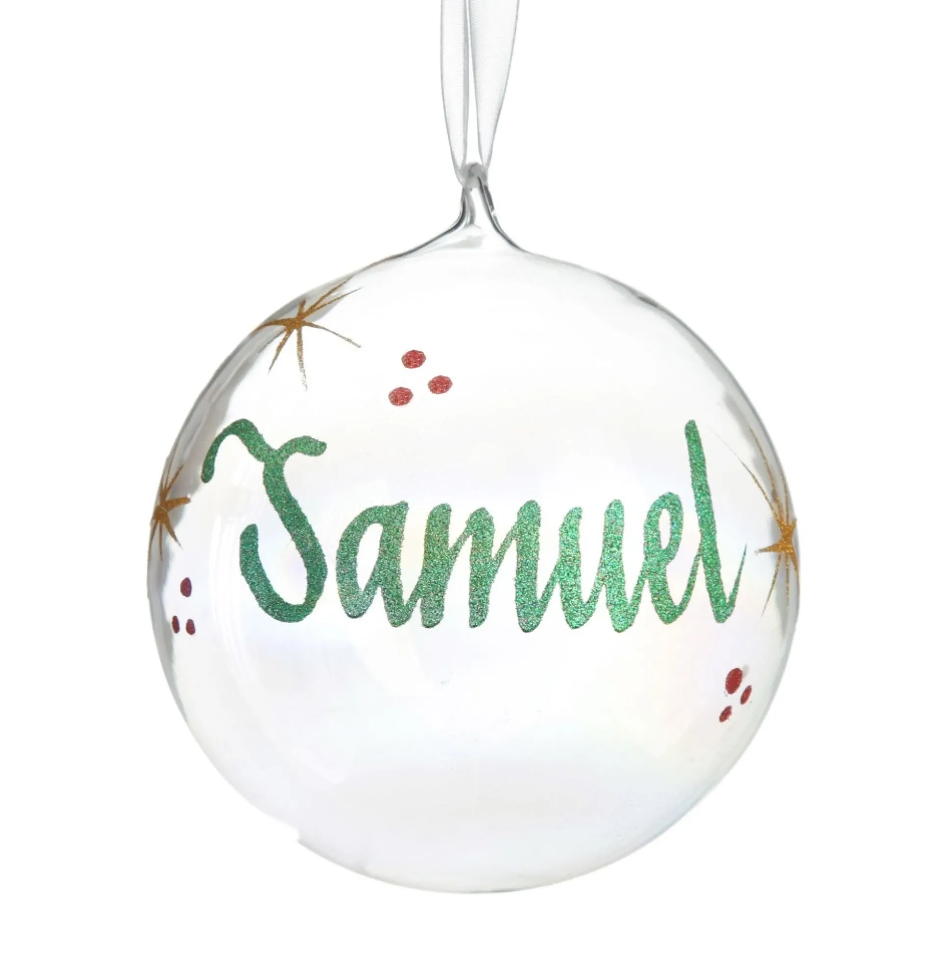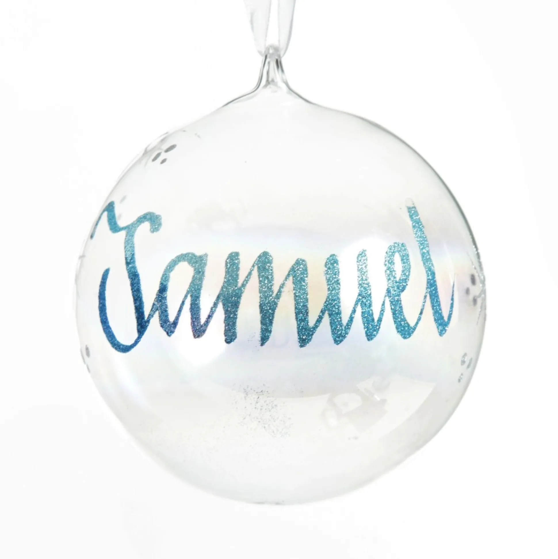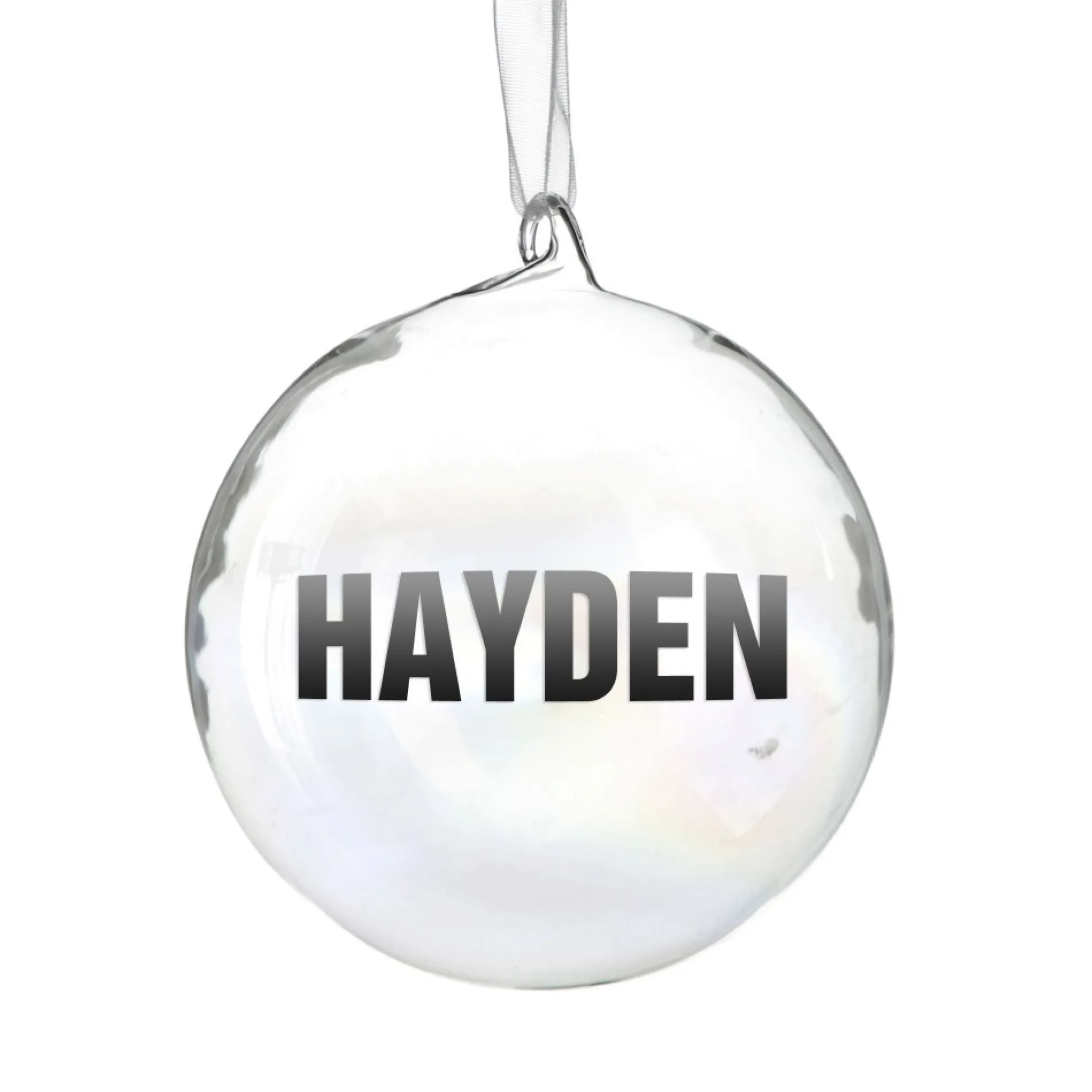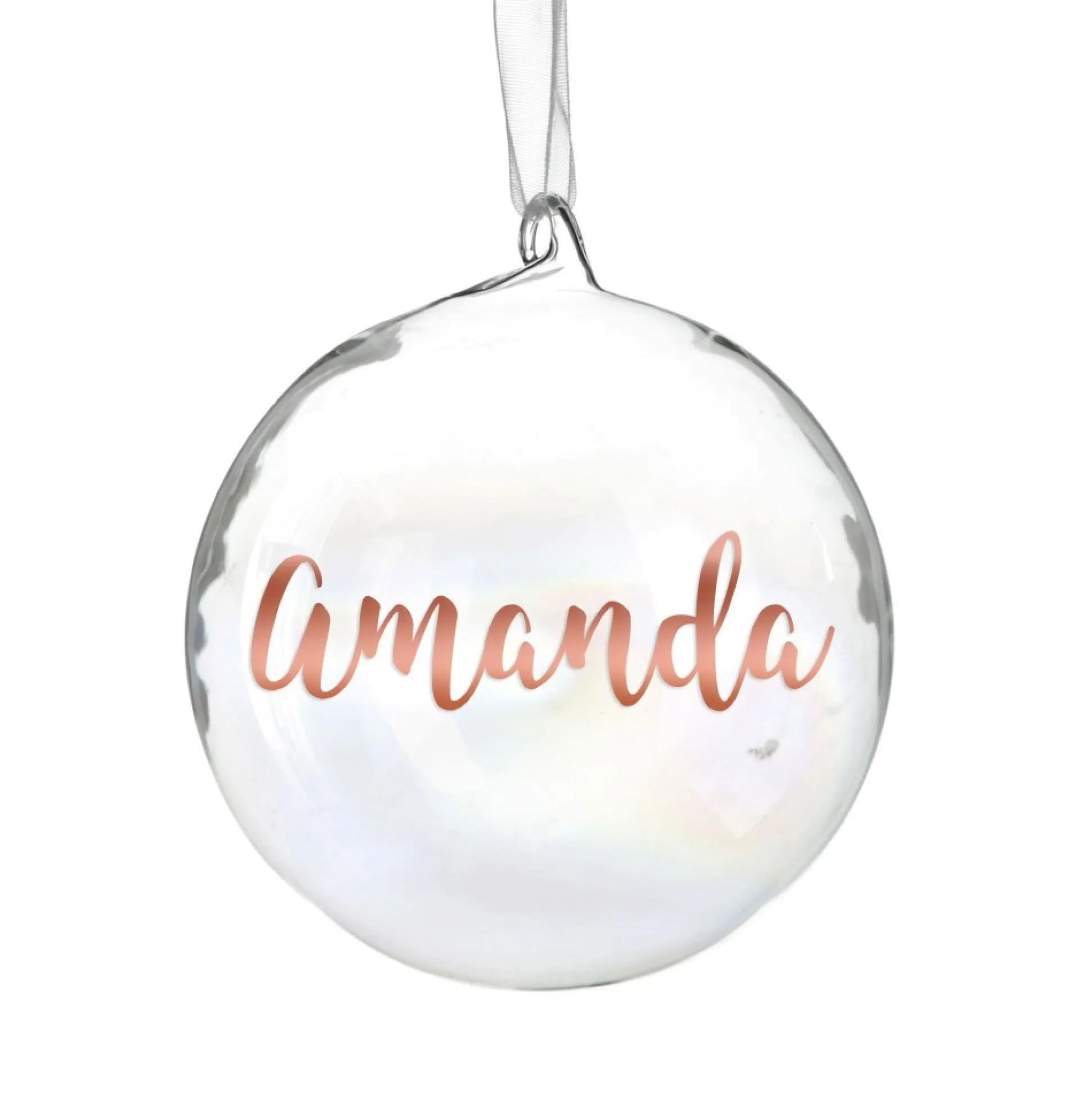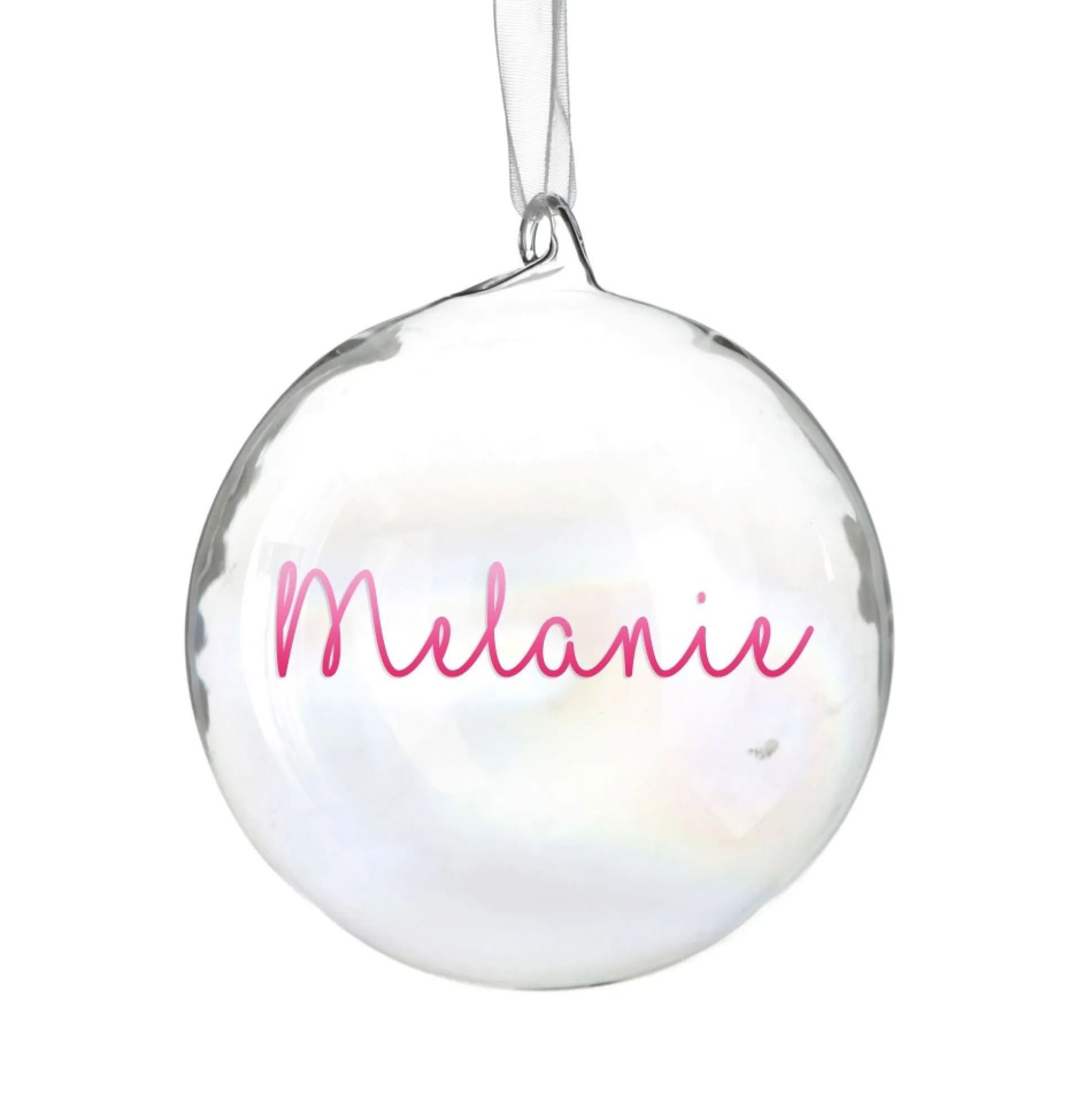 Add Some Magic To Your Home With This Personalised Iridescent Glass Christmas Bauble. Made From High-Quality Glass, Featuring A Silver Top And Elegant White Ribbon, This Bauble Is Ready To Hang On Your Christmas Tree, Or On One Of Our Display Hangers.