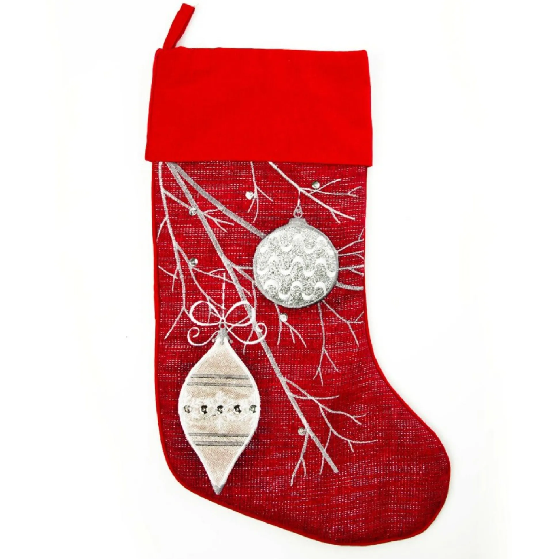 Create Wonderful Memories With This Gorgeous Personalised Red Bauble Christmas Stocking. Made From Soft Red Fabric With A Subtle Sparkle And Embroidered Details, This Stocking Features An Appliqued Red Glitter Christmas Bauble Design And Comes Ready To Hang!