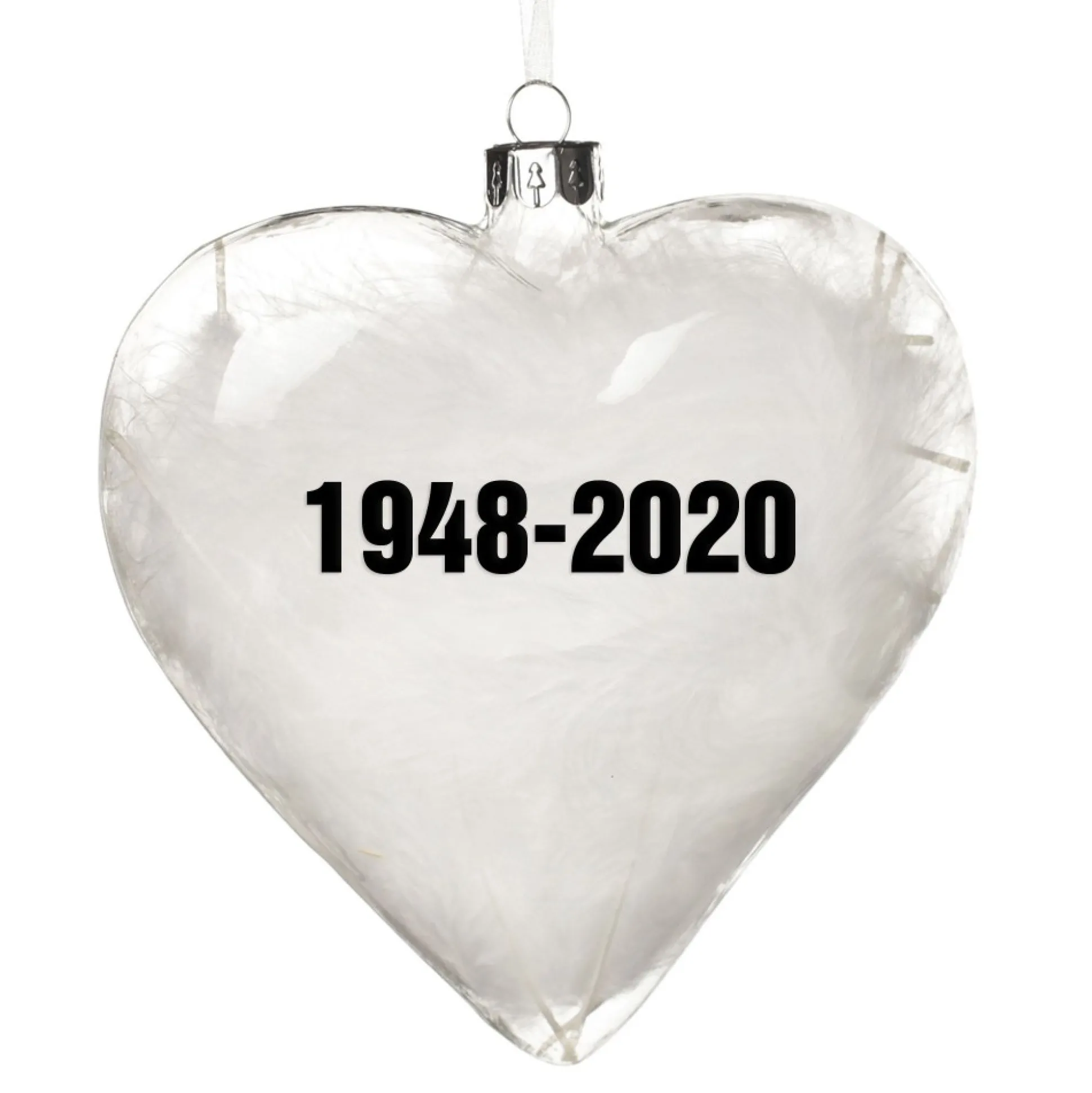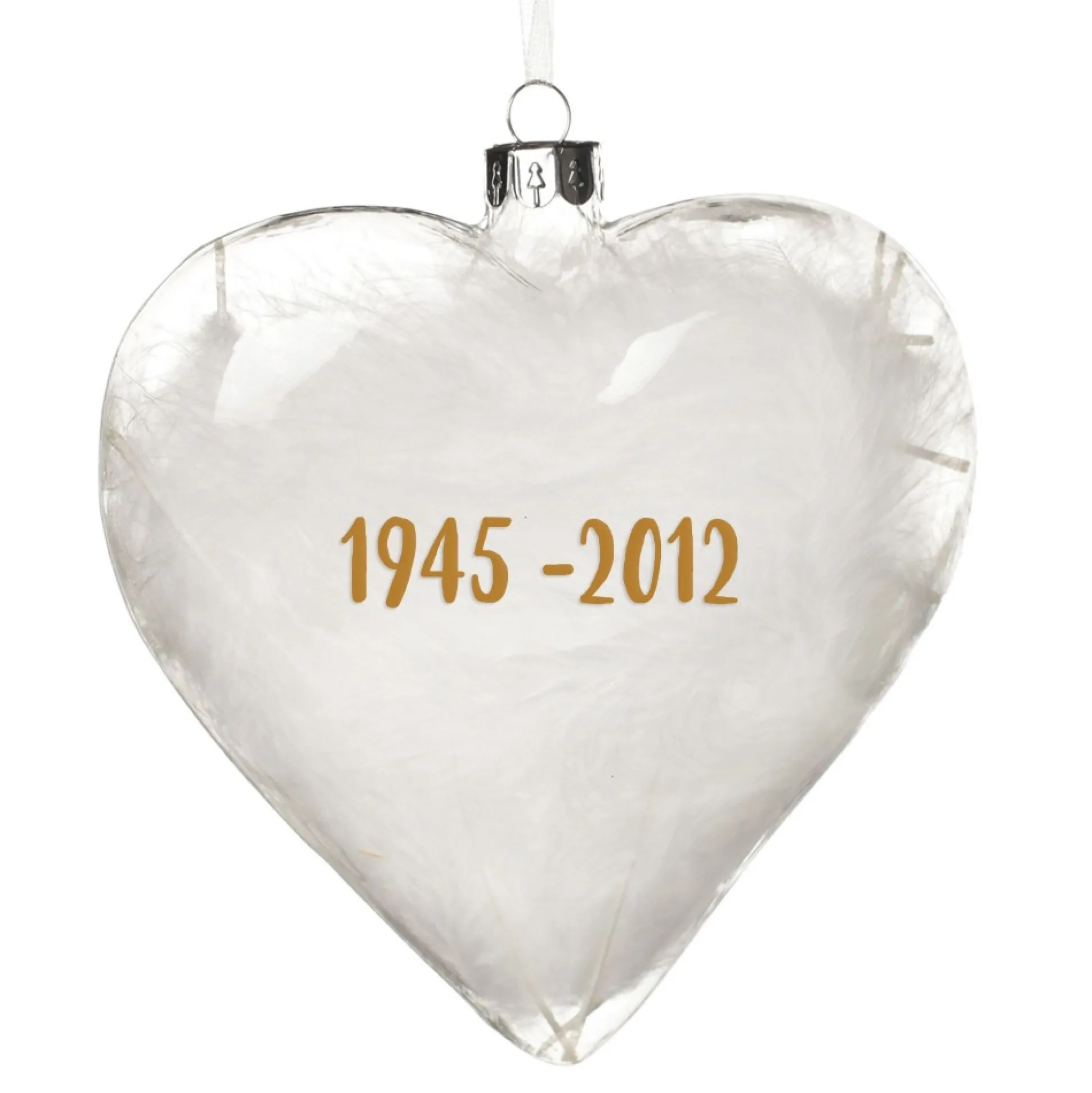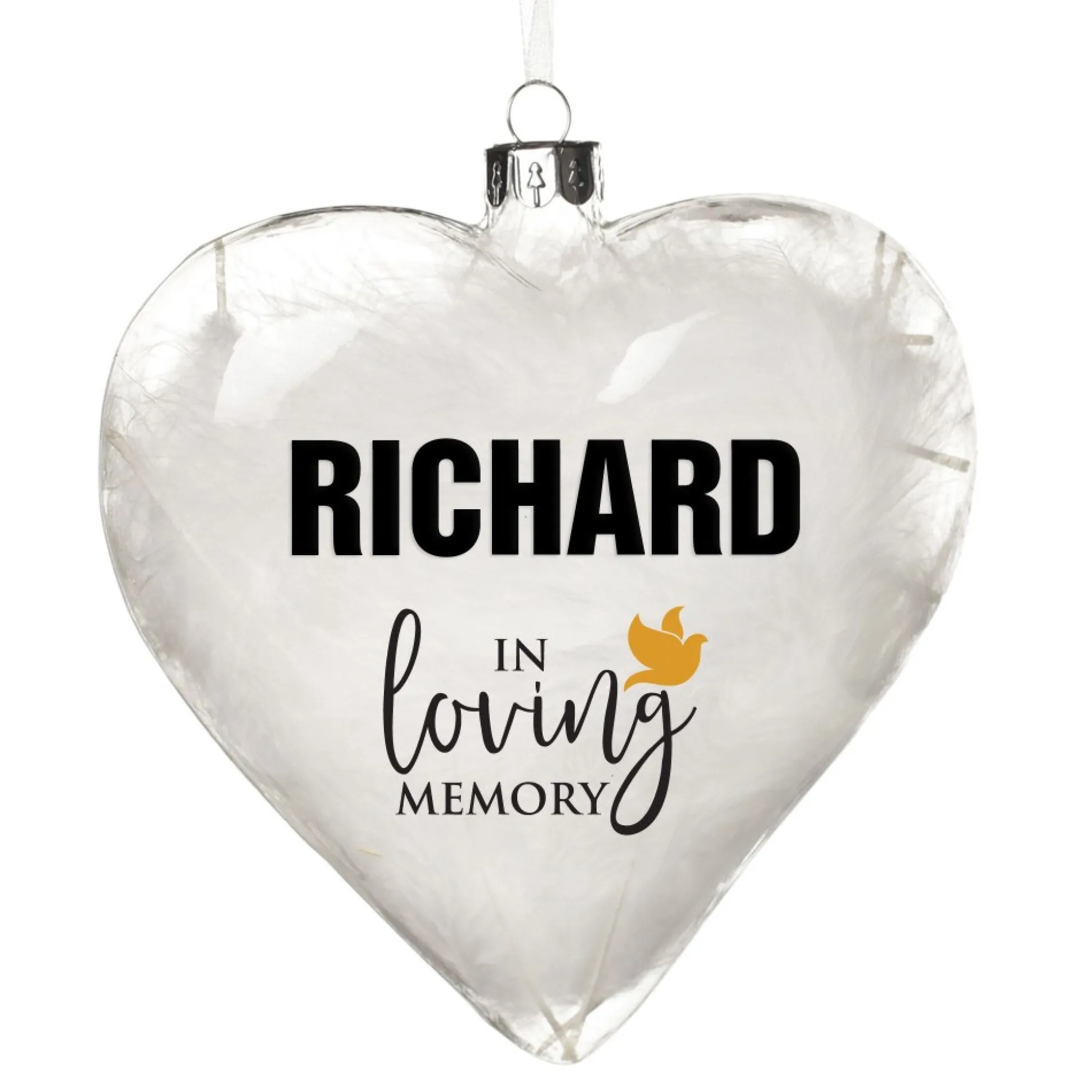 Commemorate Loved Ones With A Memorial Keepsake Ornament Using Our Personalised Glass Heart – In Loving Memory. This Clear Heart Shaped Glass Ornament Is Filled With Delicate White Feathers And Features A Decal With The Message ‘In Loving Memory’, As Well As A Name Of Your Choice In Vinyl Lettering & Personalisation Colour. This Simplistic And Elegant Design Is A Popular Choice For Those Wanting A Unique And Personal Keepsake To Honour The Life Of Loved Ones Passed. Fill Your Home With The Memory Of Those You Hold Dearest During The Christmas Season Or Display This Keepsake All Year Round To Let Their Memory Shine Bright. Keep Loved Ones In Your Heart, Mind And Home Forever With This Invaluable Keepsake.