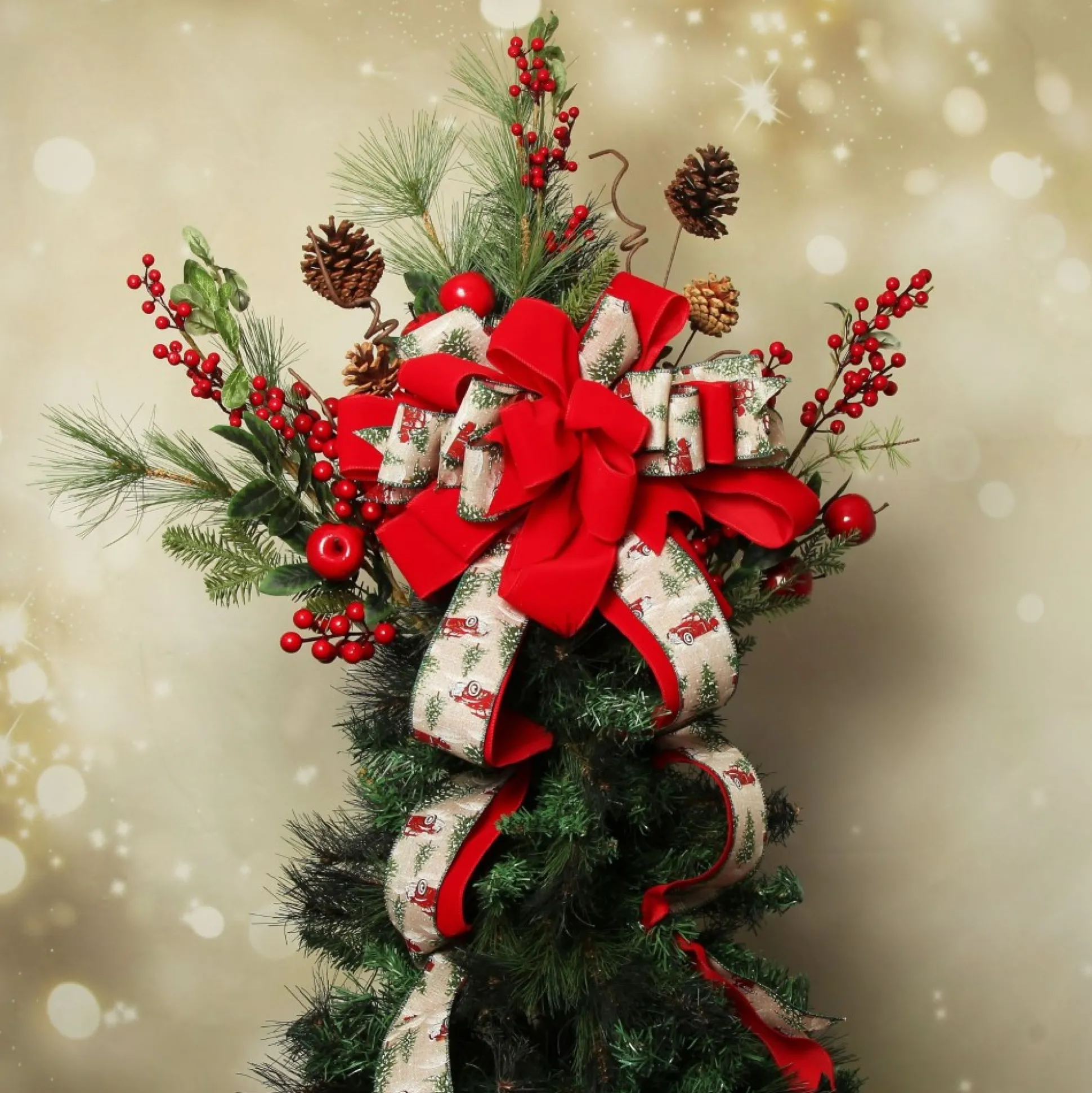 Enhance Your Festive Tree Display With This Magnificent Red Truck Deluxe Tree Topper Bow With Streamers. This One-Of-A-Kind Tree Topper Is Crafted Using A Mix Of Red Ribbon And Our Unique Red Truck And Snowy Tree Ribbon. Featuring Layered Loops And Bows To Create A Lush Effect And Ribbon ‘streamers’ Hanging From The Bottom For Added Texture. You Can Use This Unique Bow To Embellish Your Christmas Tree As A Tree Topper, To Decorate A Large Custom Wreath, Or To Decorate Any Door, Wall, Or Window In Your Home.