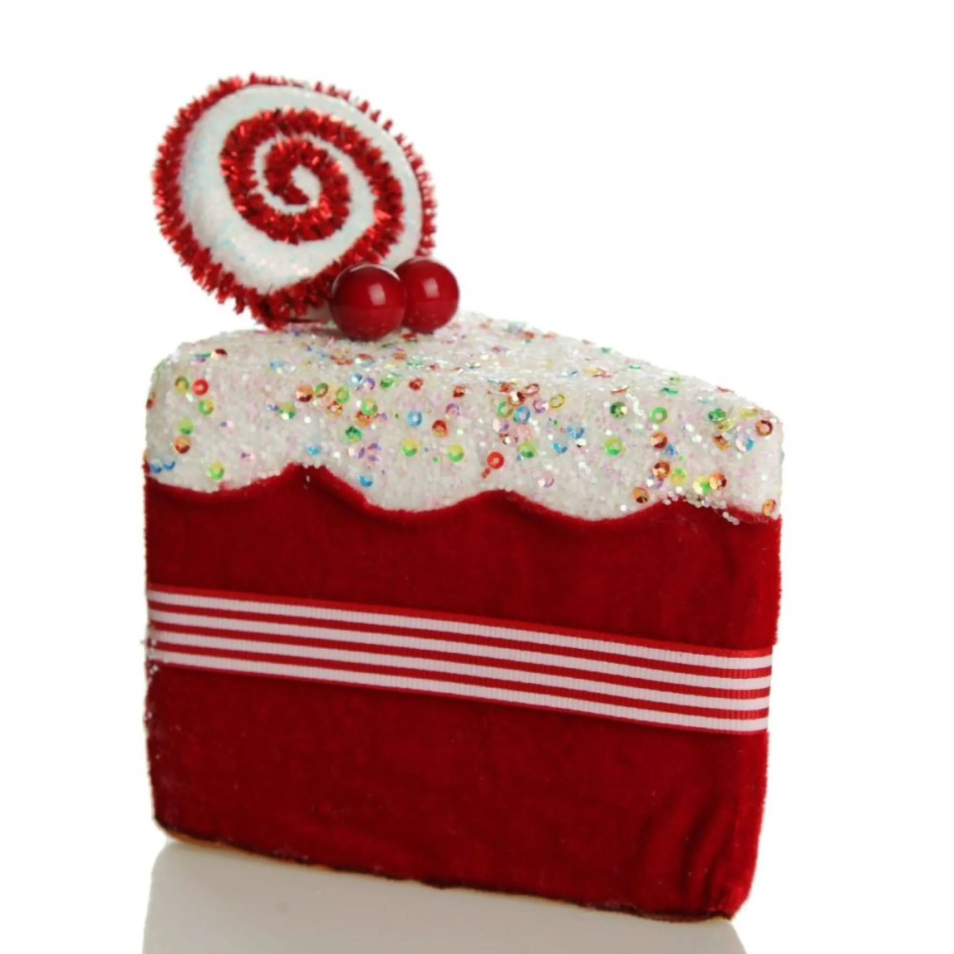 Made From A Light Yet Durable Polystyrene Base Covered With Rich Red Velvet, This Cake Slice Features Gorgeous White Glitter And Sequined Frosting, And Is Adorned With A Peppermint Swirl, Red Berries, And Striped Ribbon.