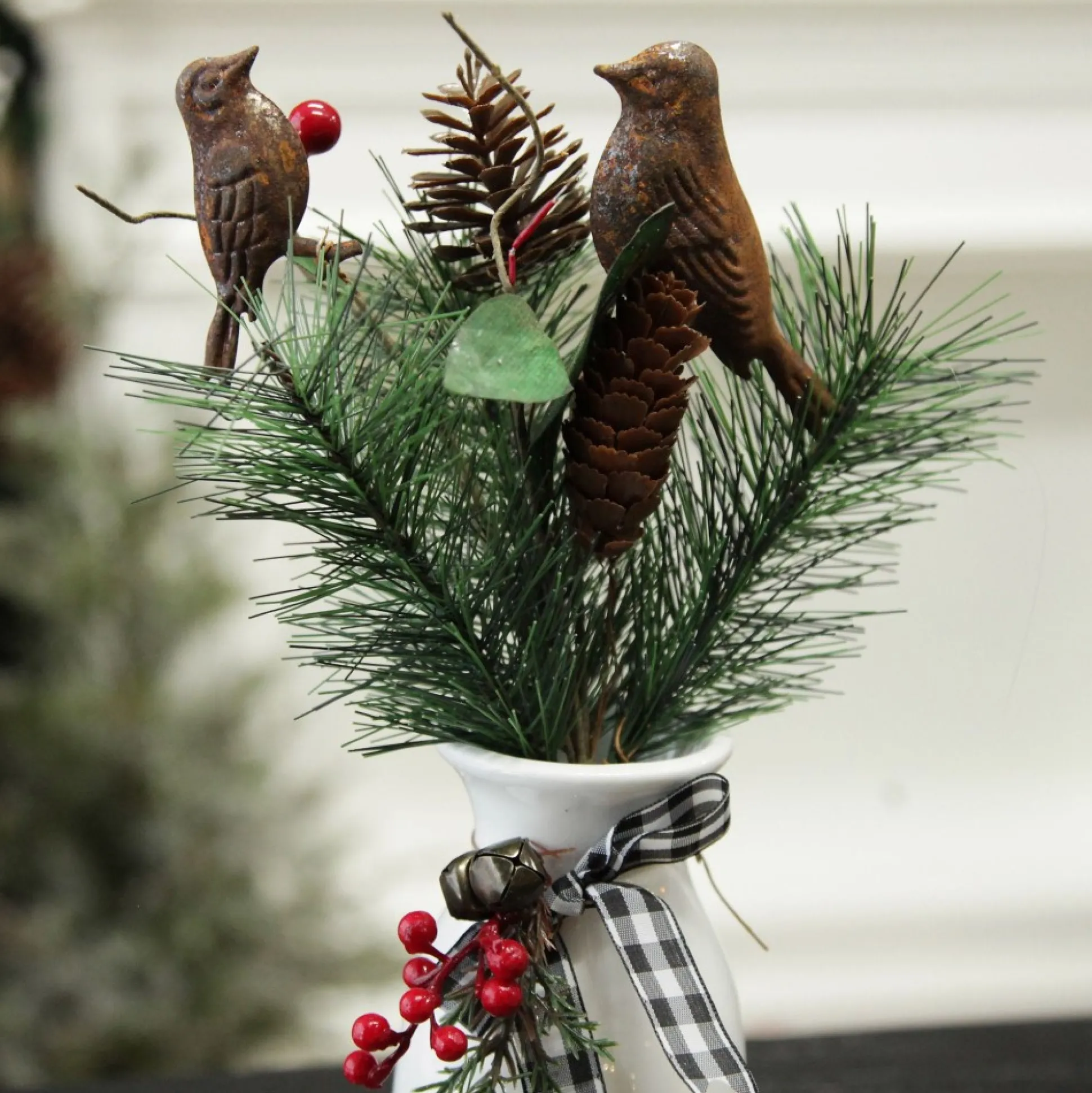 Embellish Your Christmas Tree With This Rusted Tin Bird, Pinecone And Red Berry Pick. This Pick Is A Great Choice For Your Christmas Crafting And Decorating Purposes. Crafted With A Durable Stem For Easy Placement And Securing, This Pick Features A Collection Of Greenery, Adorable, Rusted Tin Bird Cut-Outs As Well As Berries And Pinecone. A Gorgeous Rustic Decor Element To Decorate Your Home With. Use As An Exciting Decoration On Your Christmas Tree Or As An Embellishment On Custom Wreaths And Garlands. You Could Even Use This As A Unique Gift Topper For Larger Presents.