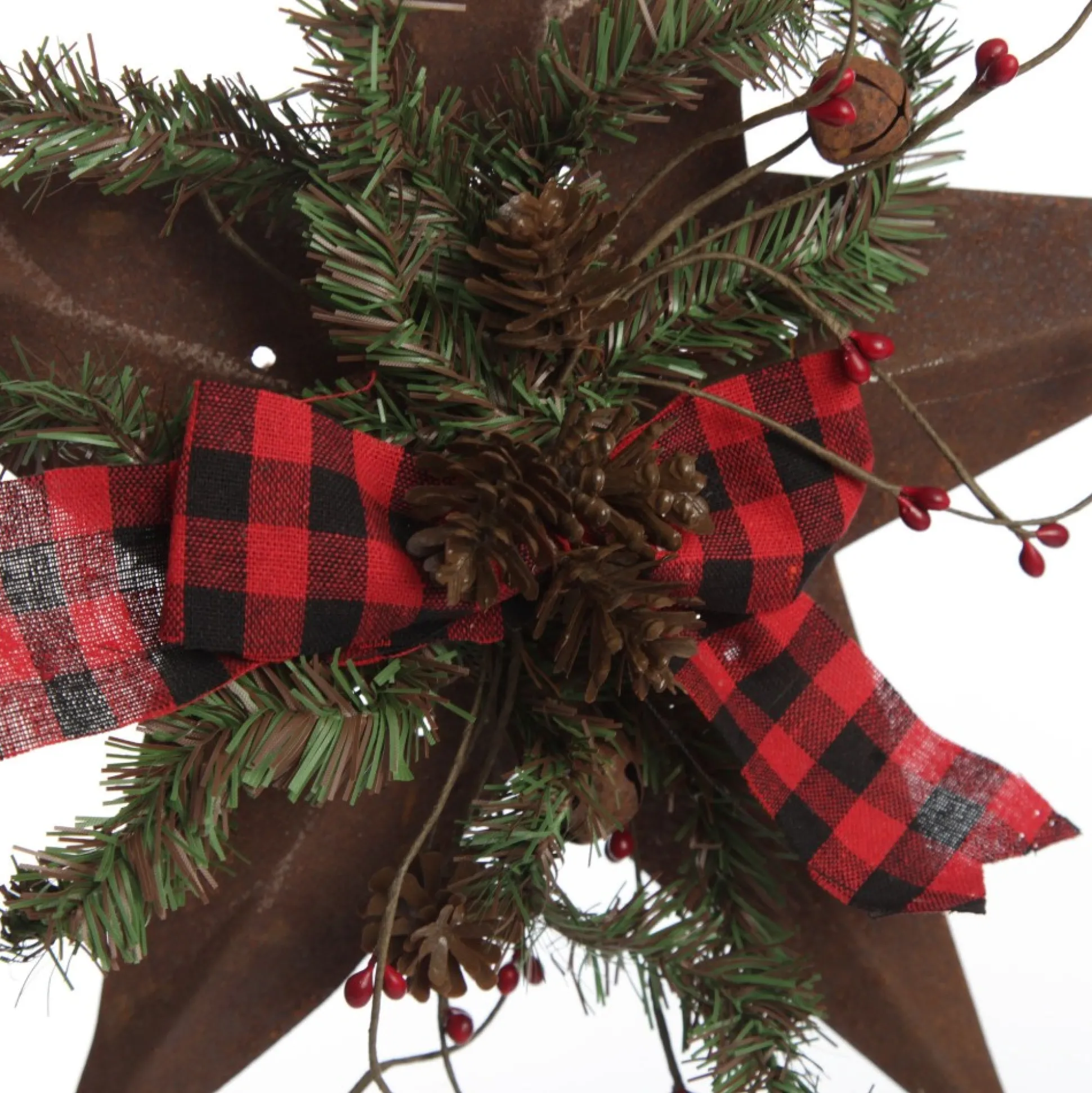 Celebrate In Style And Add Cosy Christmas Decor To Your Home With Our Rusted Tin Star Tree Topper With Buffalo Check Bow And Pine. Featuring A Rusted Tin Star With Foliage, Pinecone, And Red Berry Embellishments. A Red And Black Buffalo Check Bow Also Adorns The Star For An Extra Cosy And Rustic Farmhouse Feel.