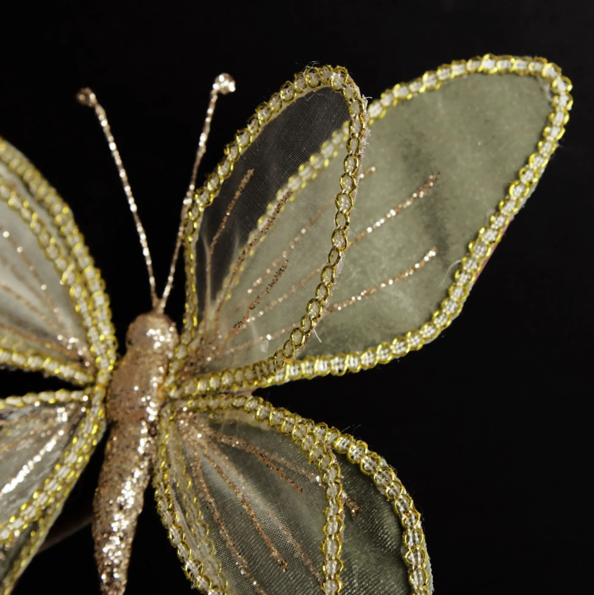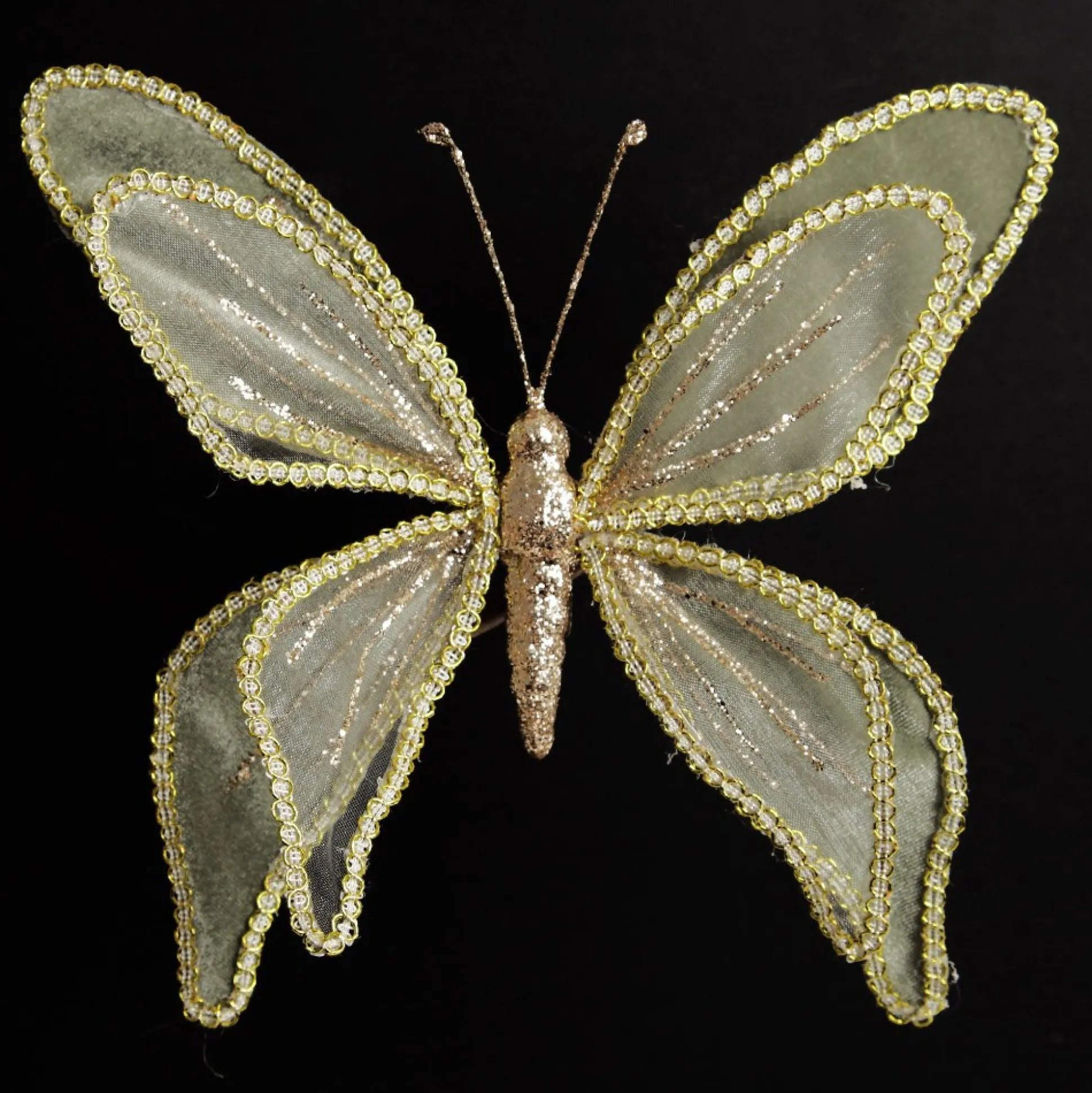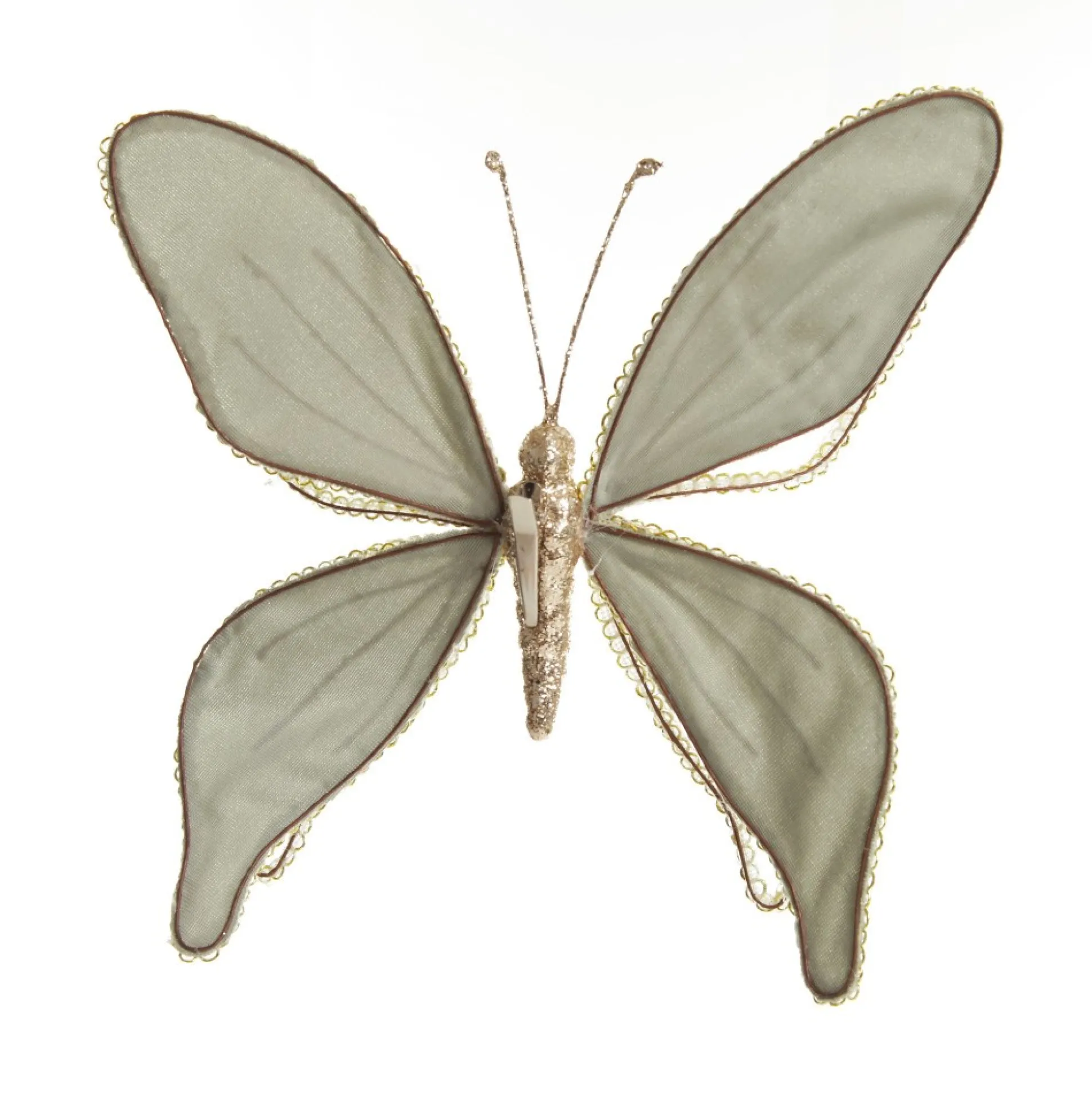 Add Elegance And Whimsy To Your Festive Decor With This Sage Green And Sequin Delicate Butterfly. Featuring Unique Double Layered Wings Made From Sage Velvet And Sheer Materials With Gold Ribbon Trim And Champagne Glitter Details. A Clip Affixed To The Back Of The Butterfly Makes It Easy To Secure When Crafting And Decorating. Decorative Clips Can Be Used For Such A Wide Range Of Craft And Decor Purposes. Use Them To Add Exciting Embellishments To Your Christmas Tree, Garlands, Wreaths And More. It Can Even Be Used As A Unique Present Topper When Gift Wrapping Or As An Embellishment For Table Place Settings At Your Christmas Day Feasts. The Butterfly Is Perfect For A Unique Pink Christmas Dreams Decor Theme Combining An Assortment Of Pink And Sage Green Tones To Create A Seamless And Sophisticated Display. Stray From The Traditional To Create A Stunning And Unique Display In Your Home.