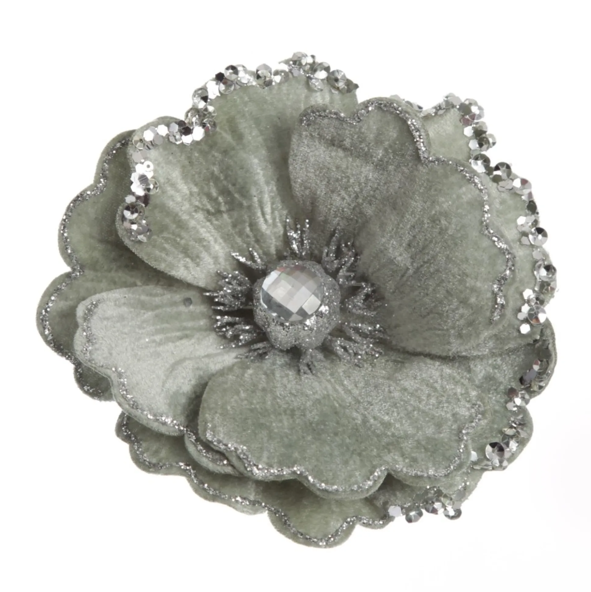 Embellish Your Christmas Displays With This Sage Velvet Magnolia Flower Clip With Jewel Centre And Sequin Tips. Featuring Layers Of Sage-Green Velvet Petals With Delightful Glitter And Sequin Tips. A Unique Jewel And Glitter Arrangement Adorns The Centre Of The Flower. Extending From The Base Of The Flower Is A Flexible Stem And Silver Slip. Perfect For All Your Christmas Crafting And Decorating Needs. Simply Clip This Flower To Your Christmas Tree, Garlands, And Wreaths To Add An Exciting Embellishment. The Smaller Size Of This Flower Also Makes It Perfect To Use As A Unique Addition To Your Gift Wrapping Or As A Lovely Table Setting Embellishment For Your Christmas Day Feast. This Flower Would Suit A Unique Silver & Sage Christmas Decor Theme Perfectly. Pair With Sleek Silver And Soothing Sage Tones To Create An Elegant And Delightful Display.